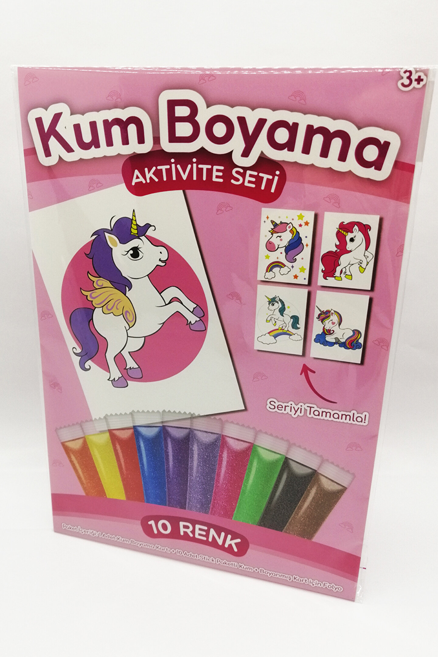 3 yaş ve üzeri çocuklar için ideal, eğlenceli ve eğitici bir aktivite seti; Renkli ve canlı pembe kanatlı unicorn tasarımı ile çocukların ilgisini çeker; Kum boyama aktivitesi sayesinde çocuklar, yaratıcılıklarını ve motor becerilerini geliştirirken eğlenirler; Ebeveynler için de kolay temizlenebilir ve güvenli bir oyun seçeneği sunar;