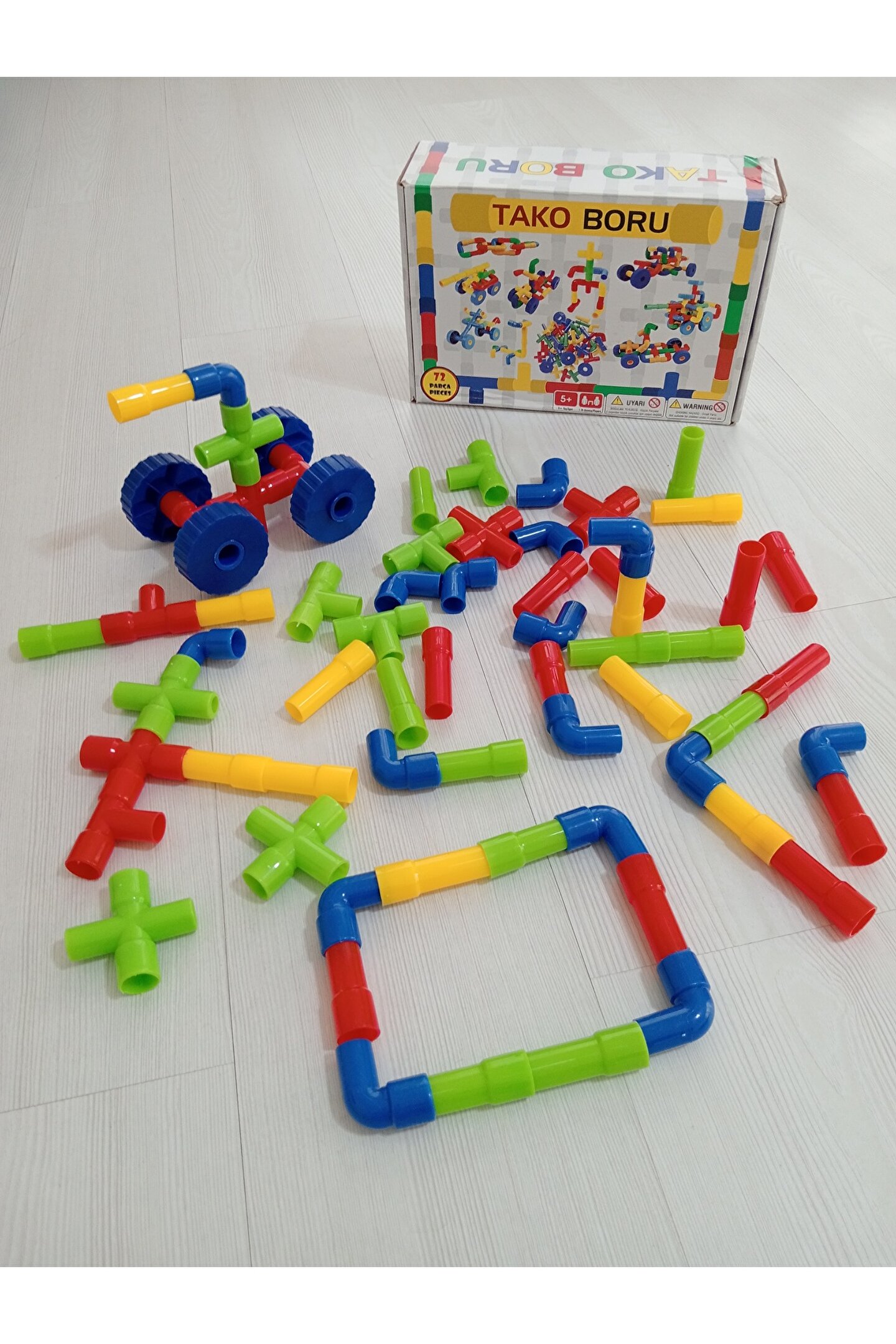 TAKO BORU OYUNU 72 PARÇATako Boru Oyunu, 3 yaş ve üzeri çocuklar için uygun bir üründür ve 72 parçadan oluşmaktadır. İçeriğinde 4 farklı renk ve 4 farklı şekilde tasarlanmış parçalar bulunur. Bu borular, birbirine geçebilir ve çocuklar tarafından binlerce farklı şekilde birleştirilerek kullanılabilir.Oyun setinin içinde yer alan tekerlekler, çocuklara farklı yapılar oluşturma ve tasarım yapma konusunda özgürlük sunar. Bu sayede çocuklar, hayal güçlerini kullanarak kendi yaratıcı projelerini geliştirebilirler. Tako Boru Oyunu, çocukların el becerilerini, problem çözme yeteneklerini ve yaratıcılıklarını desteklemek amacıyla tasarlanmış eğlenceli bir oyundur.Ayrıca, oyunun parçalarının renk ve şekil çeşitliliği, çocukların görsel algılarını ve renk eşleştirme yeteneklerini geliştirmelerine katkı sağlar. Tako Boru Oyunu, çocukların motor becerilerini, el-göz koordinasyonunu ve mantıksal düşünme yeteneklerini güçlendirmeyi amaçlayan interaktif bir oyun deneyimi sunar.Bu eğlenceli ve eğitici oyunda, çocuklar hem bir araya getirdikleri parçalarla yeni nesneler oluşturabilir hem de oyun sırasında problem çözme yeteneklerini geliştirirken keyifli vakit geçirebilirler. Tako Boru Oyunu, çocukların öğrenmeyi keşfetmeleri ve kendi yaratıcılıklarını sergilemeleri için bir platform sunar.Paket İçeriği1 kutu tako boru oyunu 72 parça