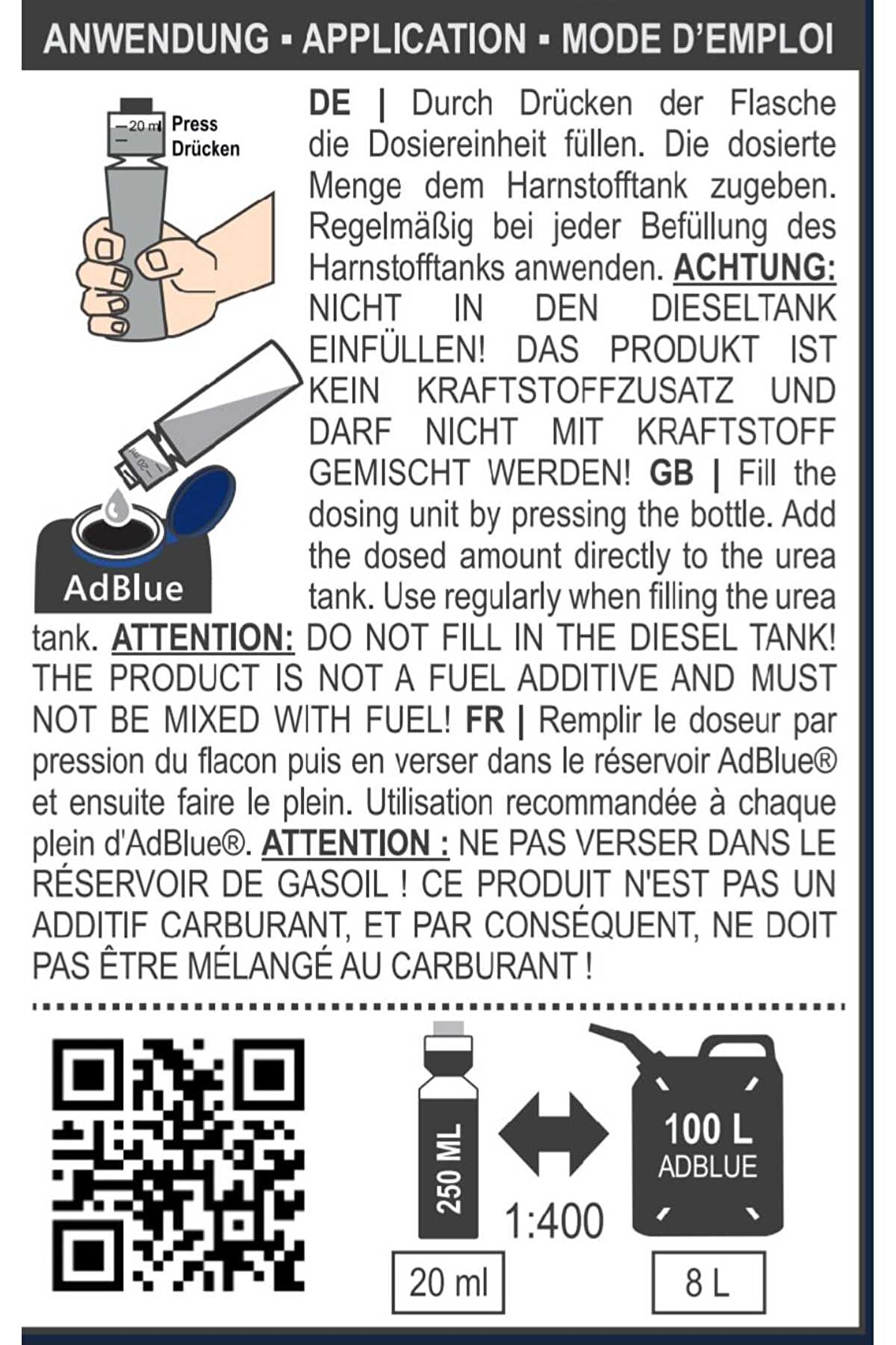 250 ml ürün 100 litre AdBlue® sıvısı ile karışıma uygundur