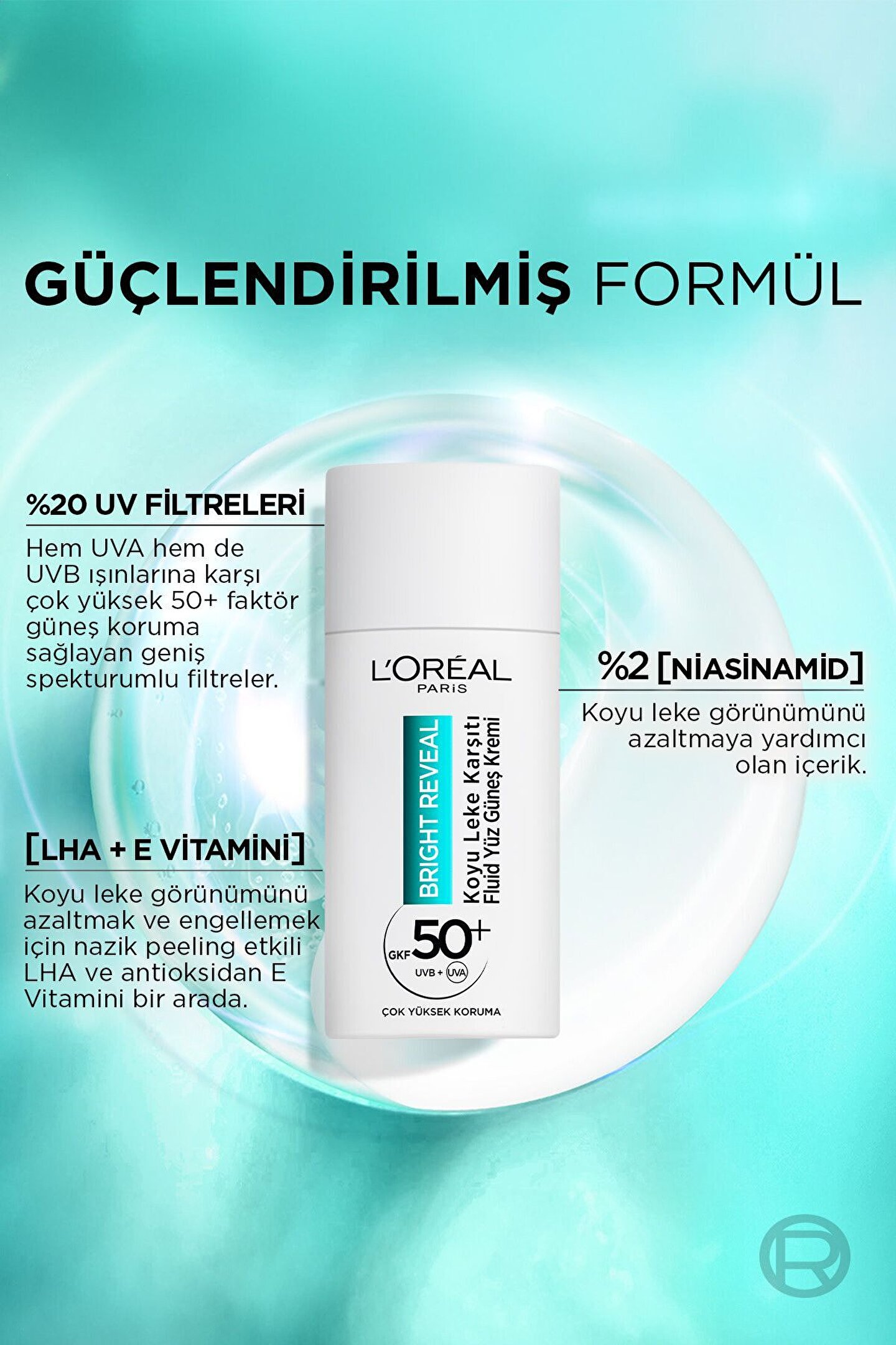 L'oréal Paris Bright Reveal Spf 50+ Koyu Leke Karşıtı Fluid Günlük Yüz Güneş Kremi 50ML BRIGHT REVEAL SPF 50+ KOYU LEKE KARŞITI FLUID GÜNLÜK YÜZ GÜNEŞ KREMI 50ML GÜNLÜK UV KORUMASI KOYU LEKE KARŞITI BAKIMIN TEMEL ADIMIDIR Dermatologlar yaşanma belirtilerinin ve koyu leke görünümünü engellemek için cildinizi her gün korumanız öneriliyor.; ÇOK YÜKSEK UV KORUMAMIZ KOYU LEKE KARŞITI UZMAN İÇERİKLER İLE BİRLEŞTİ %20 UV FİLTRELERİ Hem UVA hem de UVB ışınlarına karşı çok yüksek 50+ faktör güneş koruma sağlayan geniş spektrumlu filtreler.; Yaşlanma belirtilerinin ve koyu lekelerin görünümünü engellemeye yardımcı olur.; %2 NİASİNAMİD Koyu leke görünümünü azaltmaya yardımcı olan aydınlatıcı içerik.; LHA + E VİTAMİNİ Koyu leke görünümünü azaltmak ve engellemek için nazik peeling etkili LHA ve antioksidan E vitamini bir arada.; KLİNİK OLARAK KANITLANMIŞ ETKİ CİLDİ KORUR, KOYU LEKE GÖRÜNÜMÜNÜ ENGELLER VE GÖZLE GÖRÜLÜR ŞEKİLDE GÖRÜNÜMÜNÜ AZALTIR -%53 KOYU LEKELER* +%43 PARLAKLIK* -%38 İNCE ÇİZGİLER* İLK KULLANIMDA Cilt nem kazanır ve anında daha aydınlık & parlak görünür.; 1 AYDA Koyu lekelerin görünümünü gözle görülür şekilde azalır.; Cilt tonu daha eşit ve cilt daha genç görünür.; *Klinik test, 12 hafta, 76 kişi GÜNLÜK KULLANIMA UYGUN HAFİF LİKİT DOKU Beyaz iz bırakmaz, tüm cilt tonlarında görünmez bitiş.; Ultra hafif doku, yağlı his bırakmaz, yapışkan his bırakmaz.; Hassas ciltler için uygundur.