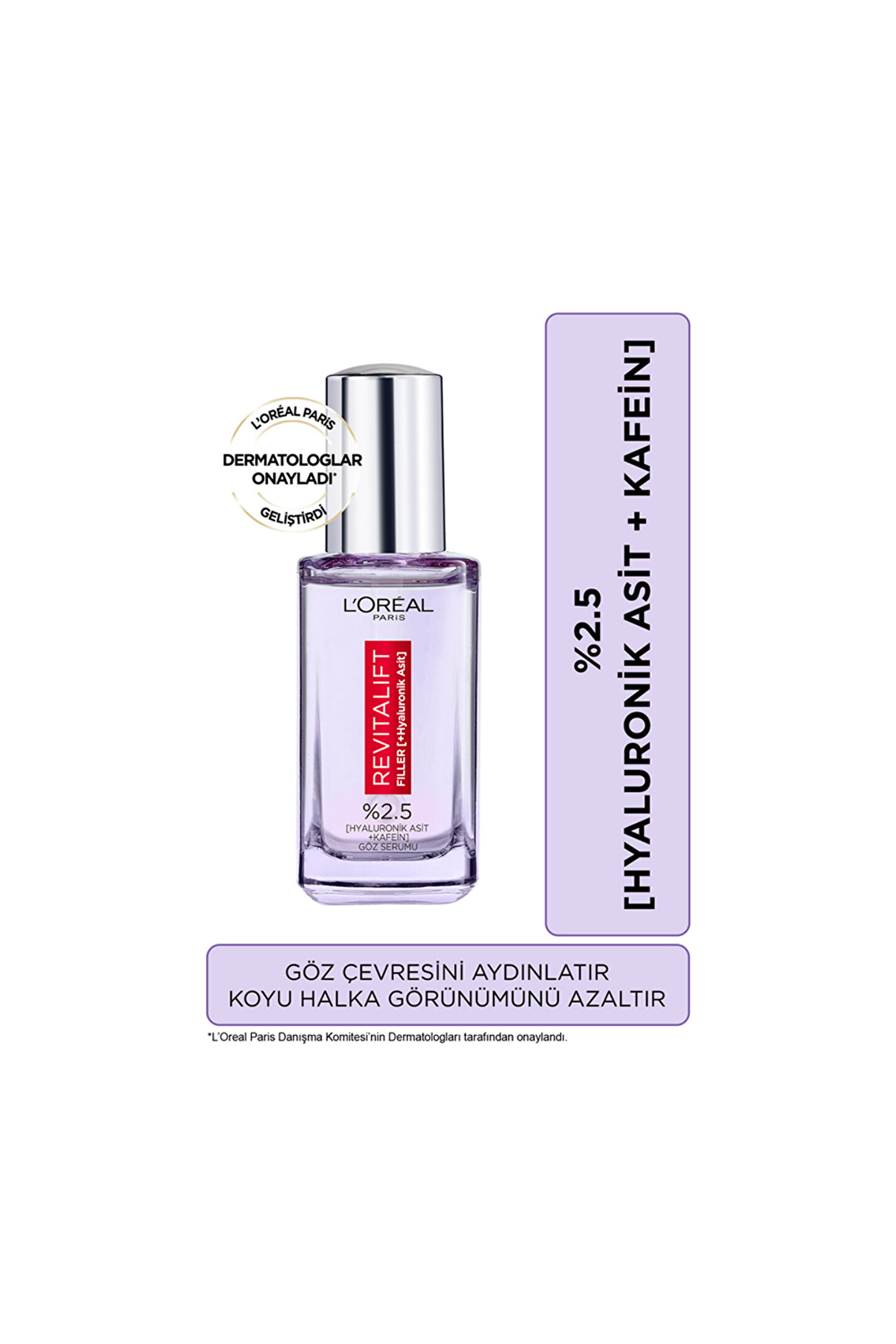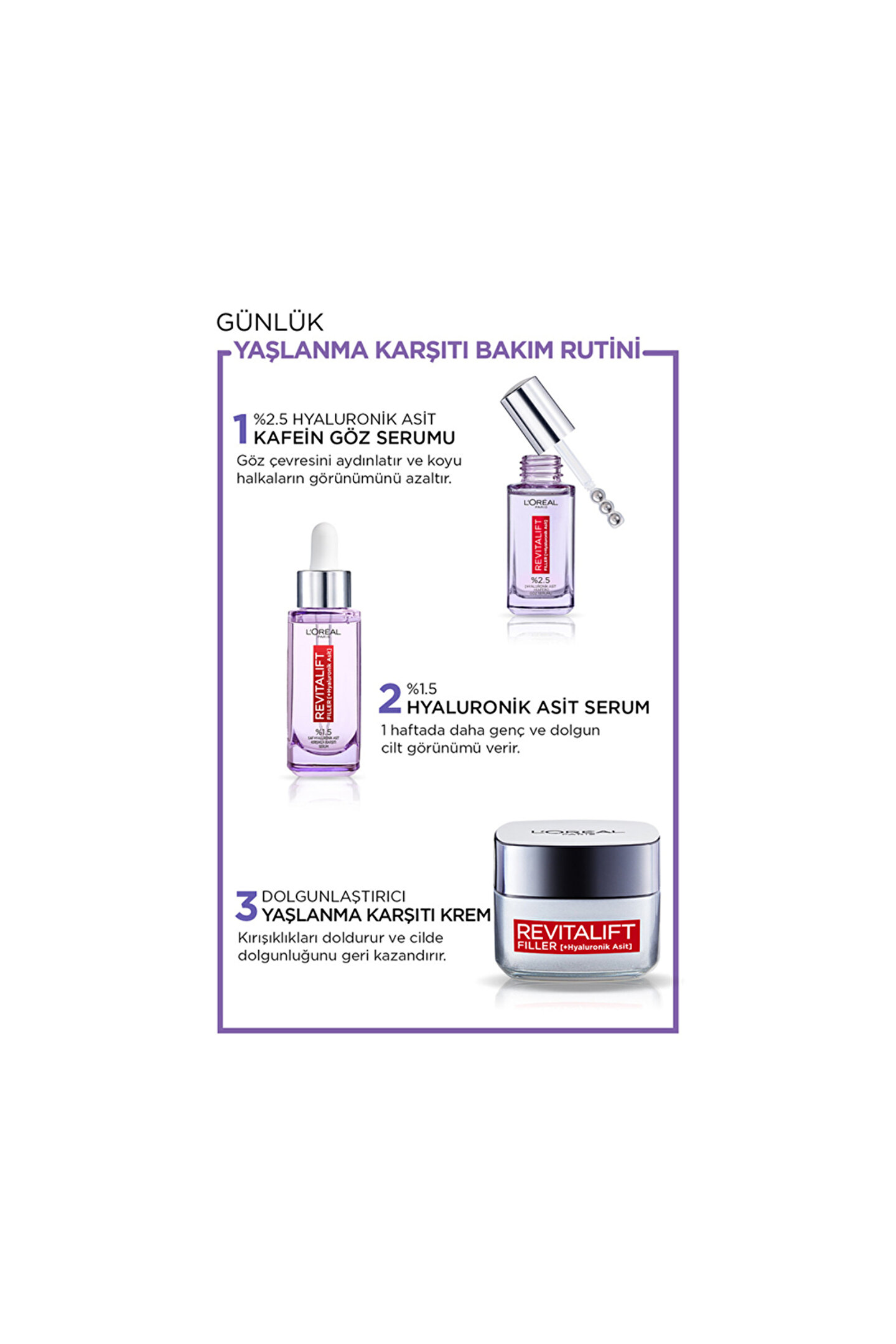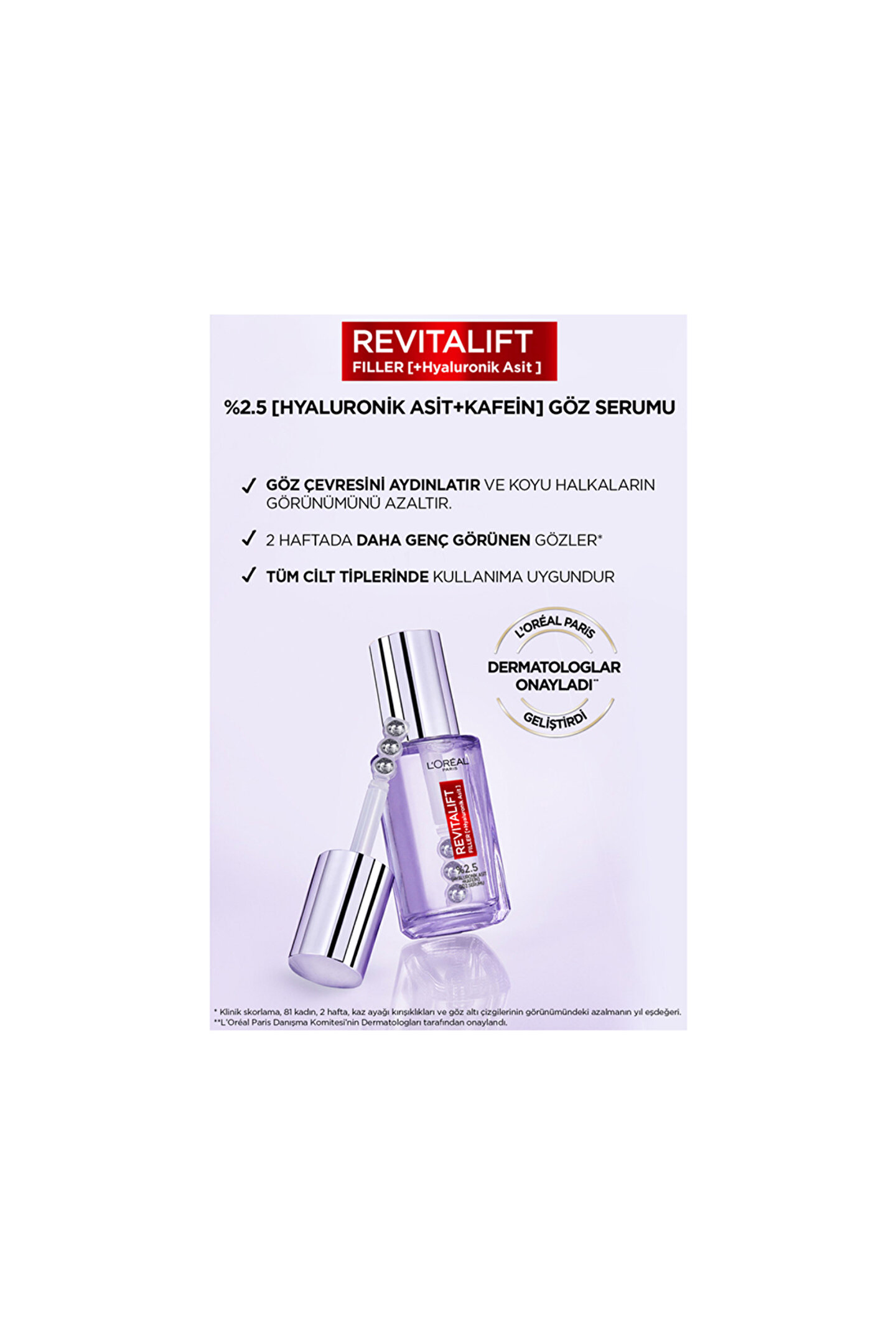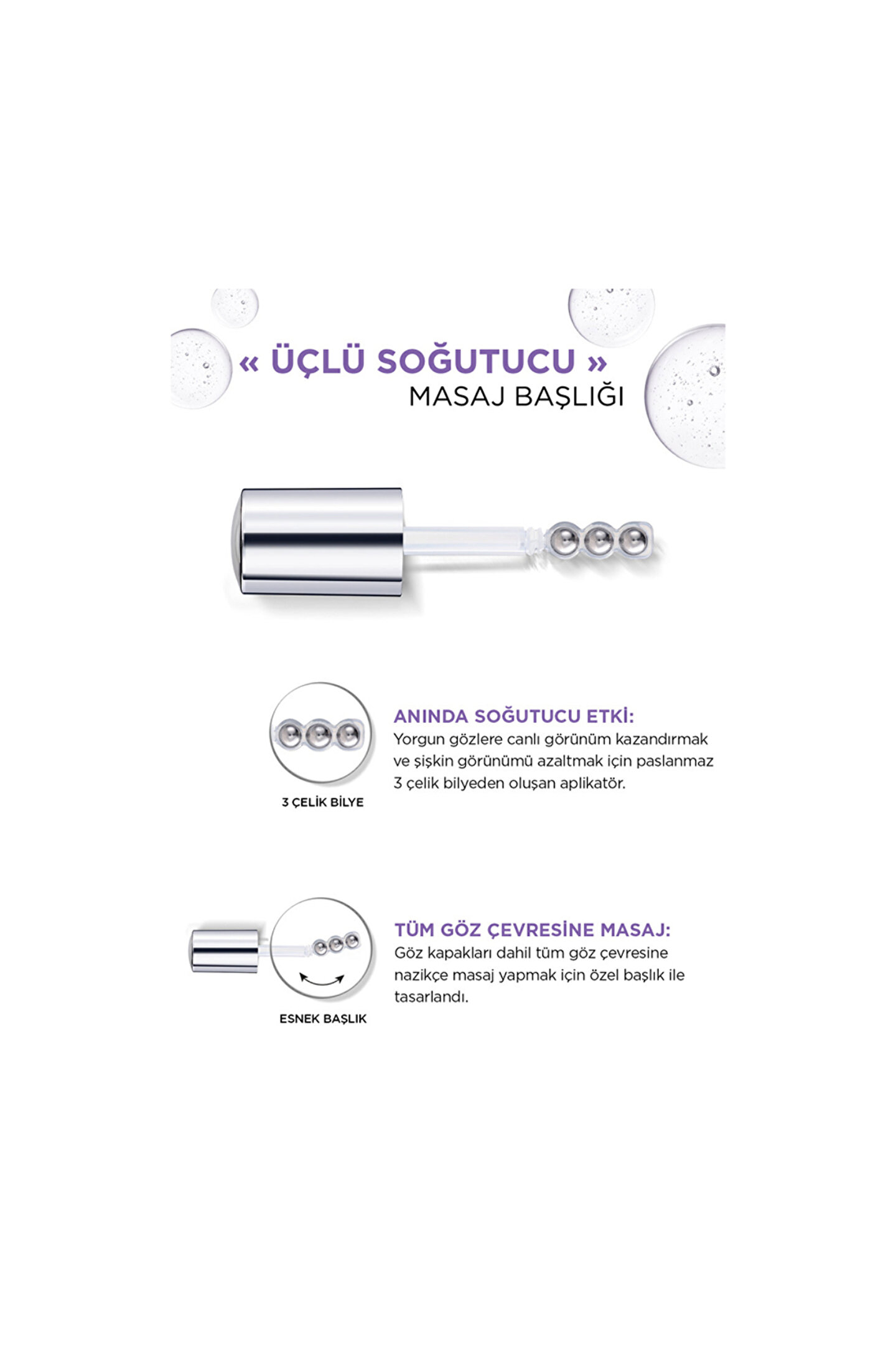 <p><strong>GÖZLERE ÖZEL İLK SERUMUMUZ</strong> <br> Göz çevresi çizgilerini dolgunlaştırmak ve koyu halka görünümünü azaltmak için <strong>en yüksek </strong> <strong>Hyaluronik Asit ve Kafein konsantrasyonumuz.</strong> <strong><br></strong><strong>SAF HYALURONİK ASİT: </strong>Göz çevresini nemlendirmeye ve en ince çizgiler dahil tüm çizgileri doldurmaya yardımcı olur.<br><strong>SAF KAFEİN: </strong>Koyu halkaları ve şişkinlik görünümünü azaltmak için cilde yeniden enerji vermeye yardımcı olur. <br><strong>NİASİNAMİD + VİTAMİN CG: </strong>Cilt aydınlatma etkisini arttırmaya yardımcı olur.<br> <br> <br> <br> <strong>YENİLİKÇİ ÜÇLÜ MASAJ BAŞLIĞI</strong> <strong><br></strong> <strong>TÜM GÖZ ÇEVRESINE MASAJ: </strong>Göz kapakları dahil tüm göz çevresine nazikçe masaj yapmak için özel başlık ile tasarlandı. <br> ANINDA SOĞUTUCU ETKİ: Yorgun gözlere canlı görünüm kazandırmak ve şişkin görünümü azaltmak için paslanmaz 3 çelik bilyeden olusan aplikatör. <br> <br> <br> <strong>GÖZLER SADECE 2 HAFTADA 5 YIL DAHA GENÇ GÖRÜNÜR*</strong> <strong><br></strong> <strong>Anında:</strong> Cilt nemlenmiş, göz çevresi rahatlamıs hissedilir. <br> <strong>2 Haftada:</strong> Göz çevresindeki kırışıklıkların ve koyu halkaların görünümü azalır. <br> <strong>6 Haftada:</strong> Göz çevresindeki ince çizgilerin görünümü %21 azalır.** O kadar etkili ki, deneyen kadınların %92'si önerdi.** <br> <br> <br> <em>*Klinik skorlama, 81 kadın, 2 hafta, kaz ayağı kırışıklıkları ve göz altı</em> <em>çizgilerinin görünümündeki azalmanın yıl eşdeğeri.</em> <em>** Klinik çalışma, 81 kadın, 2 & 6 hafta.</em></p>