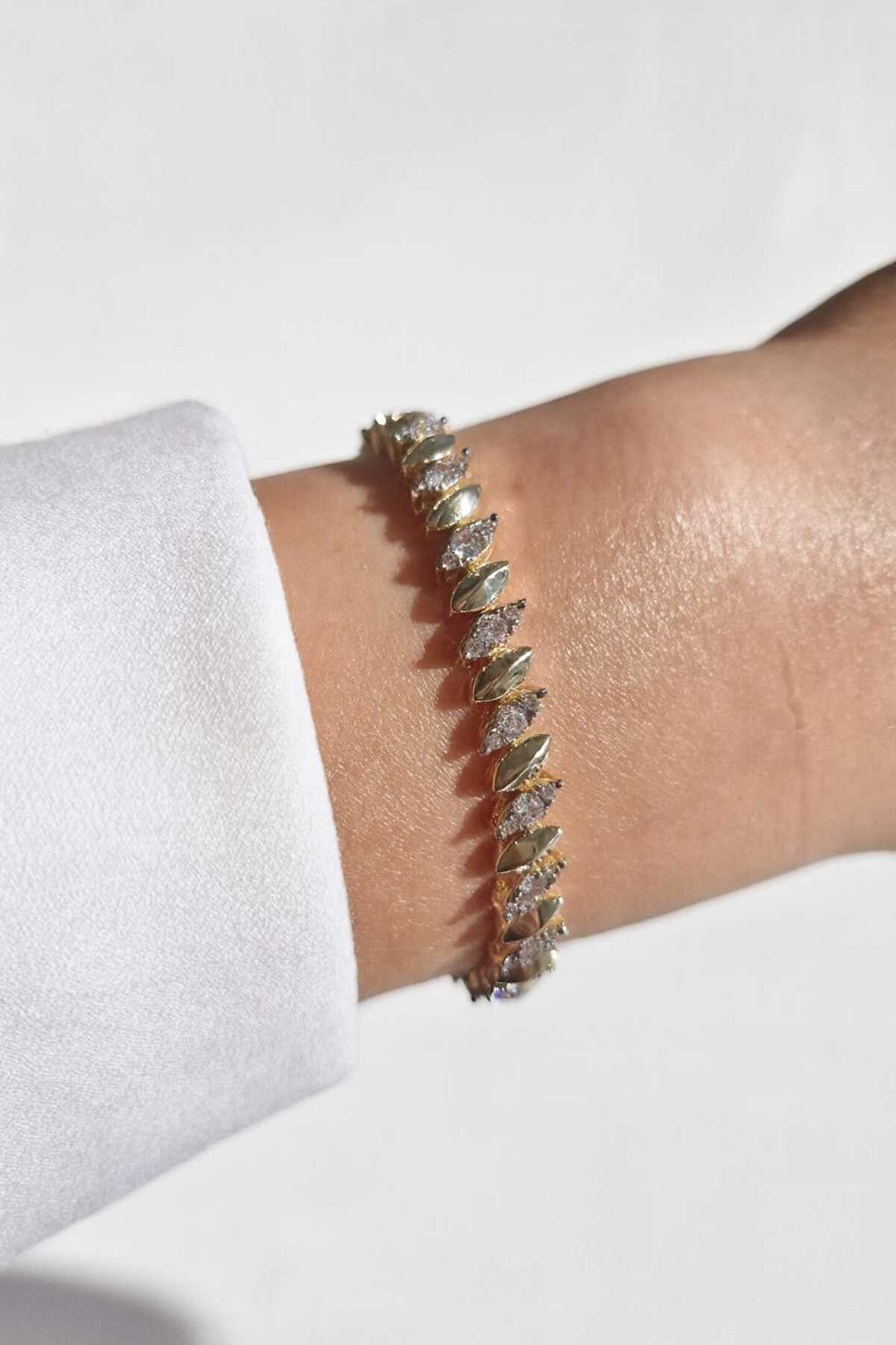 Yüksek kalite 316L paslanmaz çelik üzerine 14K gold kaplama ile üretilmiştir.; Tasarımda kullanılan özenle yerleştirilmiş zirkon taşlar, pırlanta ışıltısını andıran kusursuz bir parlaklık sunar.; Sıralı taş dizilimi, bileğe zarif bir duruş kazandırır.; İnce formu sayesinde hem günlük kullanıma hem de özel davet kombinlerine kolayca uyum sağlar.; Dayanıklı menteşe ve klips sistemi sayesinde güvenli kullanım sunar.; Hassas ciltlerde dahi konforlu bir kullanım sağlar.;