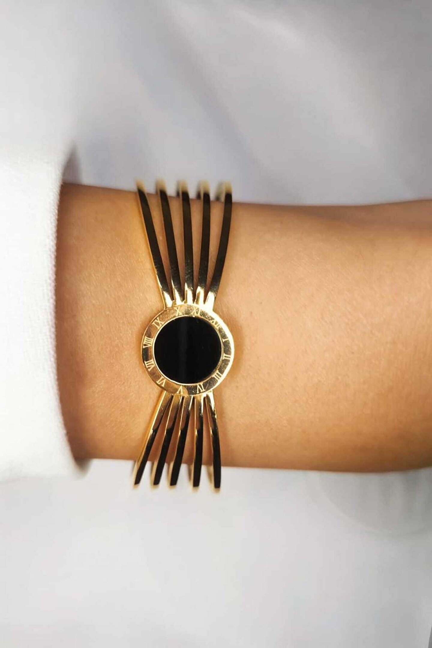 316L Paslanmaz çelikten üretilmiştir.; Zarif ve modern tasarımıyla dikkat çeken bu altın ton kelepçe bileklik, ortasında yer alan siyah yuvarlak taş ve Roma rakamlı halka detayıyla şıklığa sofistike bir dokunuş katıyor.; Geniş şeritli formu sayesinde bilekte güçlü bir duruş sergilerken, minimalist tasarımı sayesinde günlük hayatta ve özel günlerde rahatlıkla kullanılabilir.; Paslanmaz çelik yapısı sayesinde uzun ömürlüdür, kararma ve renk atma yapmaz.;