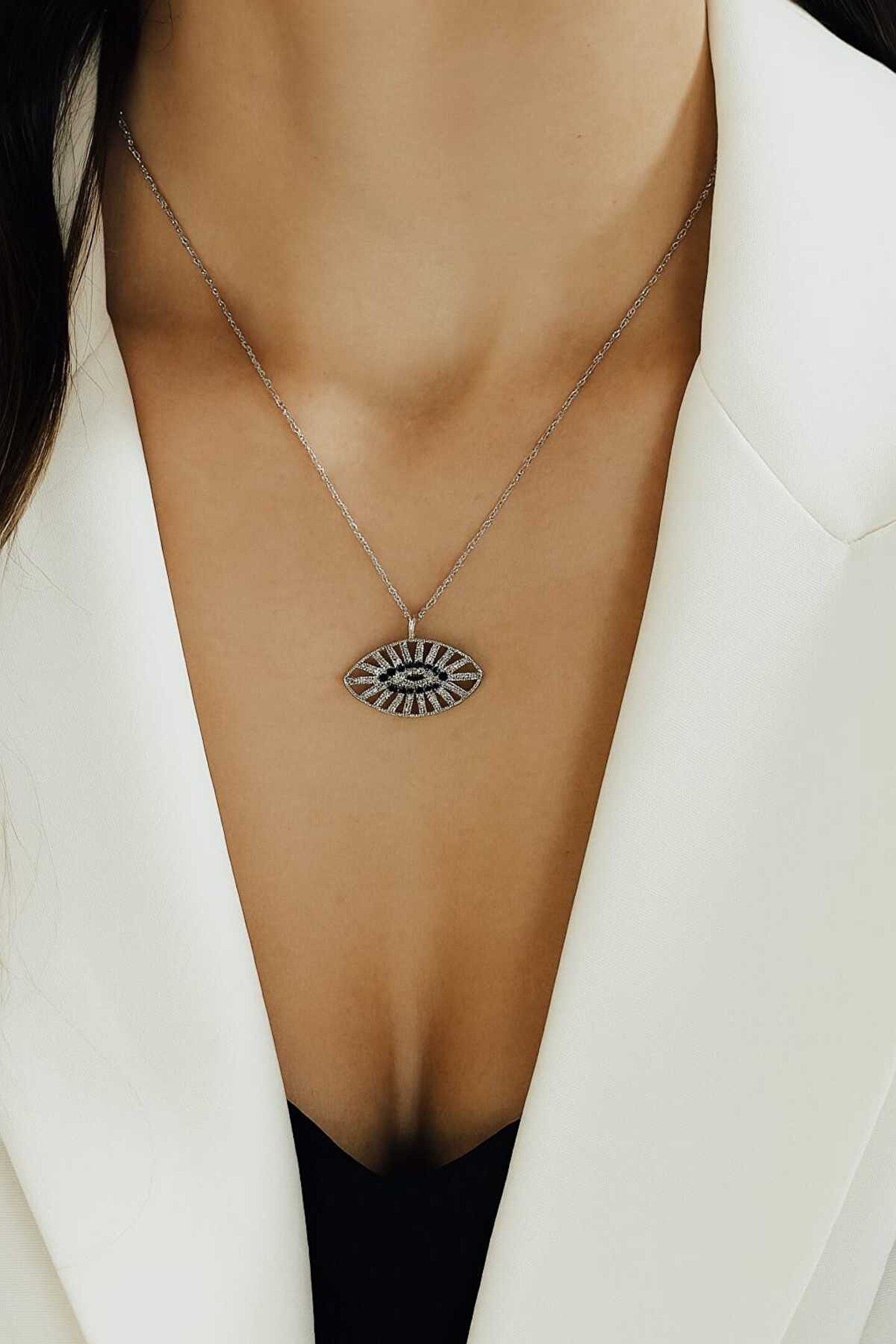 316L Paslanmaz çelikten üretilmiştir.; ; Uzun süre kullanılabilir, kararma yapmaz.; ; Hassas ciltler için uygundur.; ; Göz ( nazar boncuğu veya göz sembolü ) tasarımlı ışıltılı kolye ucuna sahiptir.; ; Beyaz ve lacivert zirkon taşların birleşiminden oluşan kolye, şık ve zarif bir görüntü sunacaktır.; ; Göz figürü, genellikle koruyucu, nazardan sakınma ve şans getirme anlamı taşır.; ; Özel bir bakım gerektirmez.; ;