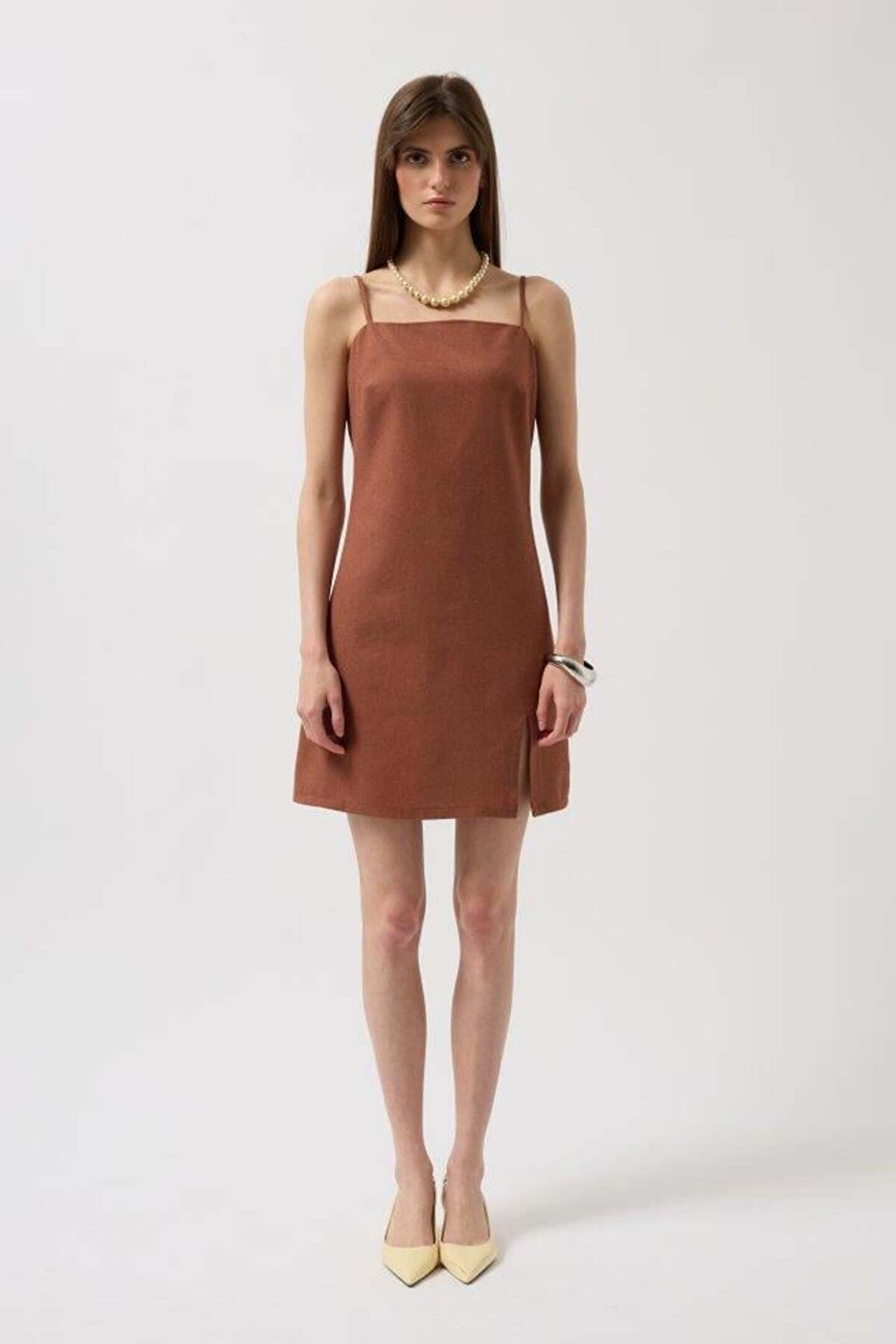 Lady Moss İp Askılı Yırtmaç Detay Keten Mini Elbise