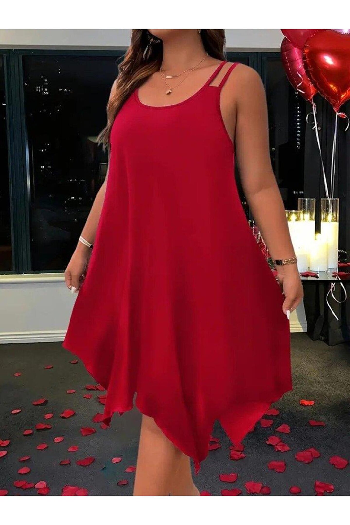Kadın Askılı Yuvarlak Asimetrik Kesim Detaylı Viskon Elbise