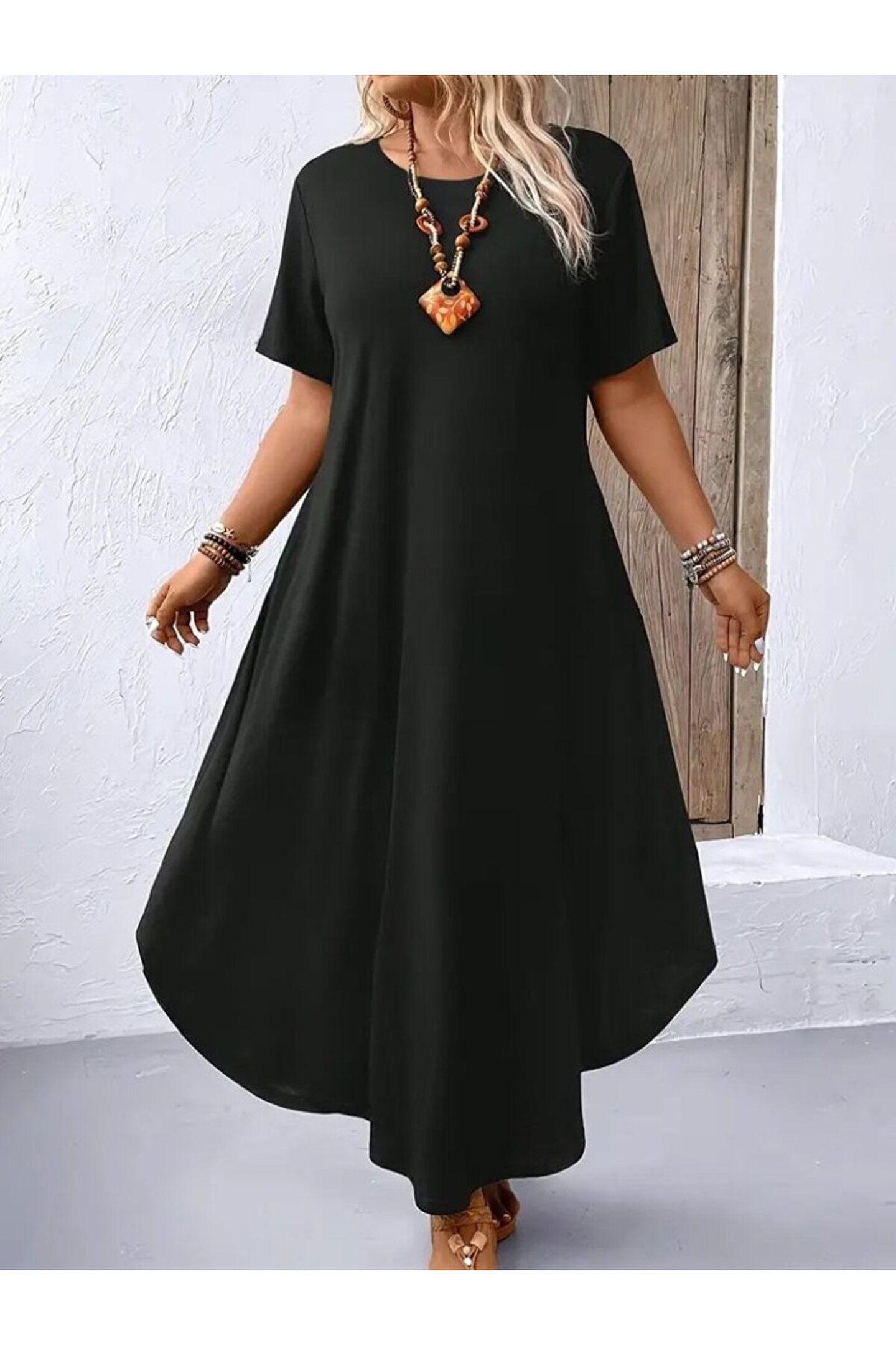 Kadın Kısa Kollu Bisiklet Yaka Cepli Salaş Viskon Elbise