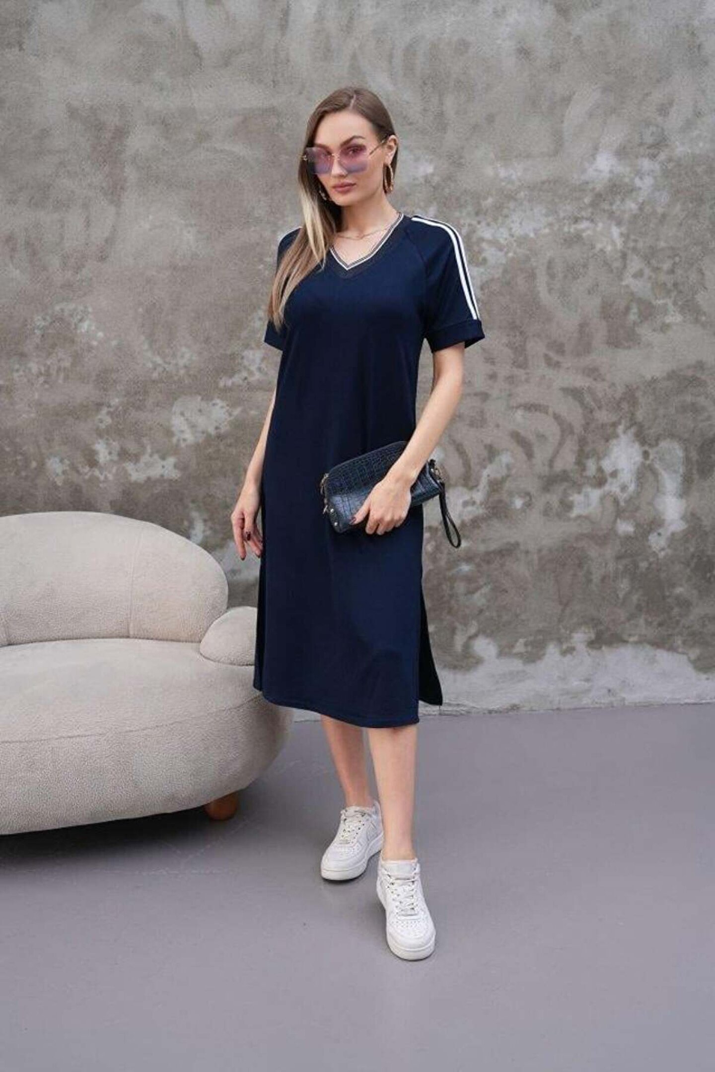 Modelin Ölçüleri: Boy:165, Kg:55, Göğüs:90, Bel:72, Kalça: 100 Modelin üzerindeki ürün M/38 bedendir Trendleri belirleyen kadın giyim markası velmorafashion'a hoşgeldiniz! VelmoraFashion, kadınların tarzlarını ifade etmelerine ve güçlü bir duruş sergilemelerine olanak tanıyan bir markadır.; 2018 yılından bu yana sektörde varlığını sürdüren firmamız, yenilikçi tasarımları ve kaliteli ürünleriyle dikkat çekiyor.; VelmoraFashion olarak amacımız, her kadının kendine özgü tarzını yansıtabileceği, güvenilir ve şık giyim seçenekleri sunmaktır.; Koleksiyonlarımızda her zevke hitap eden parçaları bulabilirsiniz.; Günlük hayatta rahatlıkla tercih edilebilecek şık elbiselerden iş görüşmelerinde stilinizi tamamlayacak takım elbiselere, spor giyimden abiye modellere kadar geniş bir ürün yelpazemiz bulunmaktadır.; Tasarımlarımızı oluştururken moda trendlerini yakından takip ediyor, farklı tarzlara ve bedenlere uygun seçenekler sunmaya özen gösteriyoruz.; Aynı zamanda kalite ve dayanıklılık da önceliklerimiz arasındadır.; Her parça, titizlikle seçilen kumaşlar ve dikkatle işlenen detaylarla özenle üretilmektedir.; Müşteri memnuniyeti bizim için en önemli önceliktir.; Profesyonel müşteri hizmetleri ekibimiz, her adımda size yardımcı olmak ve alışveriş deneyiminizi en üst düzeye çıkarmak için buradadır.; Siz değerli müşterilerimizin geri bildirimleri, bizi daha da ileriye taşımak için önemli bir kaynaktır.; Velmora Fashion olarak, sadece giyimde değil, aynı zamanda kadınların güçlendirilmesi ve kendilerini ifade etmeleri konusunda da bir misyon taşıyoruz.; Her kadının kendi tarzını keşfetmesine ve kendine güvenle adım atmasına yardımcı olmak için buradayız.; VELMORAFAShion'da her detayı düşünülmüş, şıklığı ve rahatlığı bir arada sunan parçalarla dolu koleksiyonlarımızı keşfetmek için sizi mağazamıza bekliyoruz.; Siz de ailemize katılın ve tarzınızı keşfedin!