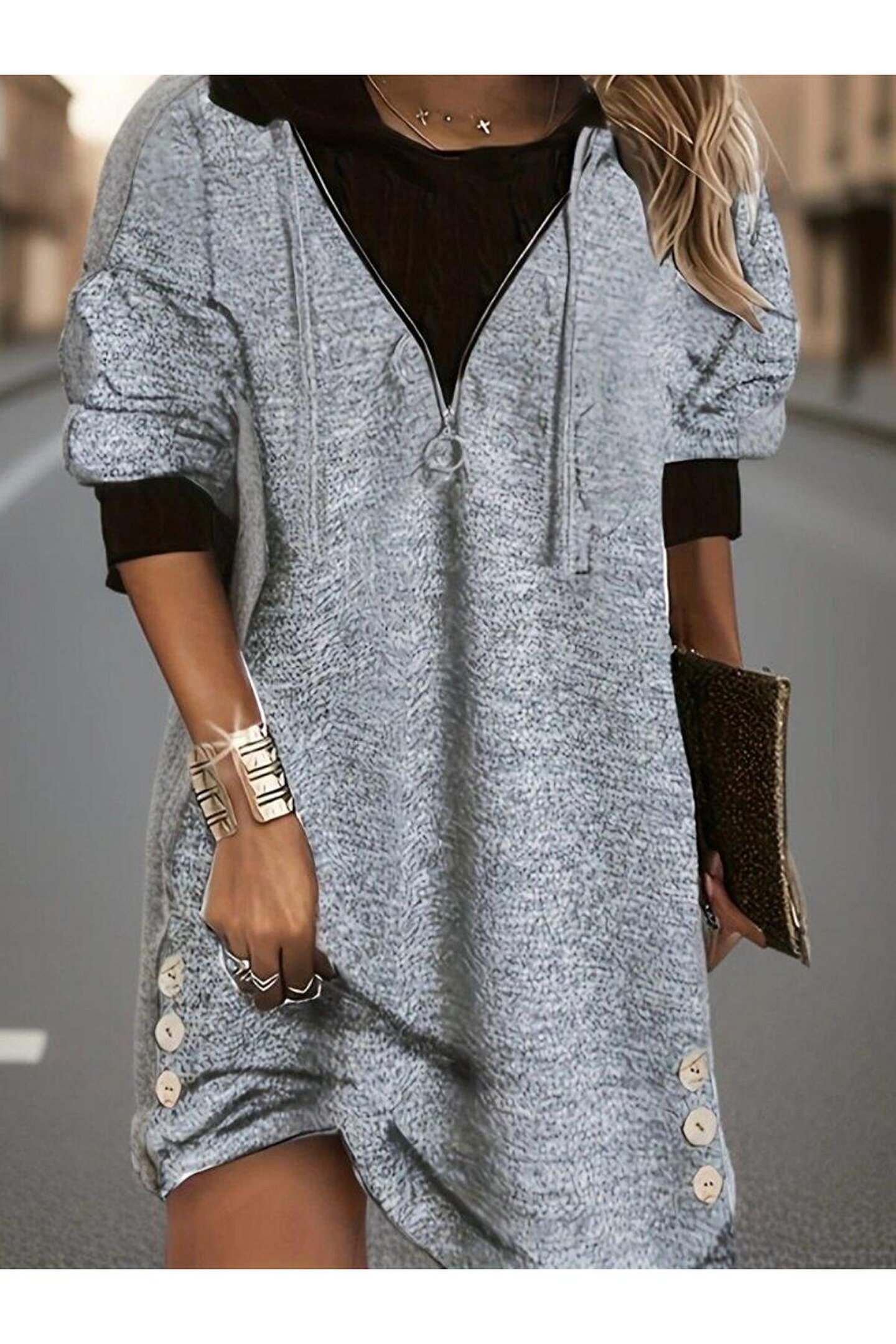 Kadın Uzun Kollu Kapşonlu önden Fermuarlı Düğmeli Mini Iki Iplik Elbise