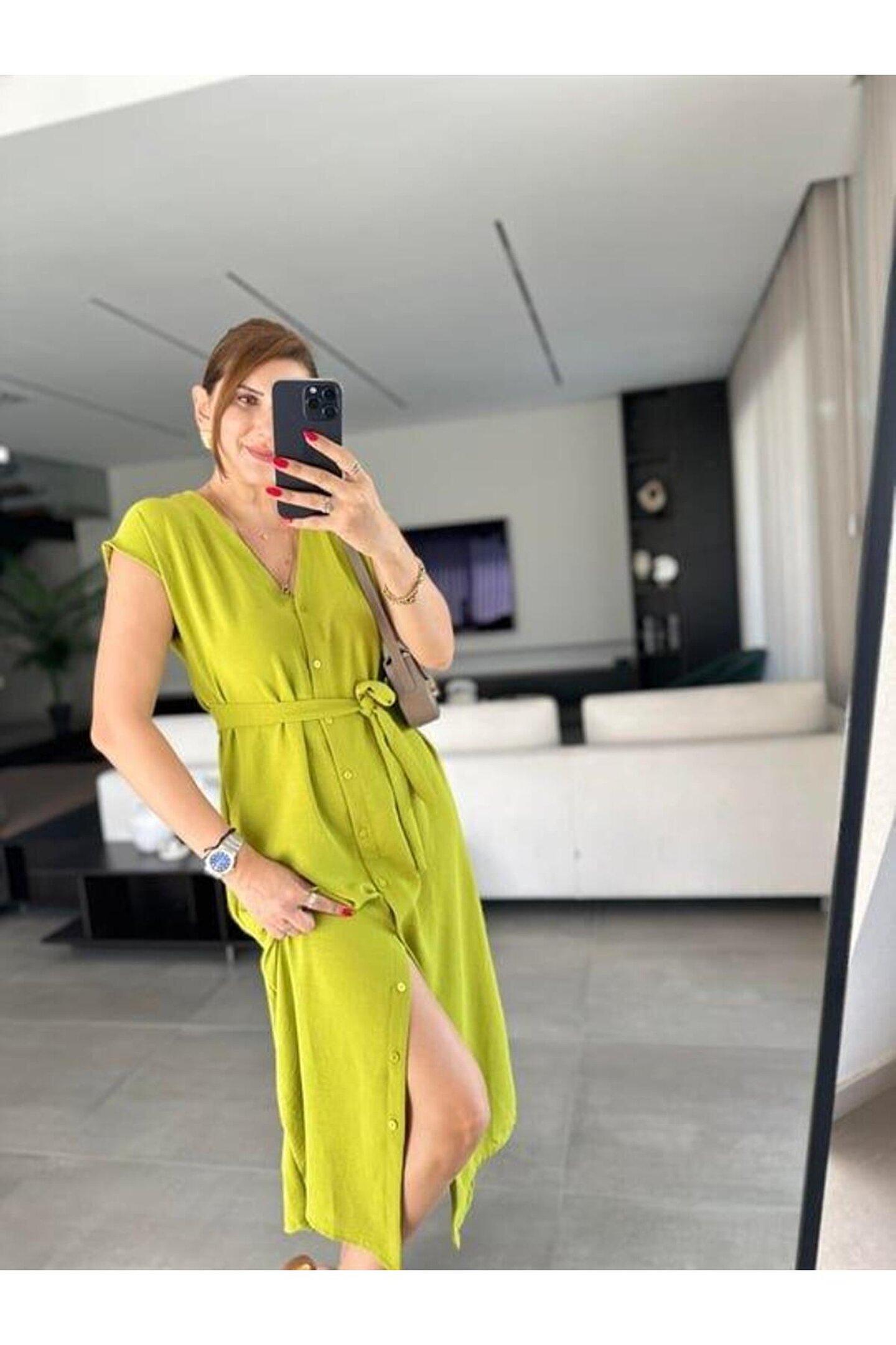 Lady Moss Kadınn V Yaka Düğme Detay Kuşak Dahil Elbise