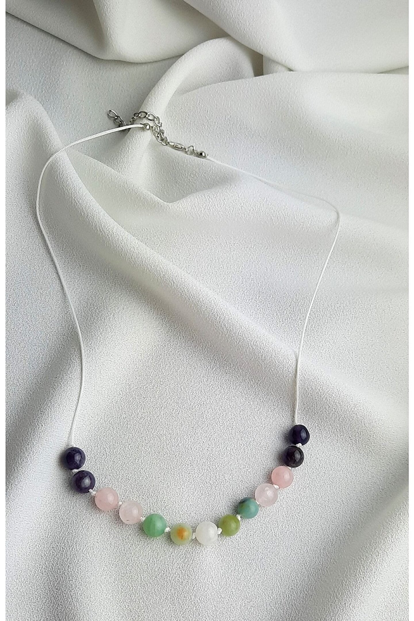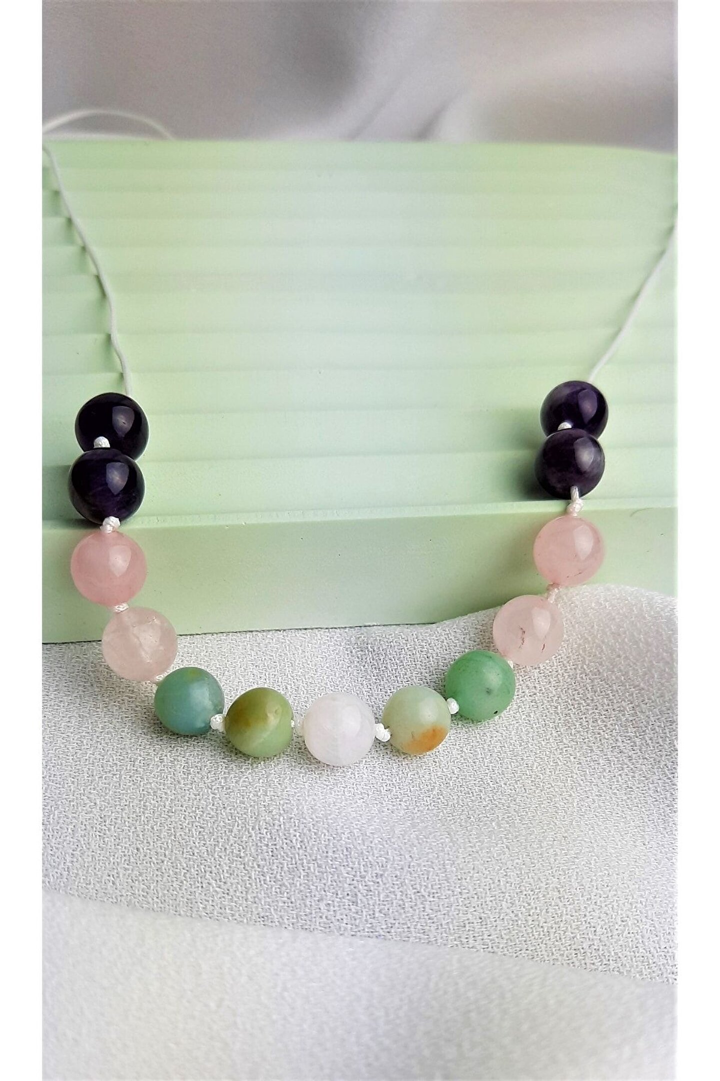 LAVINIA ATELİER ÖZEL TASARIM DİŞİL ENERJİ KOLYESİ SELENE %100 GERÇEK DOĞAL TAŞ KULLANILARAK TASARLANMIŞTIR. ORTALAMA UZUNLUK 45CM OLUP İSTENİLEN ÖLÇÜDE HAZIRLANABİLİR. KULLANILAN DOĞAL TAŞLAR ; AY TAŞI , AMAZONİT ,PEMBE KUVARS, AMETİST. ÜRÜNLER DOĞAL TAŞ OLDUĞUNDAN RENK VE ŞEKİLLERİNDE KÜÇÜK FARKLILIKLAR GÖRÜLEBİLİR. SATICI ADINDA LAVINIA ATELİER YAZDIĞINDAN EMİN OLUNUZ. DOĞAL TAŞLARIN ÇEŞİTLİENERJİLERE SAHİP OLDUĞU BİLİNMEKTEDİR , ANCAK ETKİLERİ KİŞİDEN KİŞİYEDEĞİŞKENLİK GÖSTEREBİLİR. TAŞLARIN ÖZELLİKLERİNİN BİLİMSEL KESİNLİĞİ YOKTUR ,FAKAT ÜRÜNLERİMİZDE KULLANILAN TÜM TAŞLAR %100 GERCEK DOĞAL TAŞ OLUP GÜVENLE ALIŞVERİŞYAPABİLİRSİNİZ.
