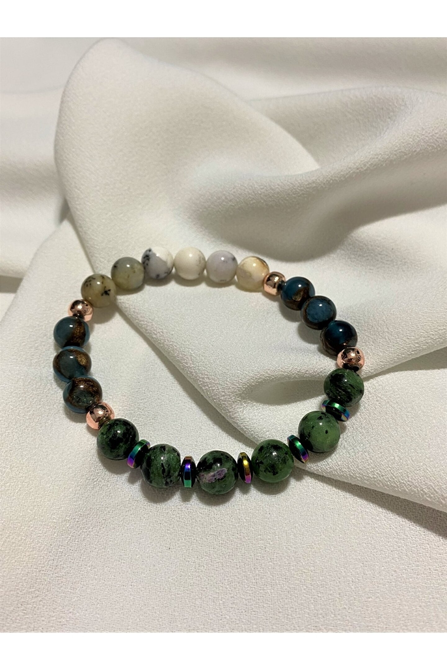 Doğal taş kullanımı sayesinde her bileklik benzersiz ve otantik bir görünüm sunar; Opal, Murano kuvars, Anyolit ve Hematit gibi farklı renk ve dokulardaki taşlarla zenginleştirilmiş tasarım, göz alıcı bir estetik sağlar; Doğal taş bileklik, hem günlük kullanım hem de özel günler için ideal bir aksesuar seçeneği olarak öne çıkar; Doğal taşların şık ve zarif yapısı, bileklikteki her detayı ön plana çıkararak dikkat çekici bir stil oluşturur;