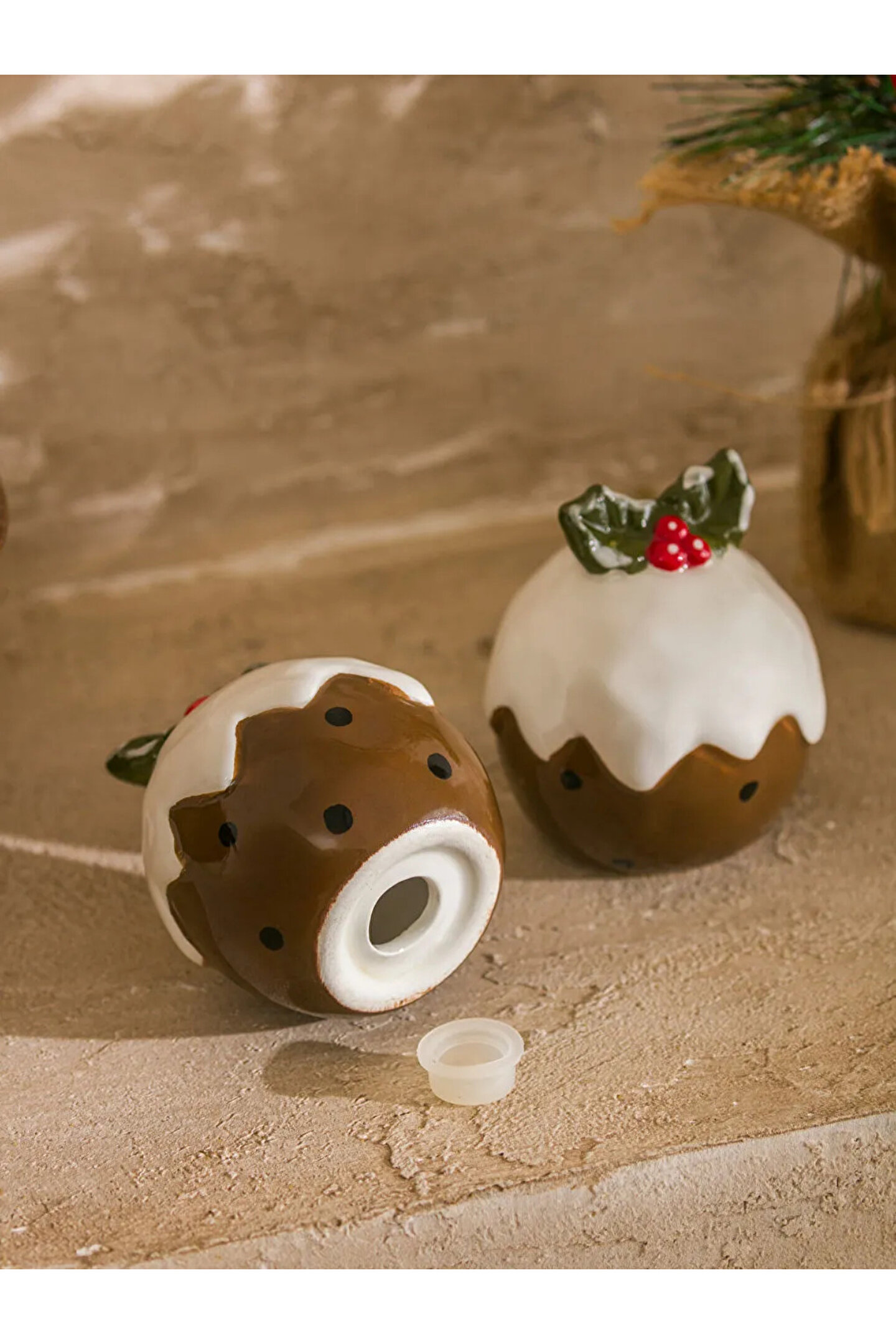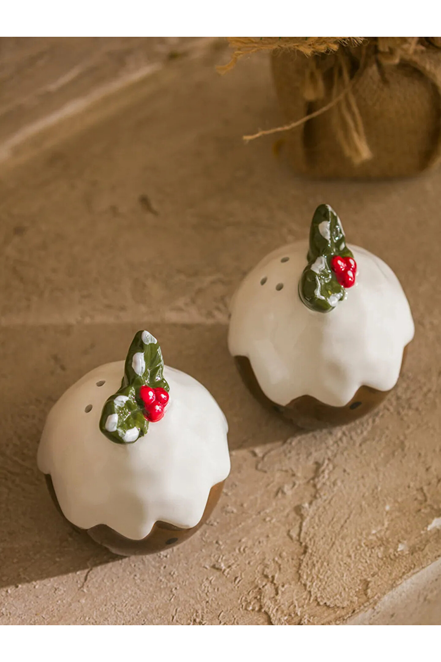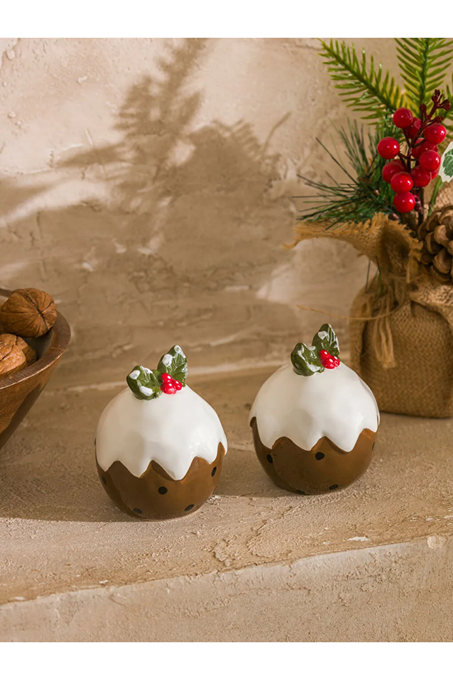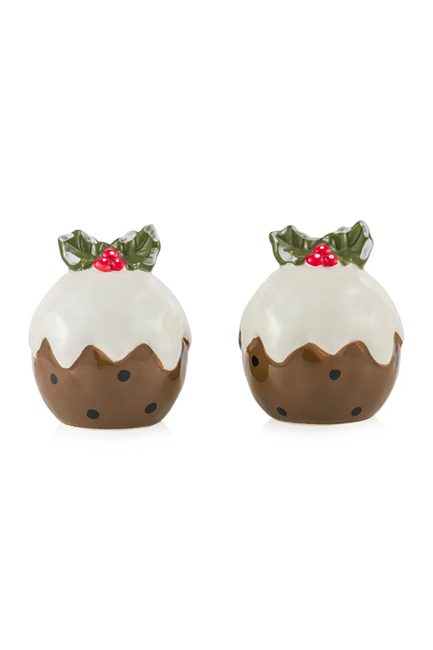 • Puding şeklinde tasarlanmış, üzerinde yaprak ve meyve detayı bulunan iki parçalı tuzluk ve biberlik seti.