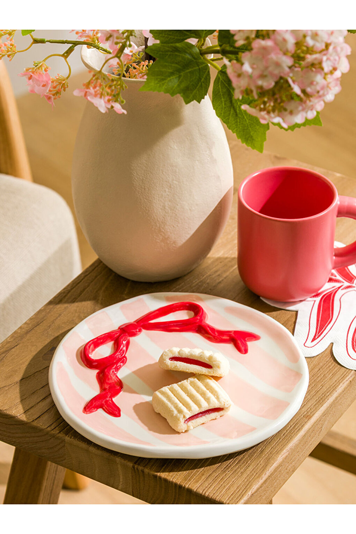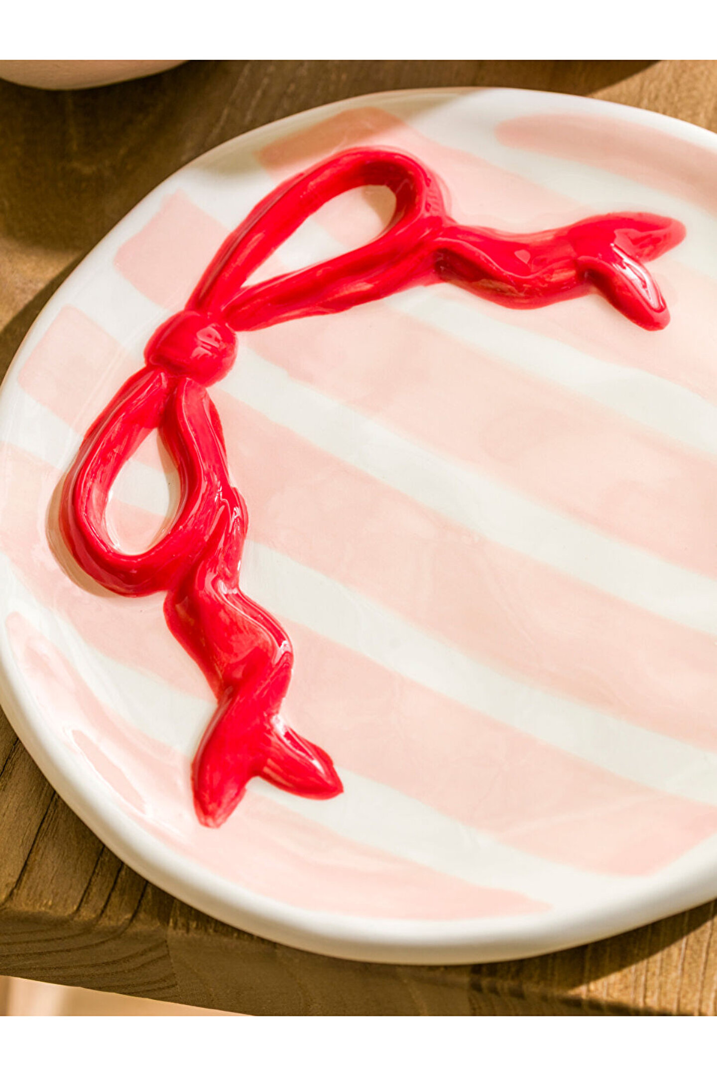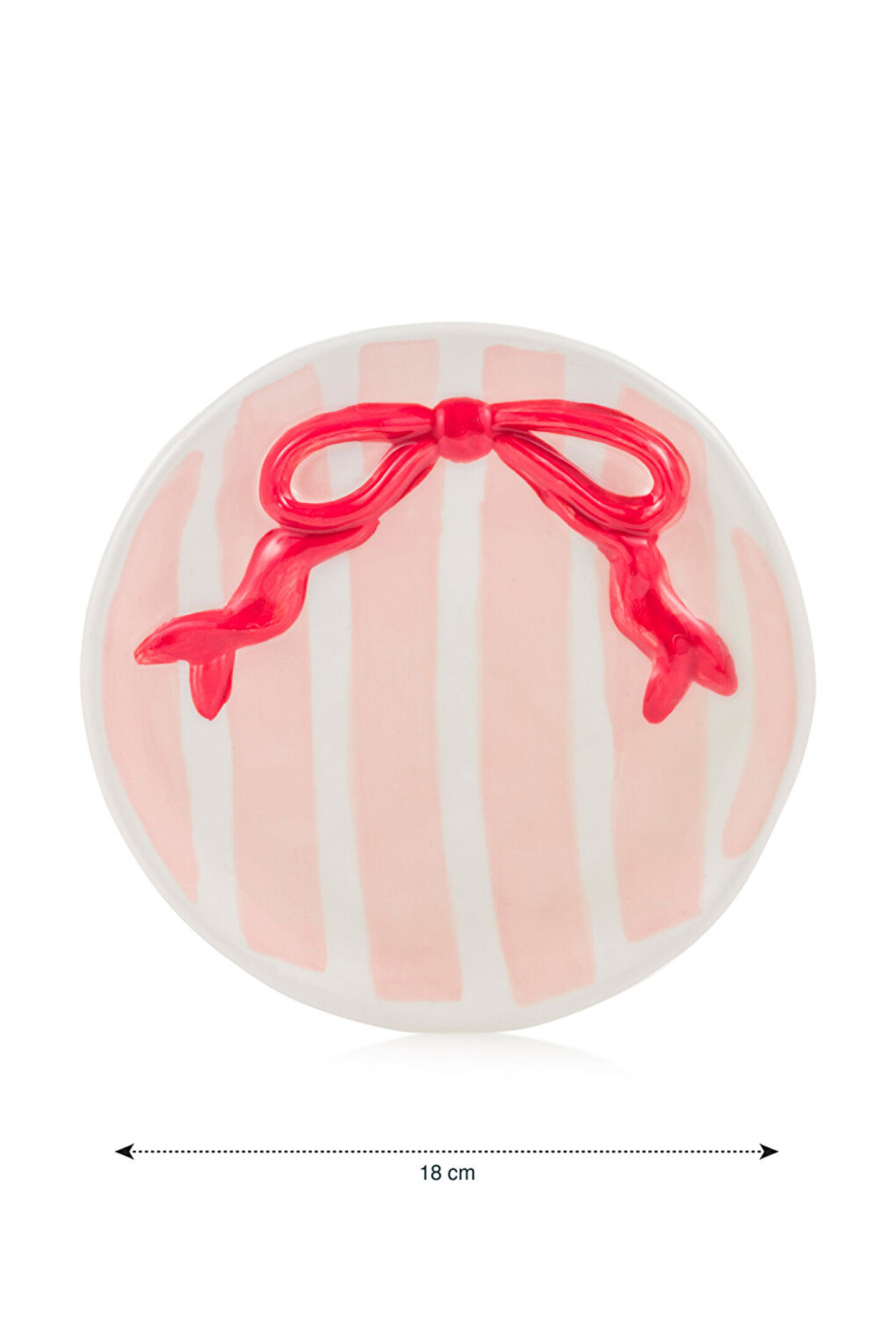 Çizgili desenli, yuvarlak formlu tabak, ortasında kabartmalı fiyonk detayına sahiptir. 18 cm çapındadır.
