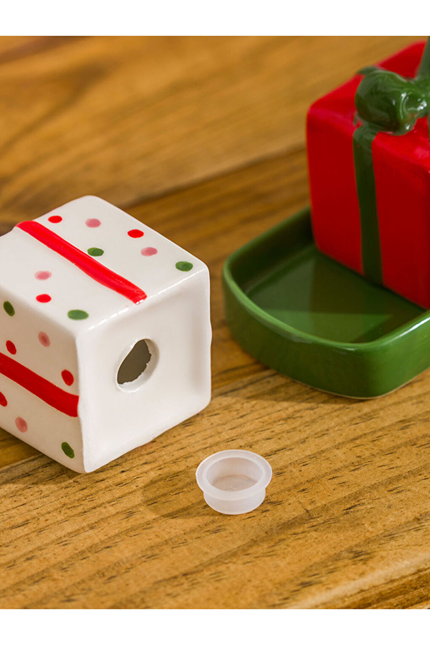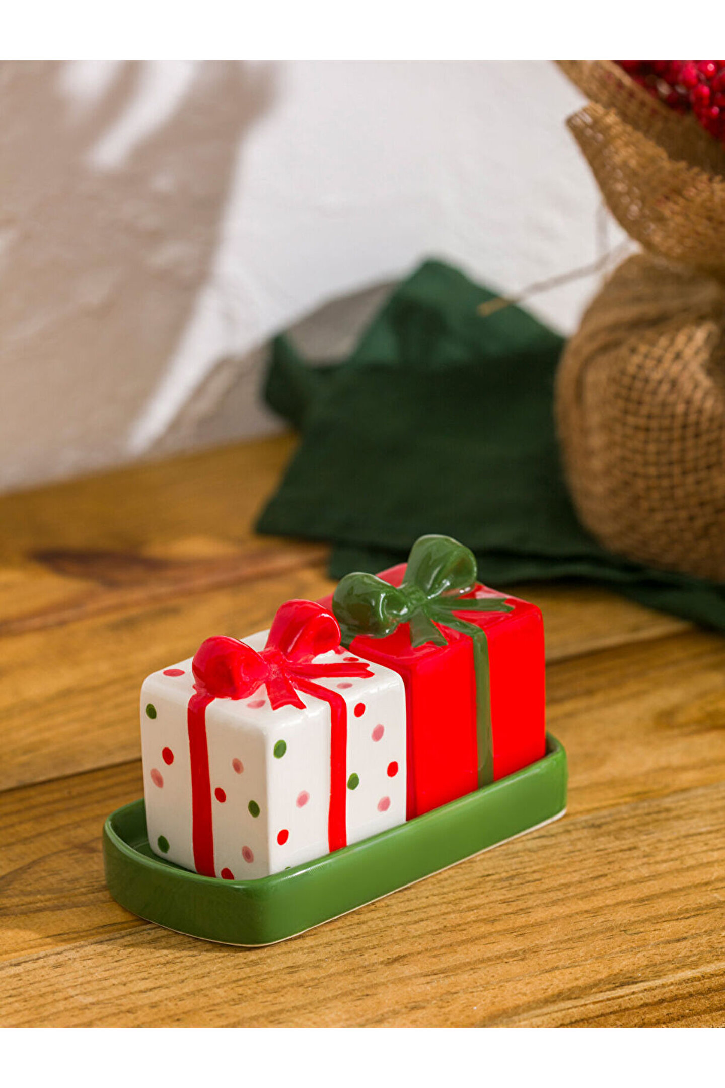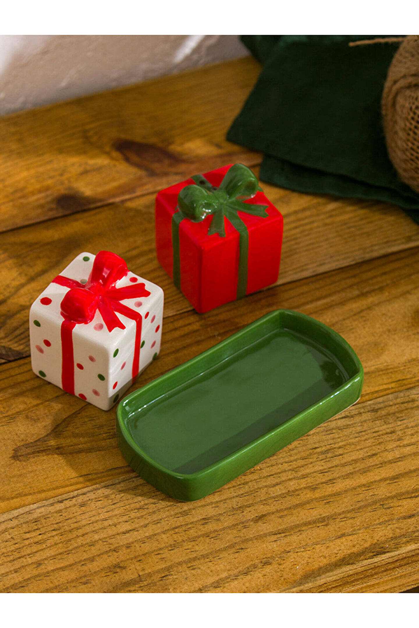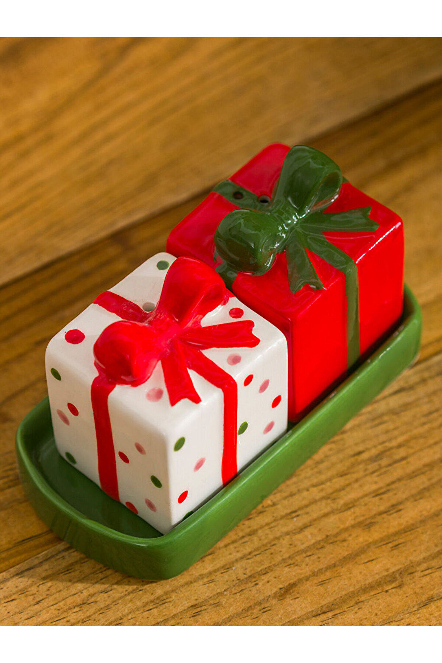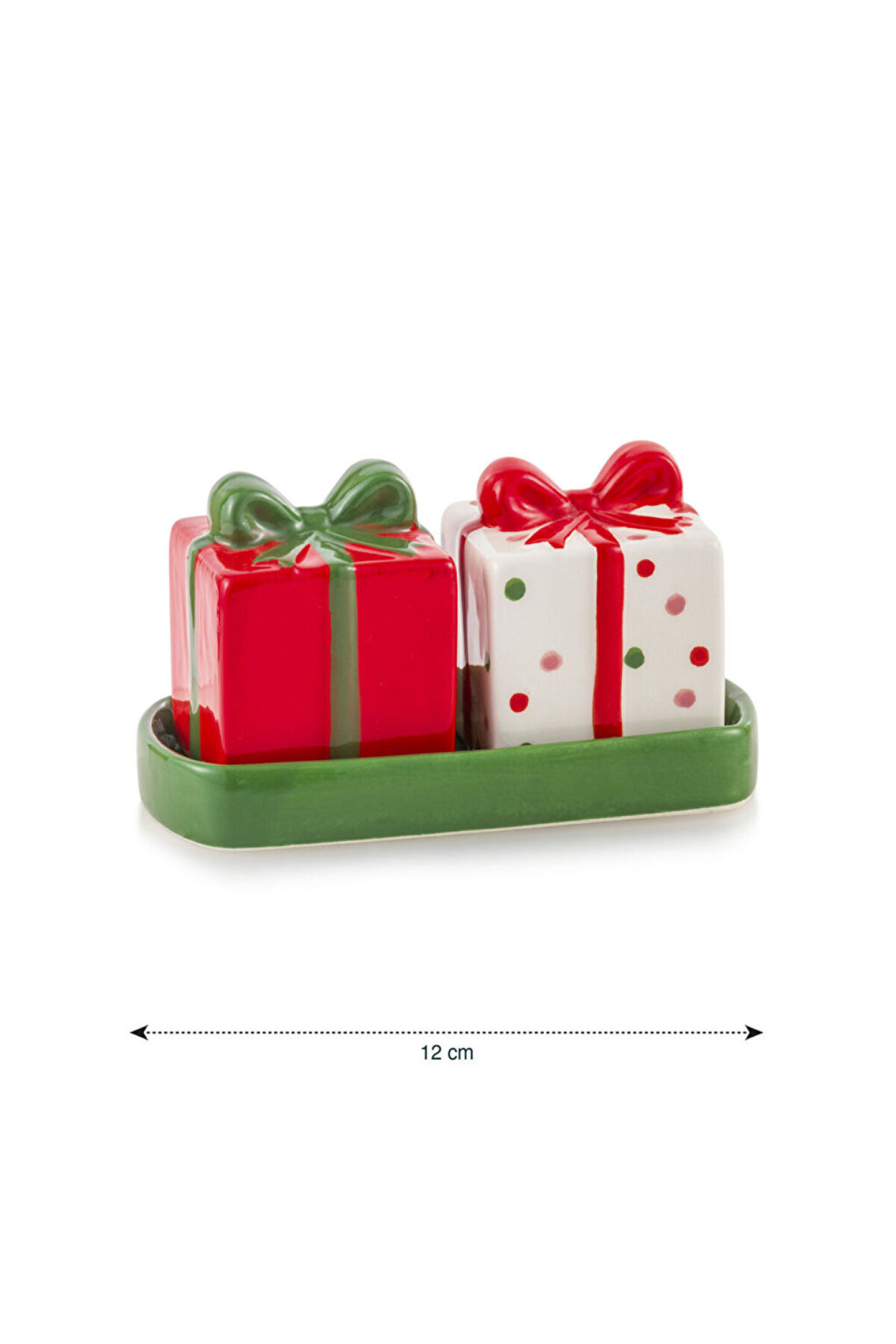 • Seramik malzemeden üretilmiş, hediye paketi formunda, fiyonk detaylı, tepsili tuzluk biberlik seti.