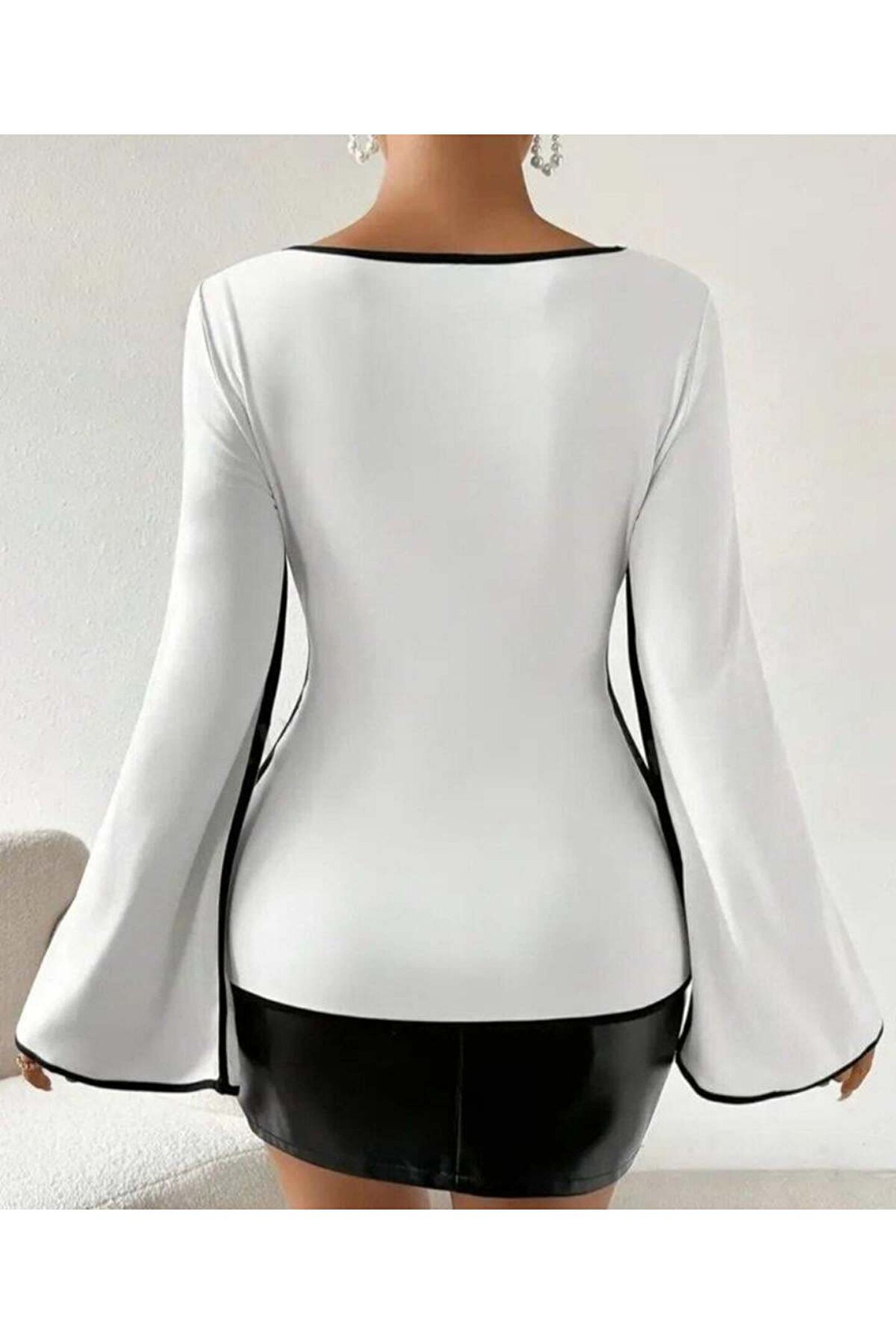 Kadın U Yaka Siyah şerit Detyalı Yarasa Kol Dalgıç Kumaş Arabiyeli Bluz