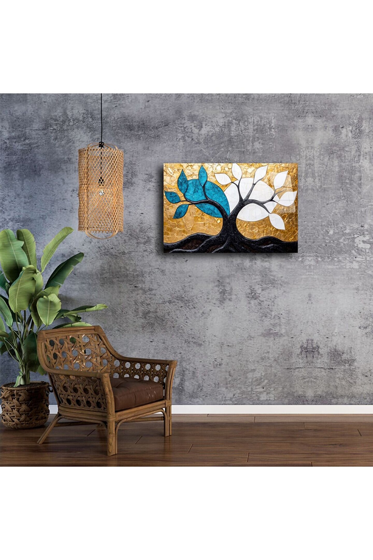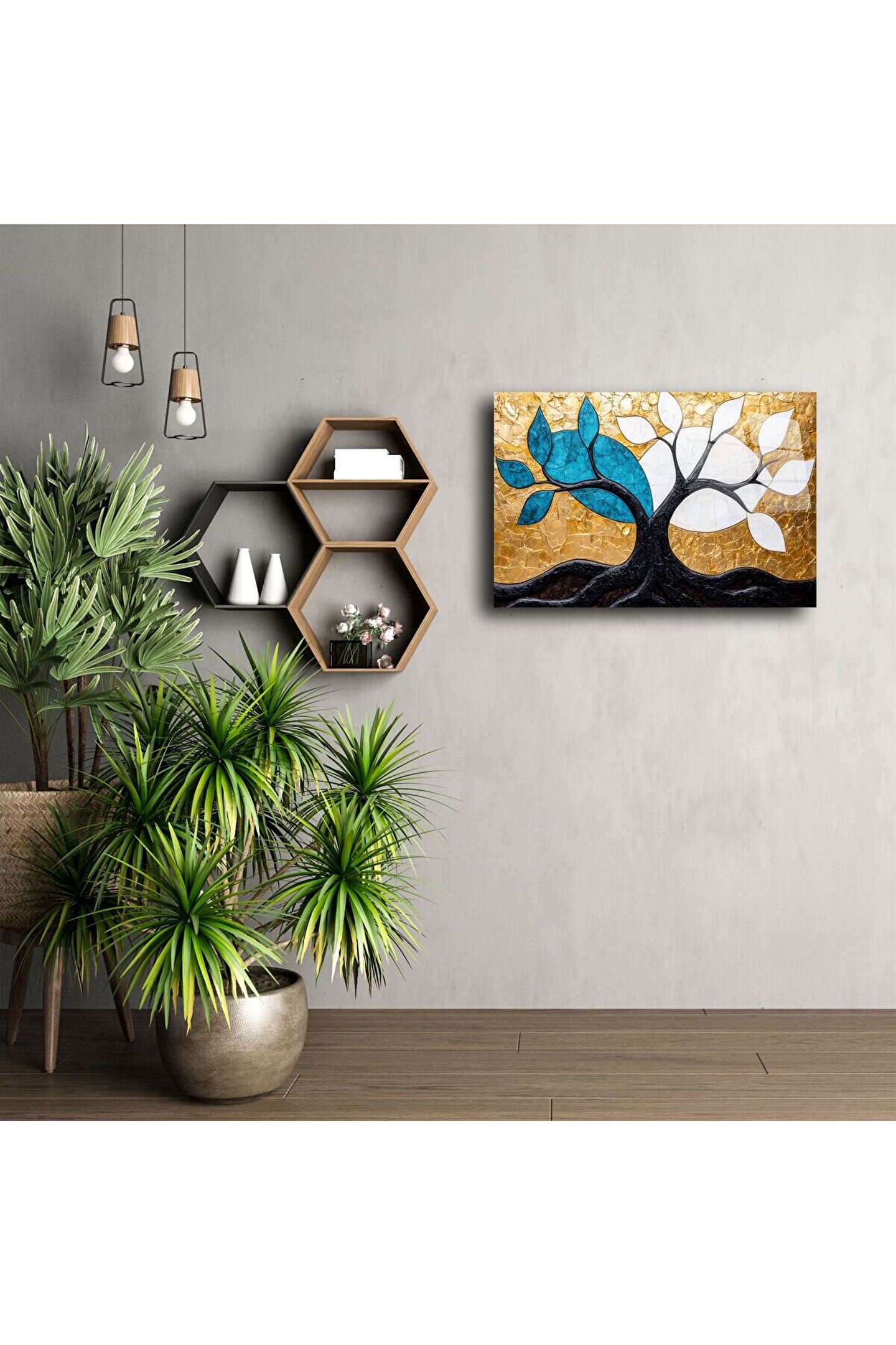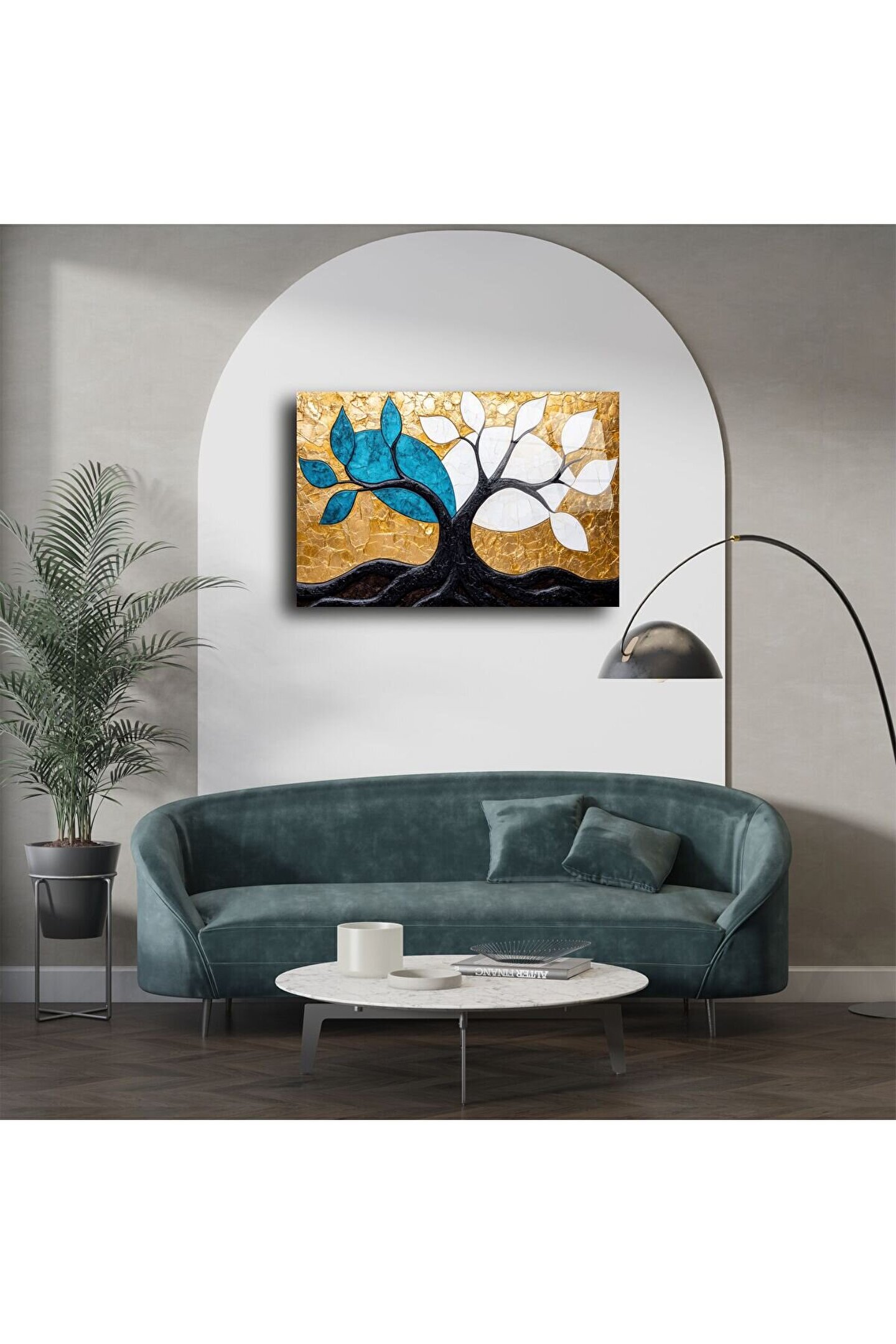 Göz alıcı mavi ve beyaz yaprak detayları, altın arka planla güçlü bir kontrast oluşturur ve her bakışta ruhunuzu tazeler. Oturma odası, ofis, giriş holü veya hediye olarak tercih edilebilecek eşsiz bir dekor parçasıdır.