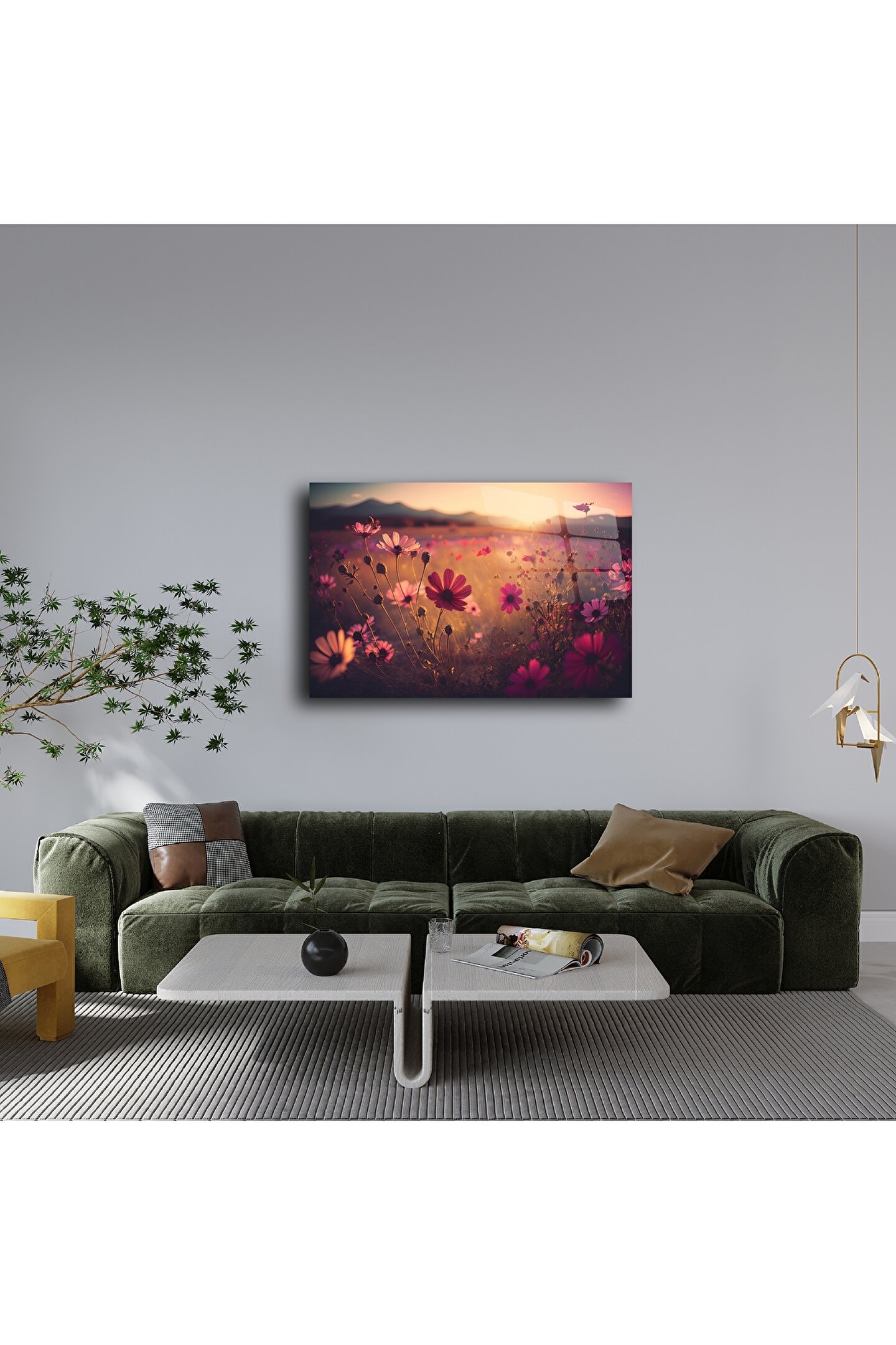 LEYLASER Altın Gün Batımı Çiçek Tarlası Cam Tablo
