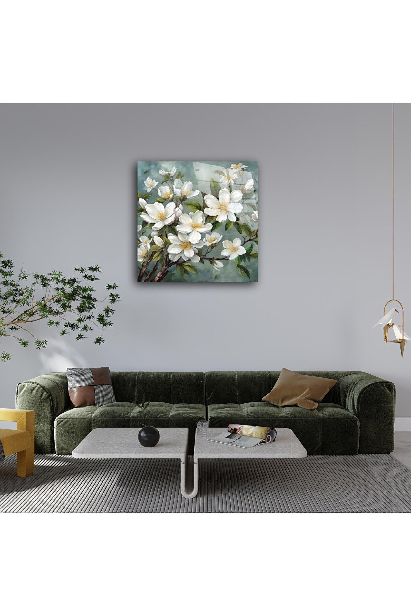 LEYLASER Beyaz Çiçekler Cam Tablo Duvar Dekoru