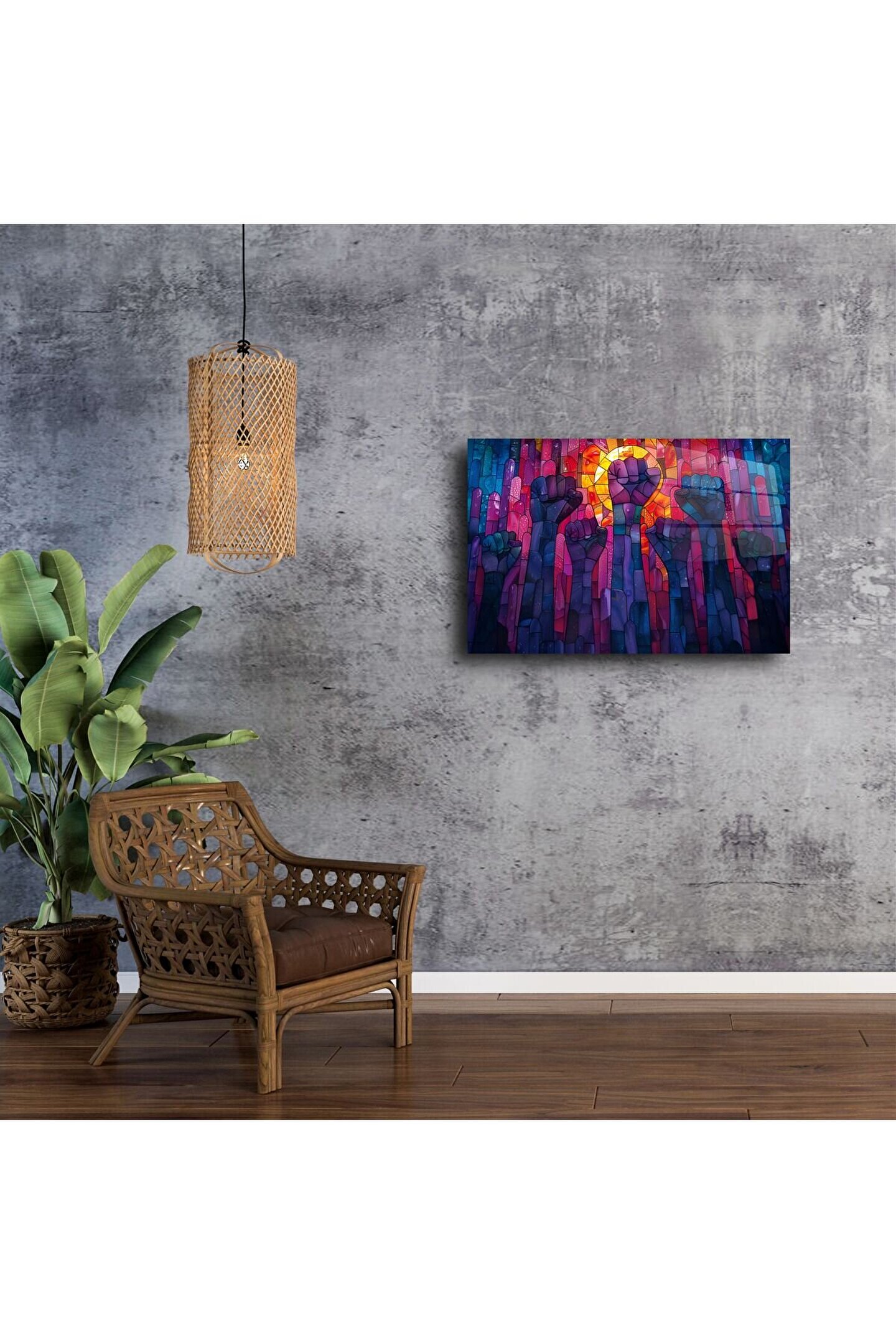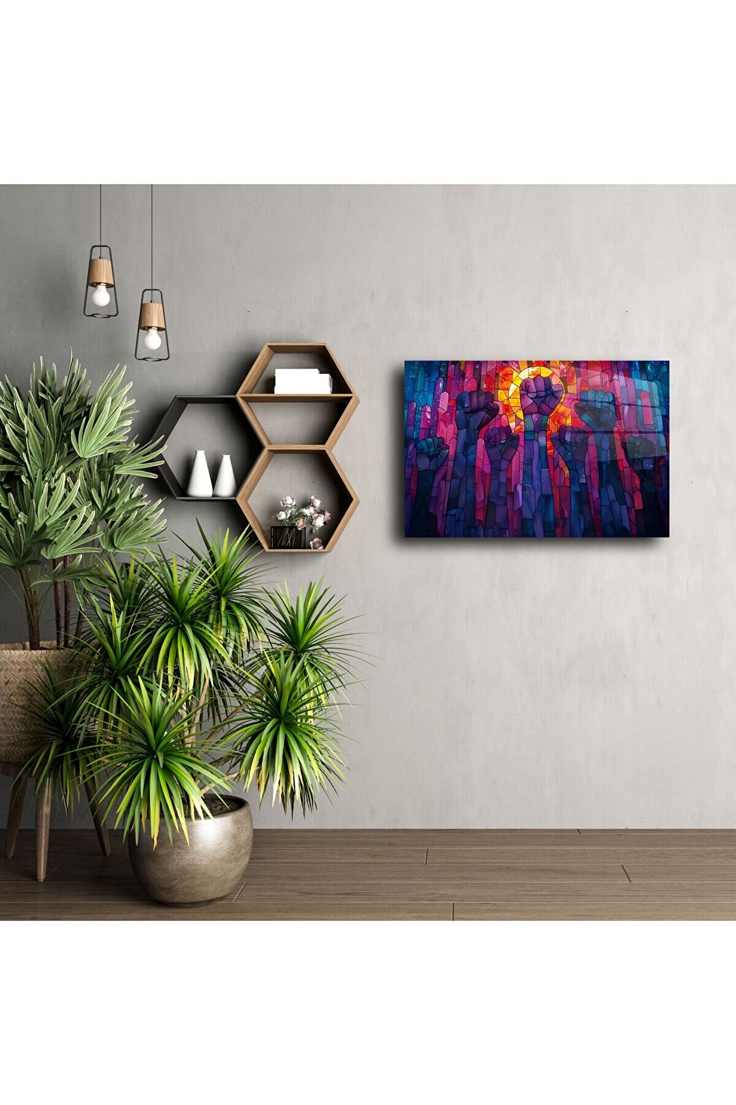 Renklerin ve ifadenin bir araya geldiği bu Cam Duvar Sanatı Direniş Paneli, yalnızca dekor değil; bir duruşun, umudun ve birliğin sanatla buluşmasıdır. Güçlü yumruk figürlerinin yer aldığı bu özel tasarım, yüksek kaliteli temperli camüzerine işlenmiş ve ışığı yansıtarak mekânınıza canlılık katmak üzere üretilmiştir.