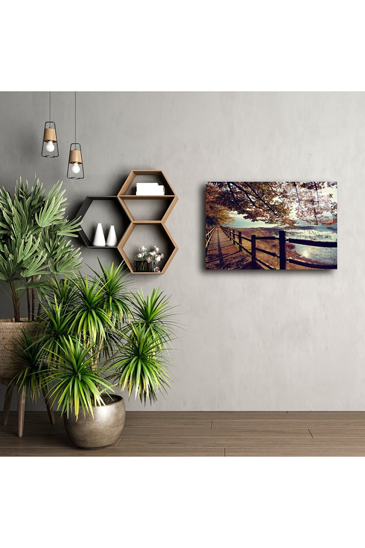 Cam Duvar Sanatı Doğal Yürüyüş Yolu Paneli, iç huzur ve doğa sevgisini yaşam alanınıza taşıyan büyüleyici bir sanat eseridir. Işıltılı göl yansımaları, yaprak döken ağaçlar ve sonsuza uzanan ahşap yolun birleşimi, bu tabloya derin bir dinginlik ve romantizm kazandırıyor.