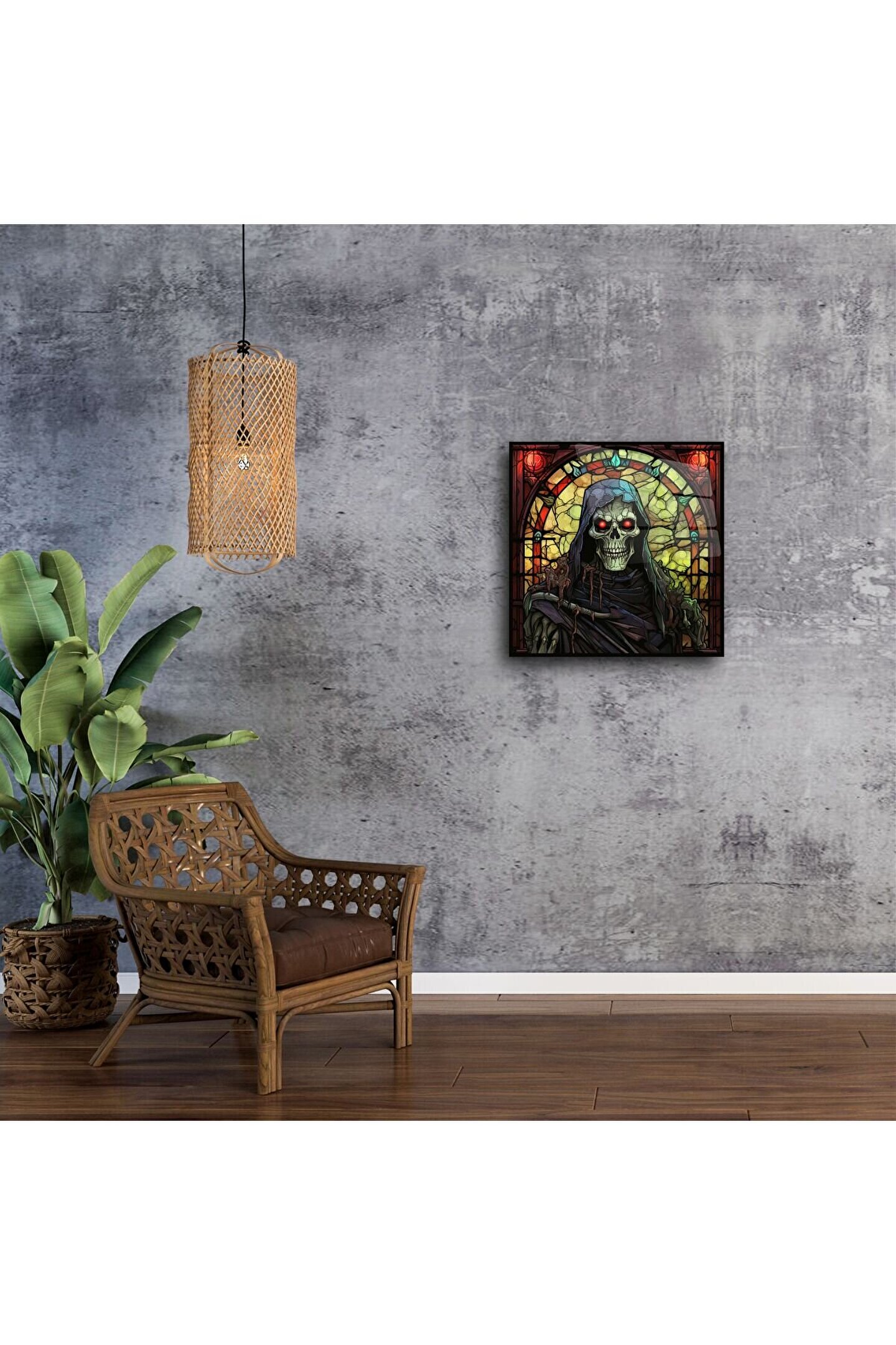 Kızıl gözler, vitray stili arka plan ve dramatik kontrastlar bu parçayı karanlık temalı ev dekorasyonlarının yıldızı yapar. Salon, koleksiyon odası ya da temalı bir ofis ortamı için ideal bir atmosfer yaratır.