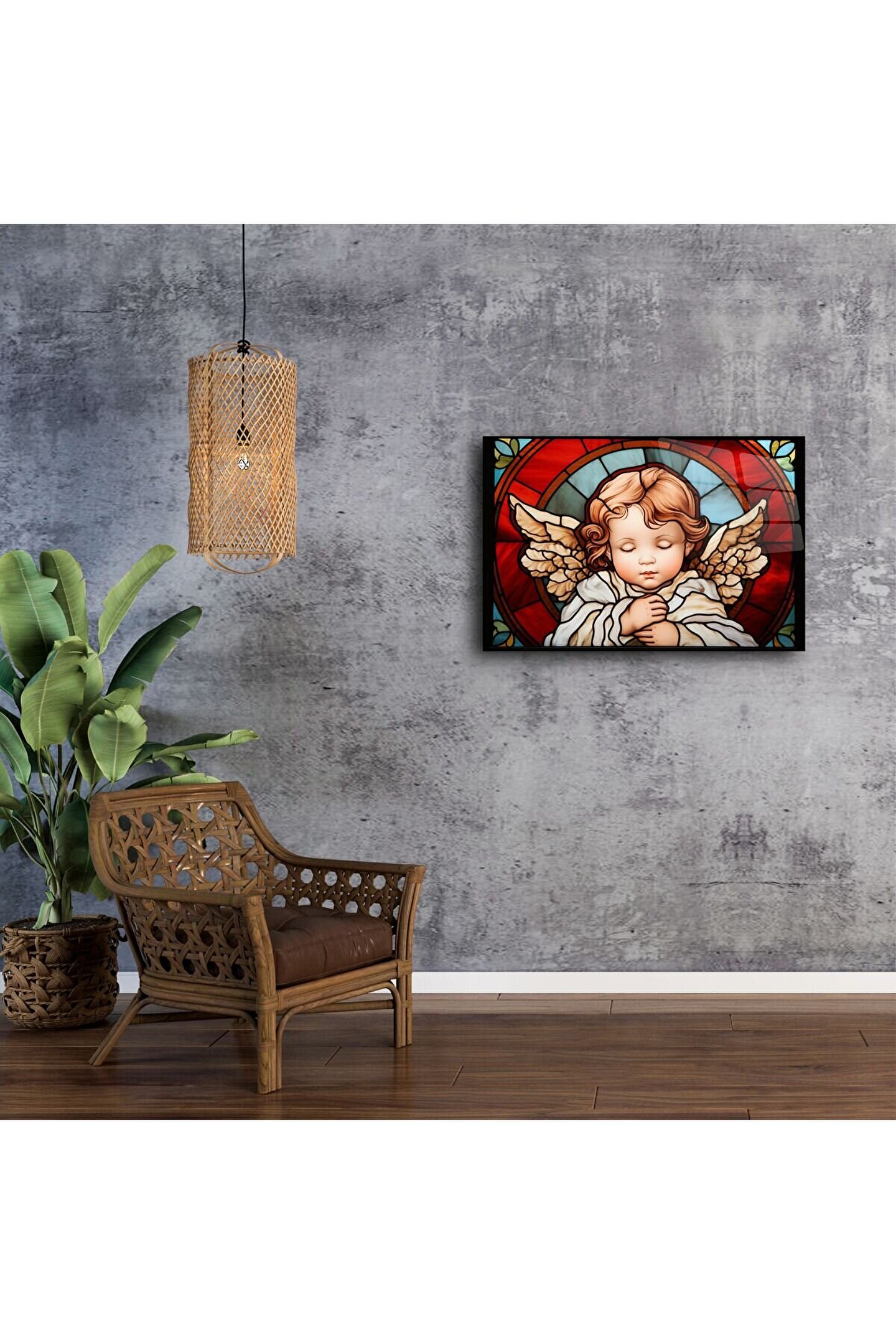 Canlı kırmızı ve altın tonlarının birleştiği bu vitray tarzı tasarım, derin bir dinginlik ve estetik sunar. Meditasyon alanları, ibadet köşeleri, çocuk odaları ya da sevdiklerinize manevi bir hediye olarak idealdir.