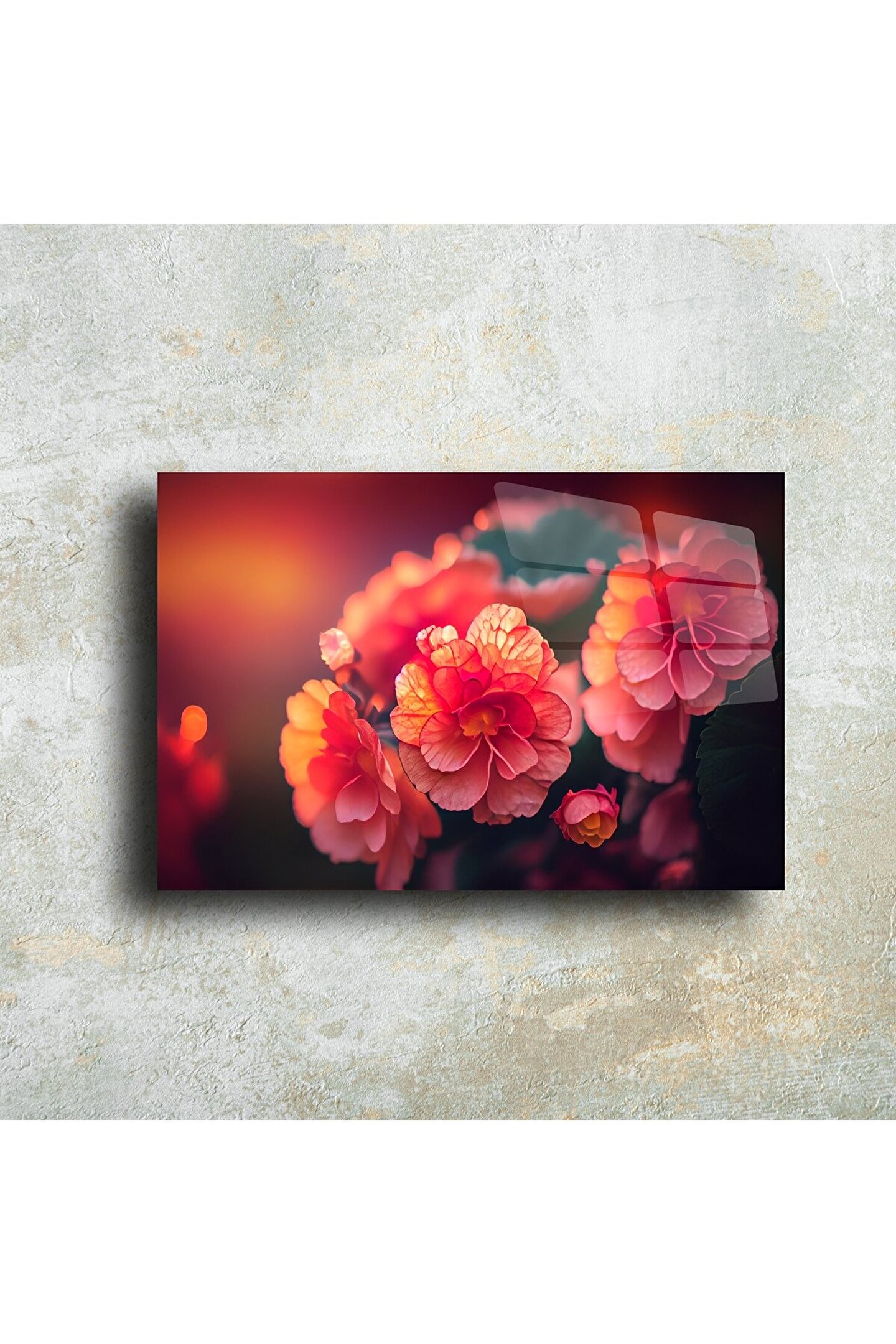 Canlı begonya çiçeklerinin göz alıcı detaylarıyla işlenmiş bu cam tablo, yaşam alanınıza zarif ve huzurlu bir dokunuş katıyor. Yüksek kaliteli temperli cam üzerine basılan bu modern sanat eseri, ışığı yansıtan parlak yüzeyiyle dikkat çekerken renklerin derinliğini muhteşem bir şekilde ortaya çıkarıyor.