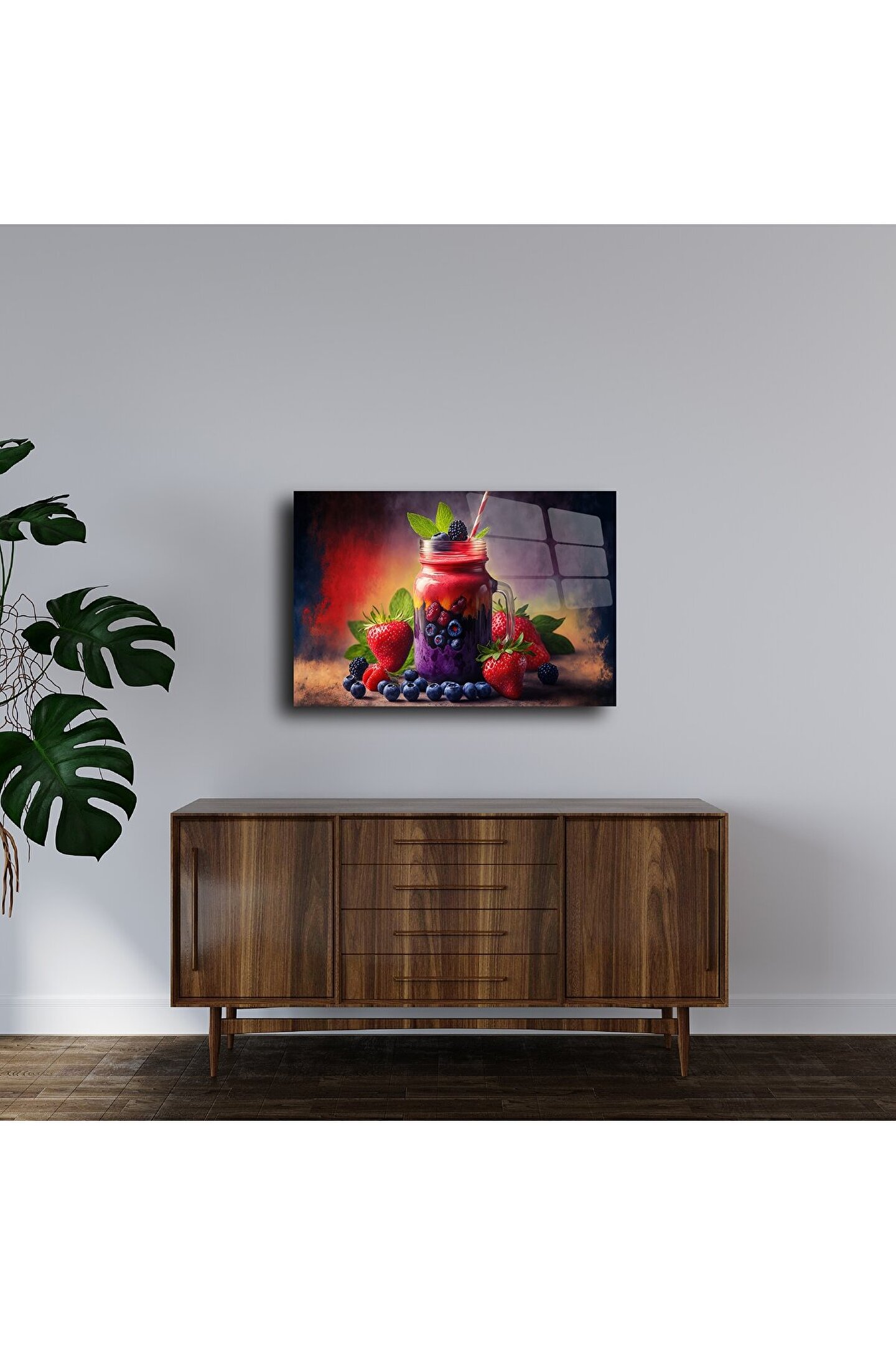 Taze orman meyveleri ve sağlıklı smoothie içeceğinin birleştiği bu canlı Cam Tablo, mutfağınıza ya da yemek alanınıza enerji katacak. Parlak ve detaylı görsel, yüksek kaliteli temperli cam üzerine basılmıştır ve renklerin canlılığıyla dikkat çeker.