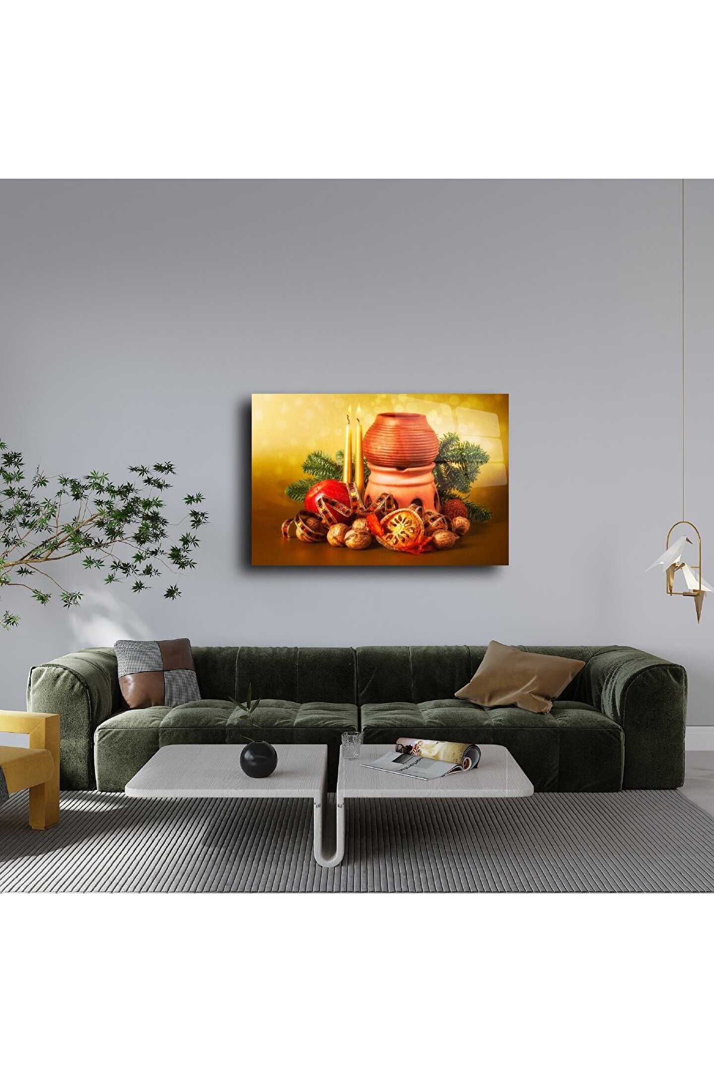 Kışın sıcak ruhunu ve yılbaşı neşesini evinize taşıyan bu Cam Tablo, mum ışığı, nar, ceviz ve tarçın detaylarıyla görsel bir şölen sunuyor. Parlak temperli cam yüzeyiyle ışığı büyüleyici şekilde yansıtırken, altın ve bakır tonlar ortama nostaljik bir sıcaklık katar.