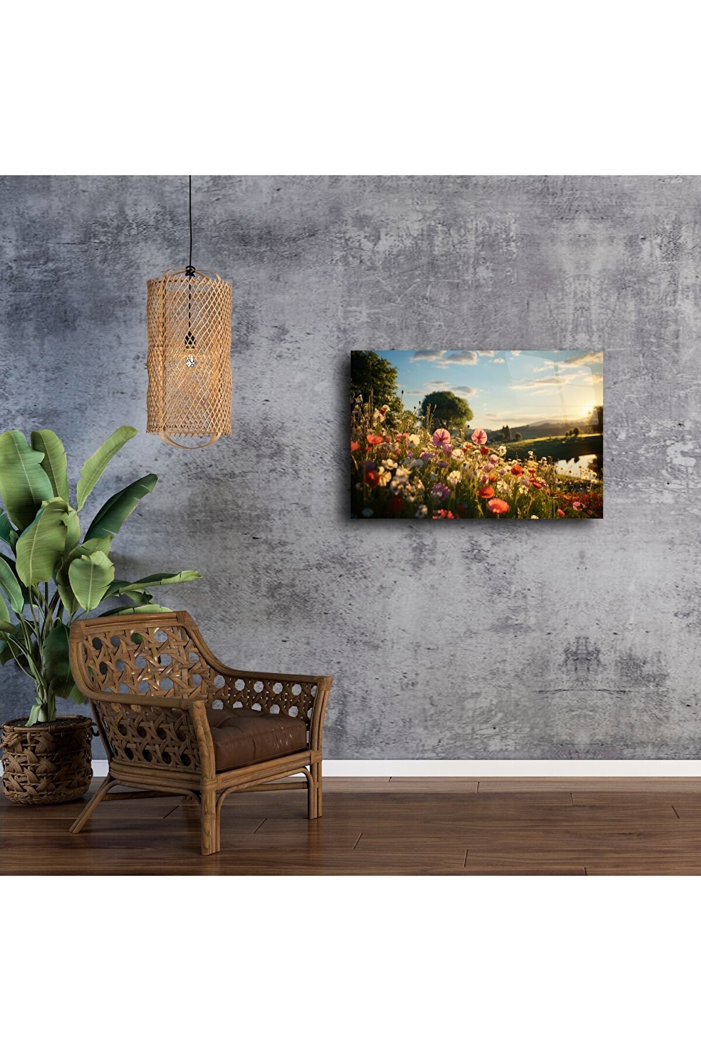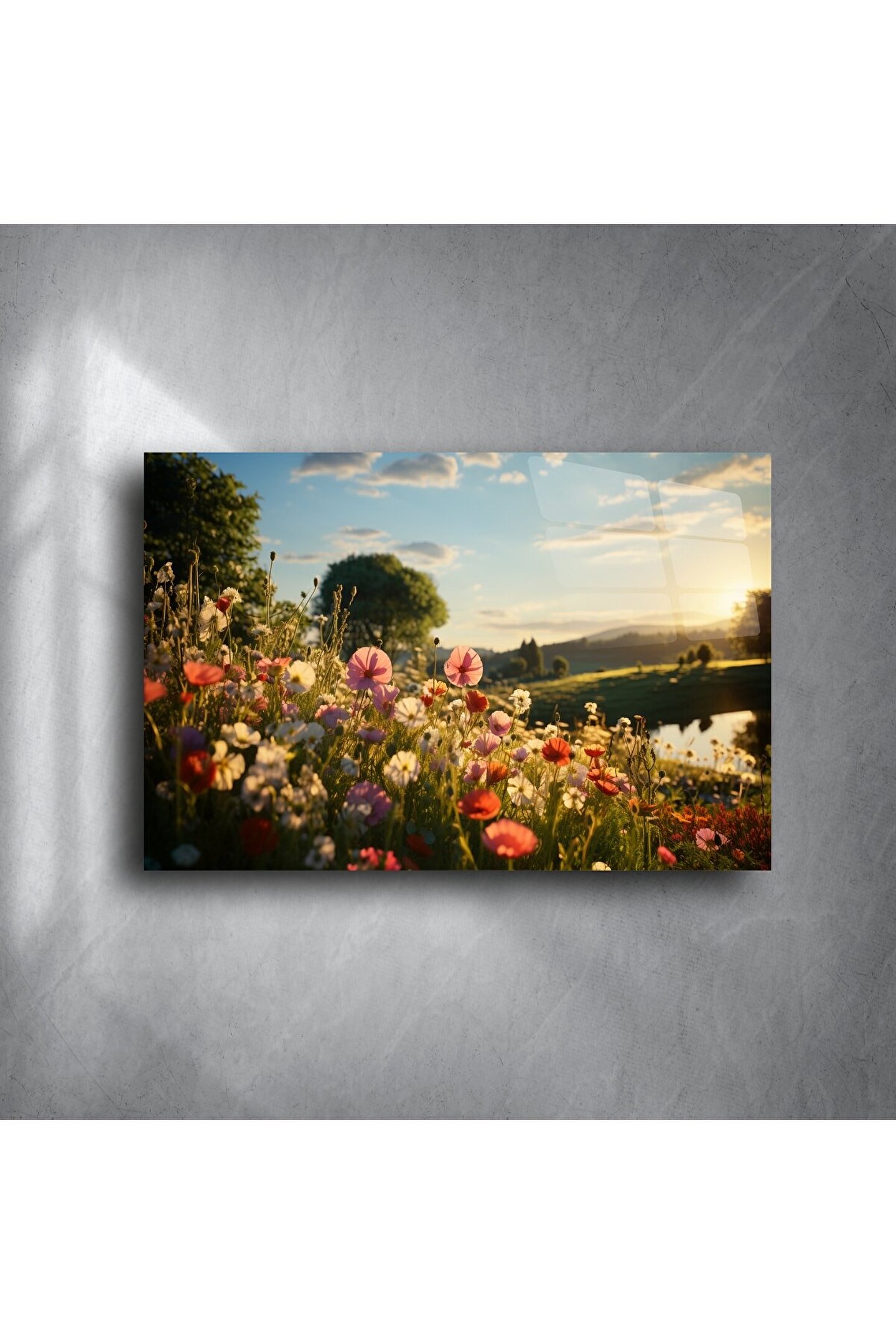 Baharın romantik dokunuşunu her gün duvarınızda yaşayın. Bu doğal çiçek manzarası, yumuşak gün batımı ışığı altında huzur ve umut getiriyor. Vahşi çiçeklerin göz alıcı dokusu, pastoral bir kır yürüyüşünü anımsatıyor — evinizdeki her köşeye sıcaklık ve şiirsellik katmak için tasarlandı.