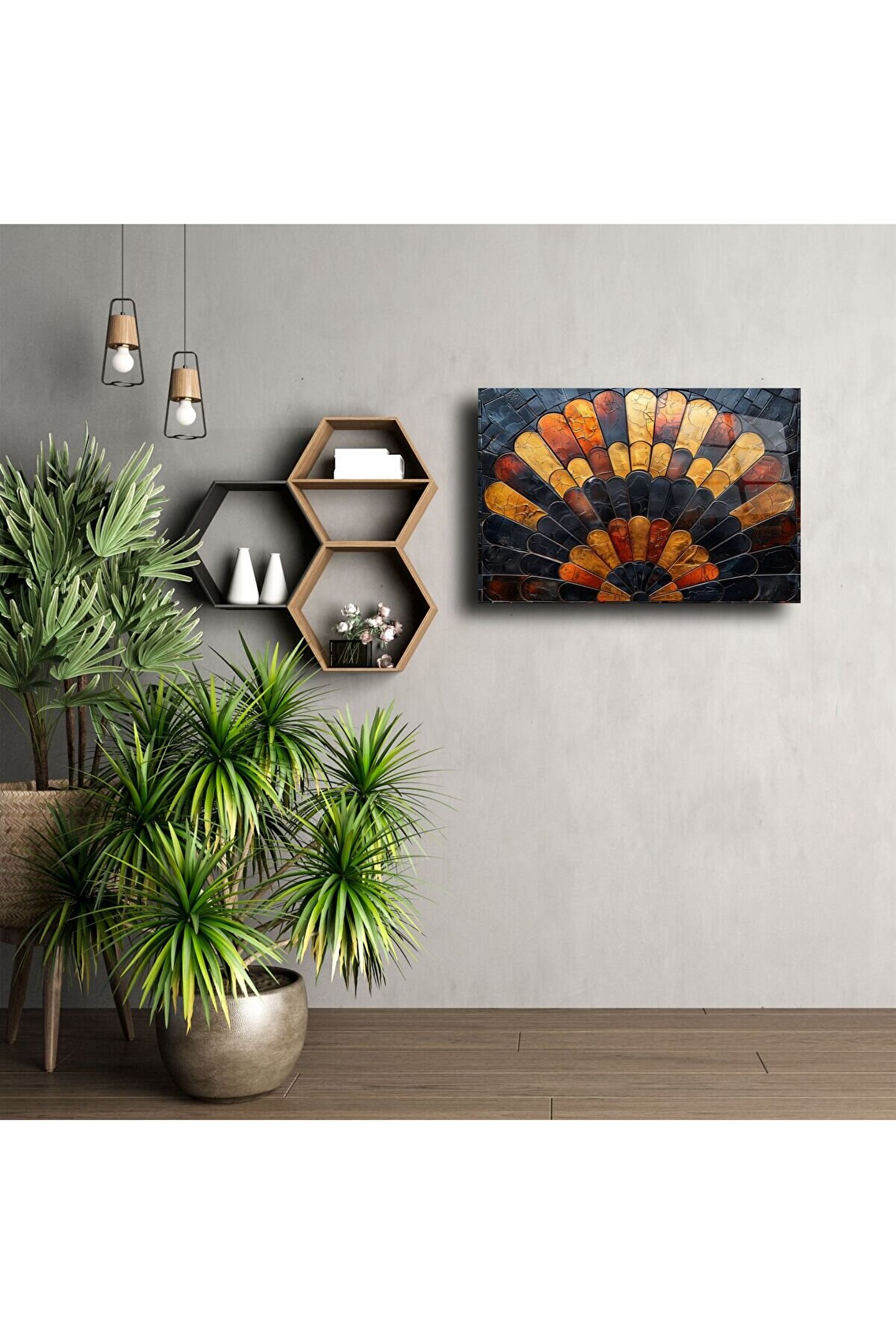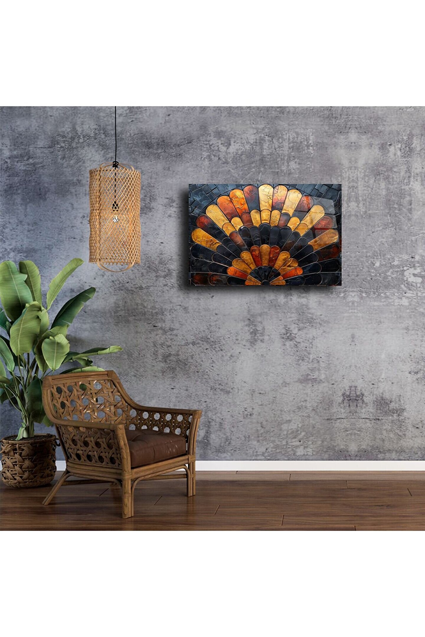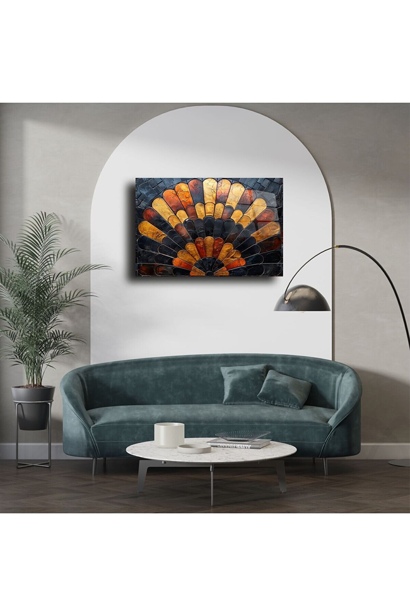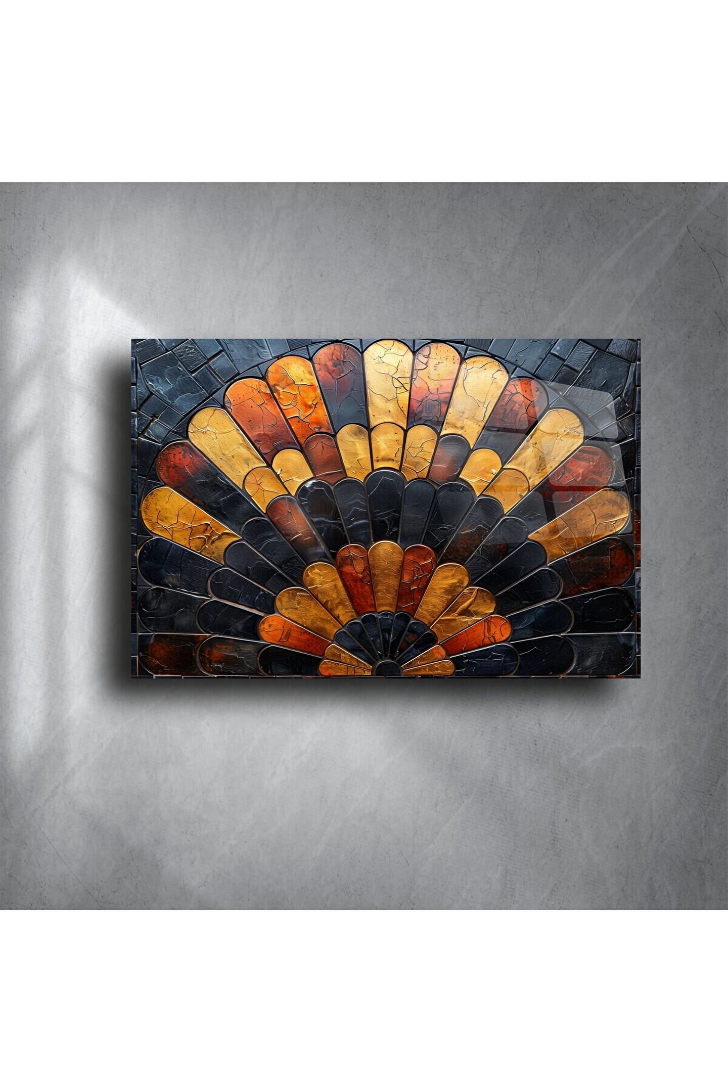 Göz alıcı siyah, altın ve turuncu tonlarında parlayan bu el yapımı cam mozaik tablo, sanat ve lüksün zarif bir bileşimidir. Zarif yelpaze formu, her bir cam parçasının ustalıkla kesilip bir araya getirilmesiyle hayat bulur – evinizde sofistike bir atmosfer yaratmak için birebir.
