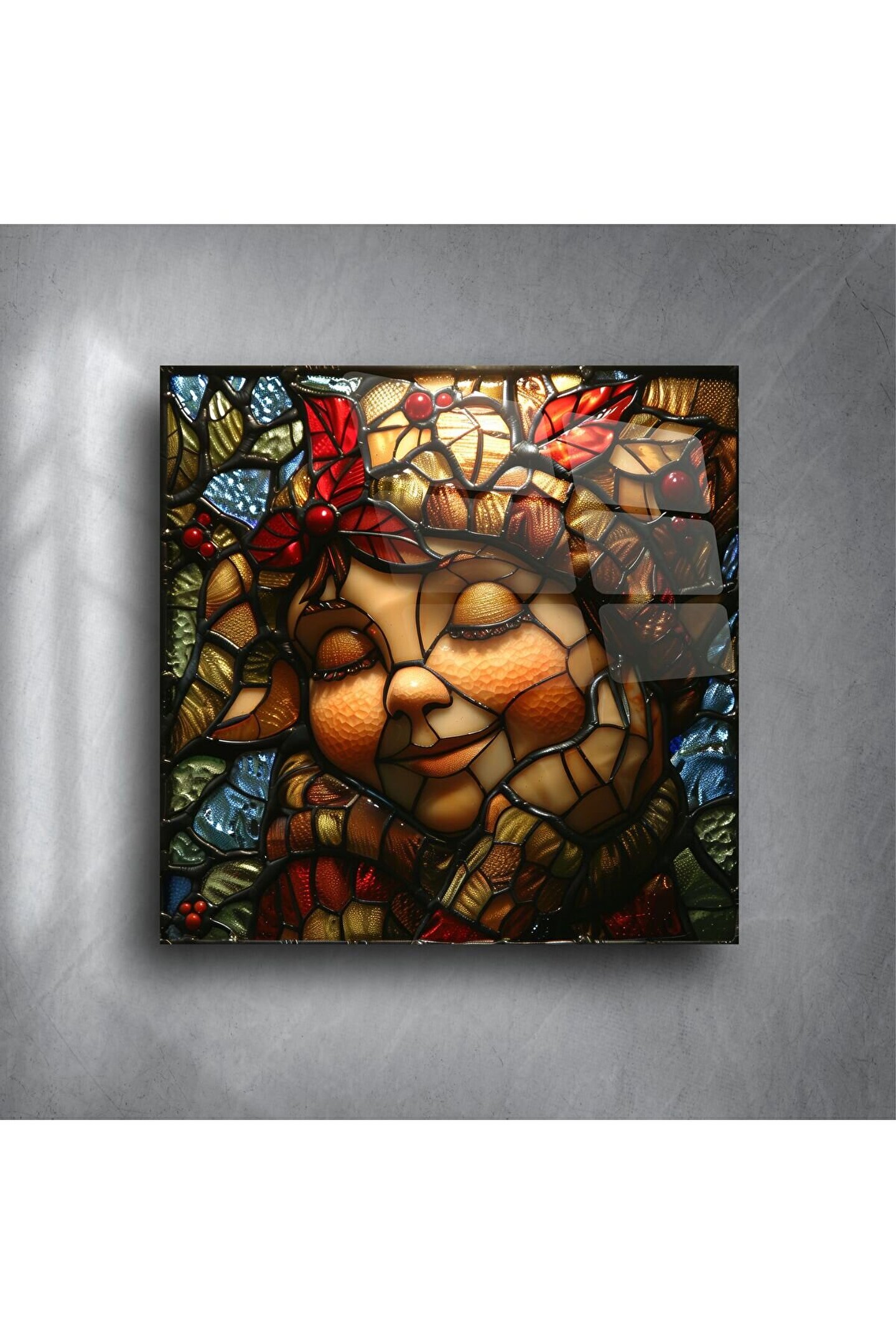 Mekânınıza sıcaklık ve masumiyet getirin — bu el yapımı vitray panel, huzur içinde uyuyan bir çocuğun yüzünü canlandırırken, çevresini sonbaharın canlı yaprakları ve zengin dokular süsler. Her bir detay, yüksek kaliteli camla işlenmiş olup duyguyu ve mevsimsel güzelliği yansıtarak sizi sakin ve huzurlu bir ana davet eder.