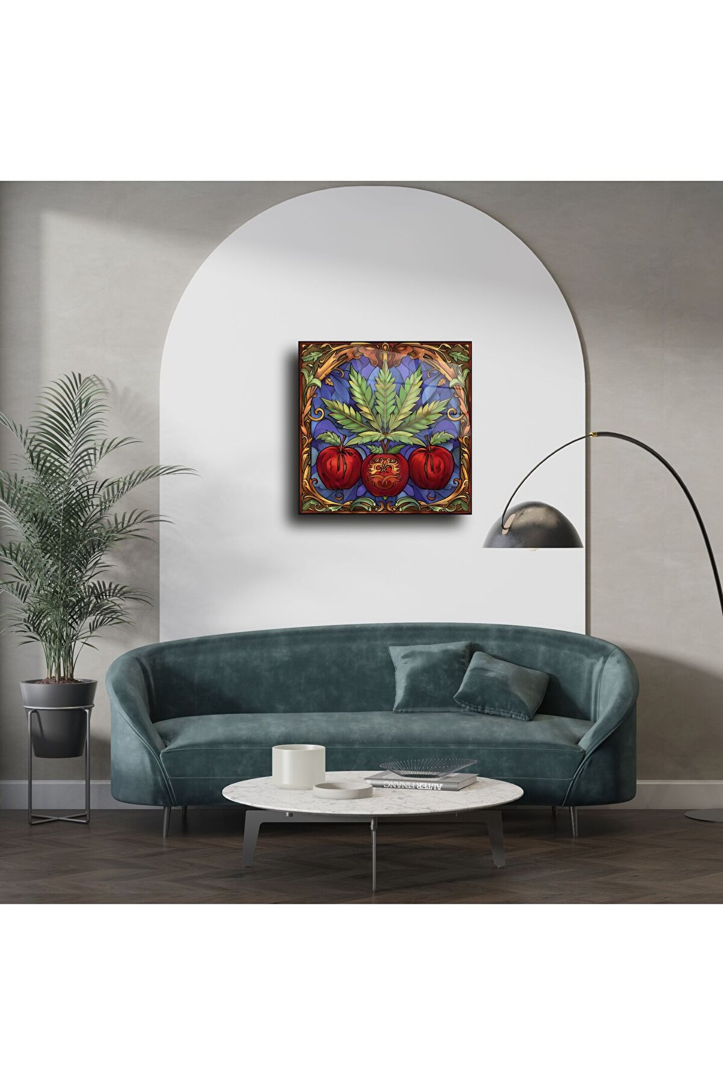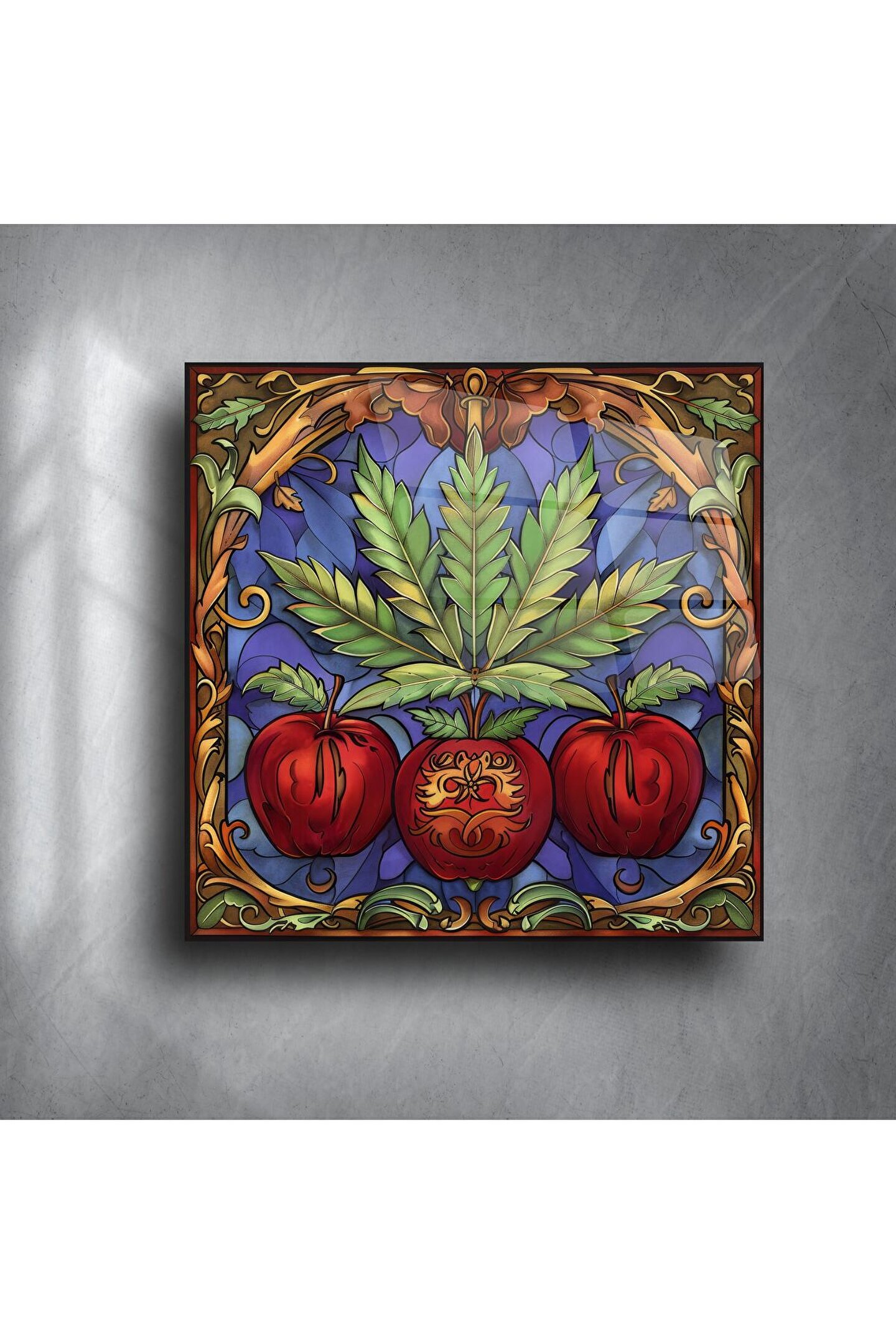 Gotik sanatın zengin detaylarını ve doğanın canlı formlarını bir araya getiren bu vitray stil cam tablo, mekânınıza sıra dışı bir karakter kazandırıyor. Elma meyvesi ve yapraklarla bezeli desenler, dramatik çerçeveyle birleşerek sanatsal bir odak noktası oluşturuyor.