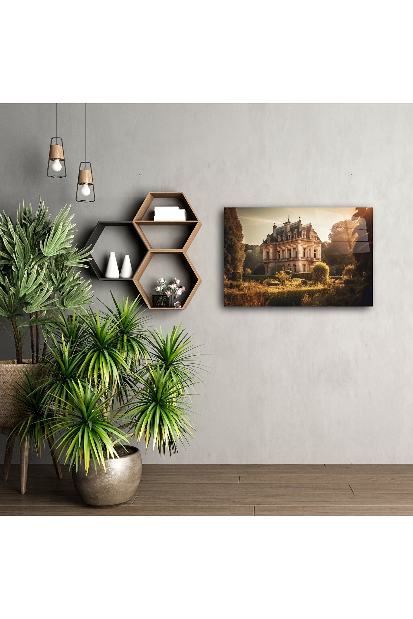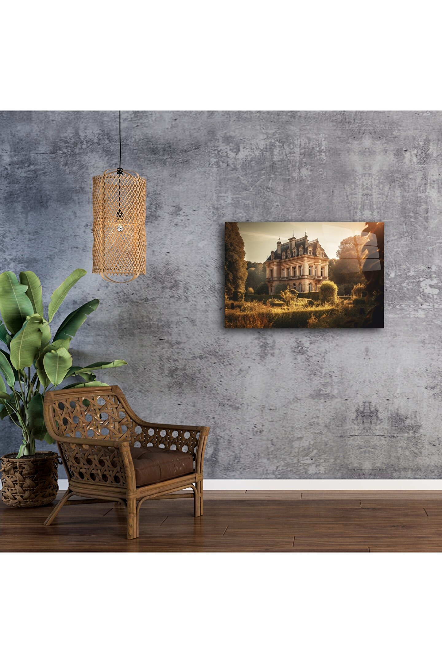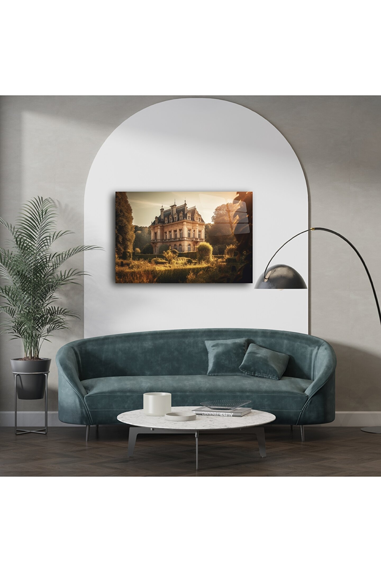 Bu etkileyici cam tablo, altın saat ışığında parlayan zarif bir Fransız malikanesini ve çevresindeki heykel gibi düzenlenmiş bahçeleri büyüleyici bir şekilde yansıtır. Klasik mimariye duyulan hayranlığı modern sanatla buluşturarak zamansız bir dekor parçası sunar.