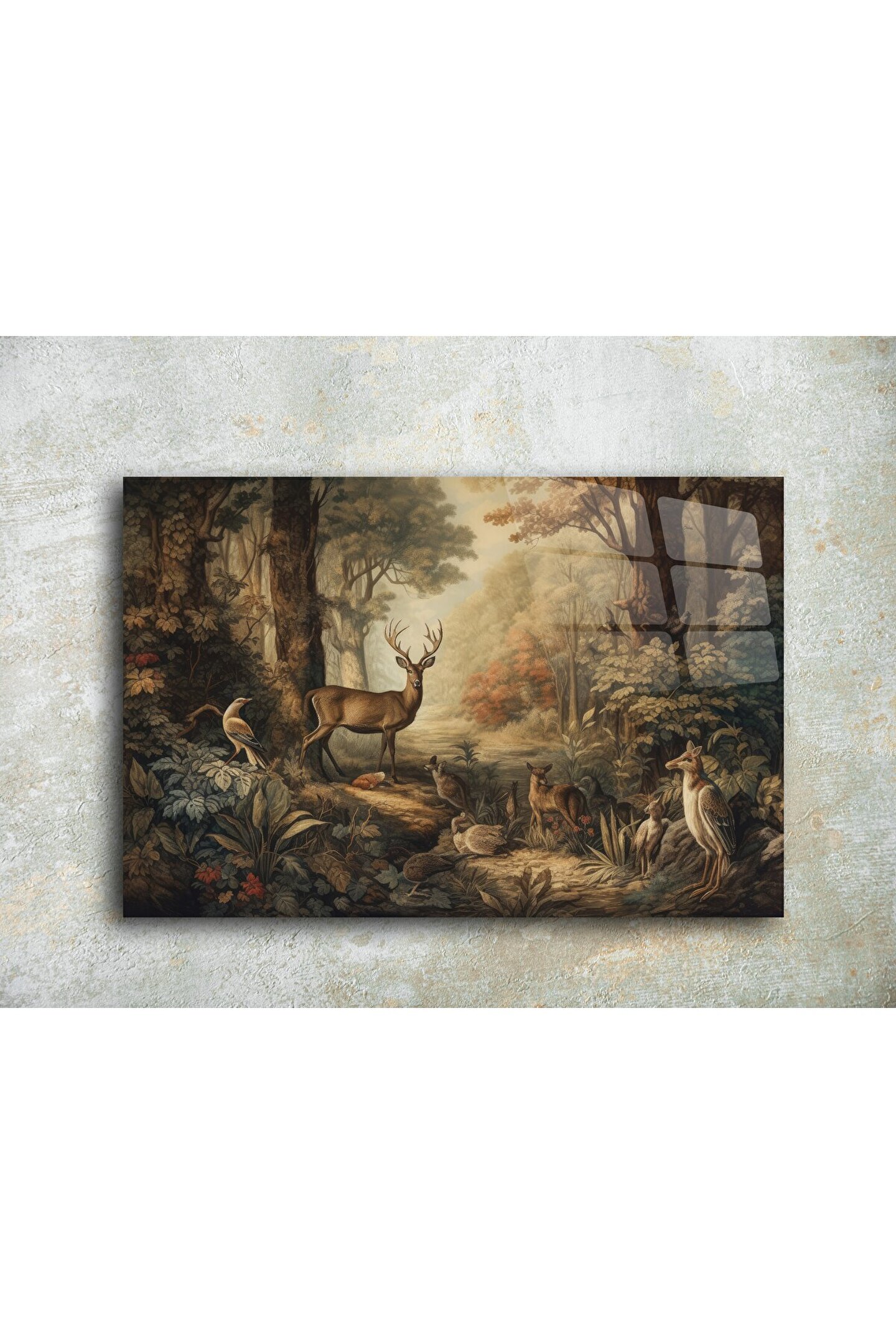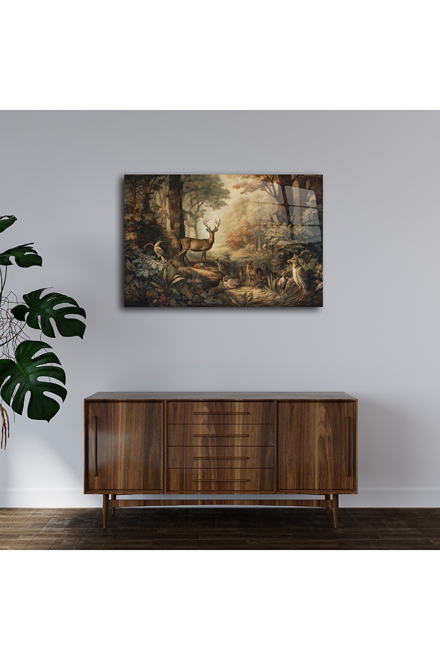 LEYLASER Geyik ve Orman Manzarası Cam Tablo Duvar Dekoru