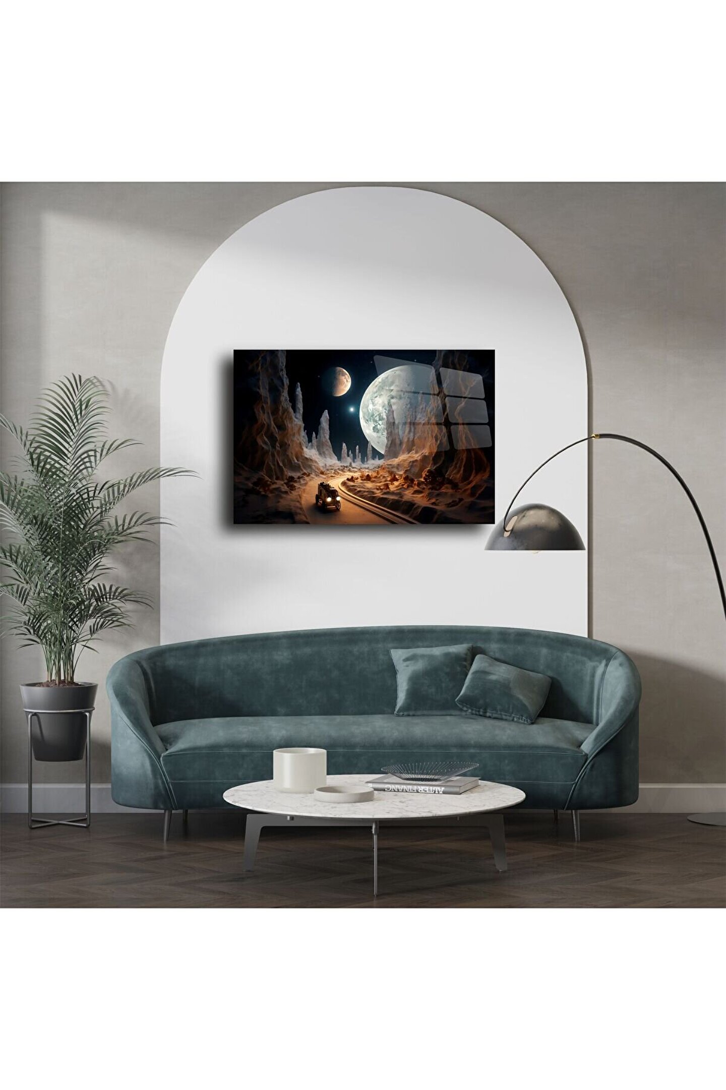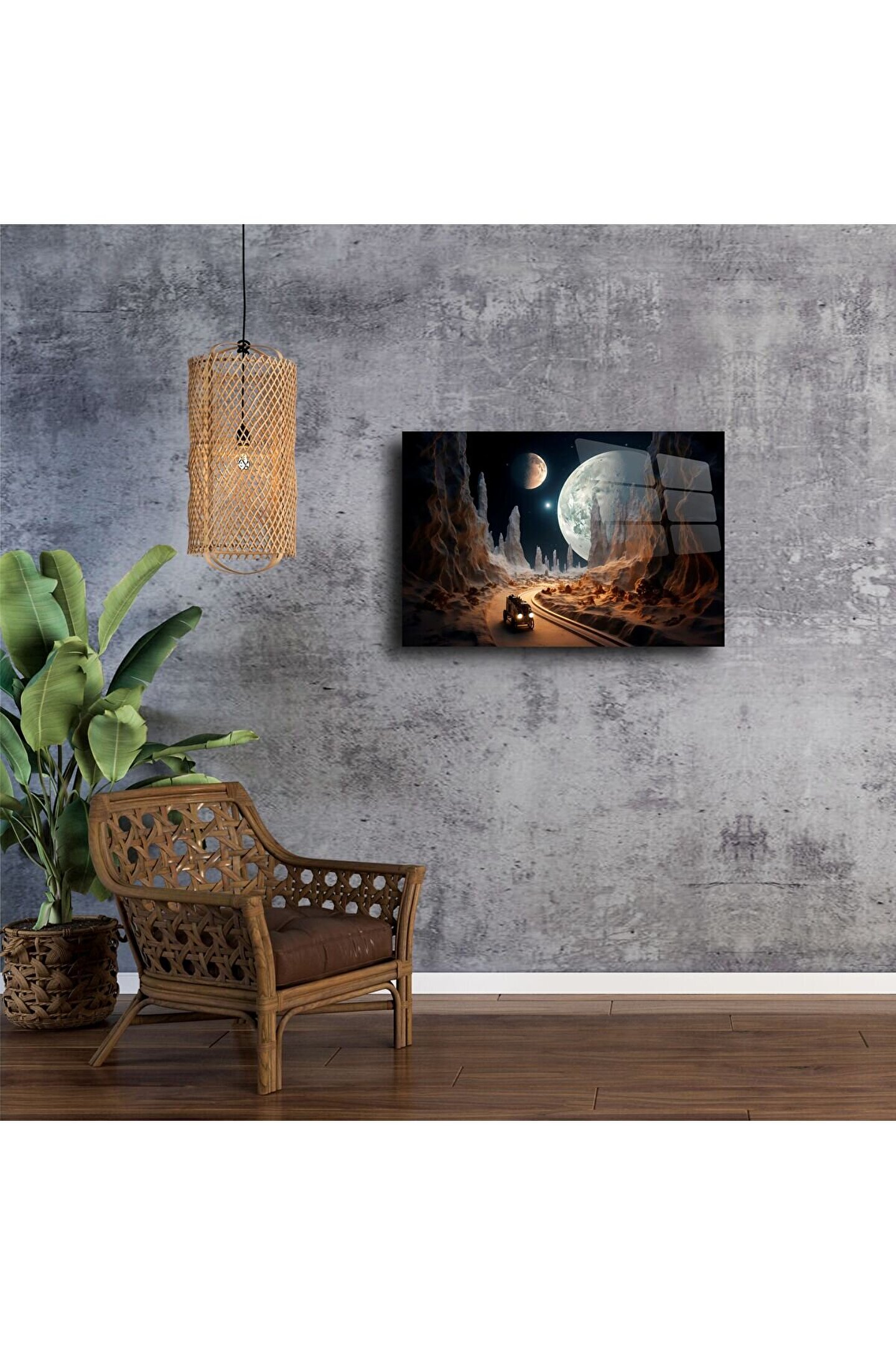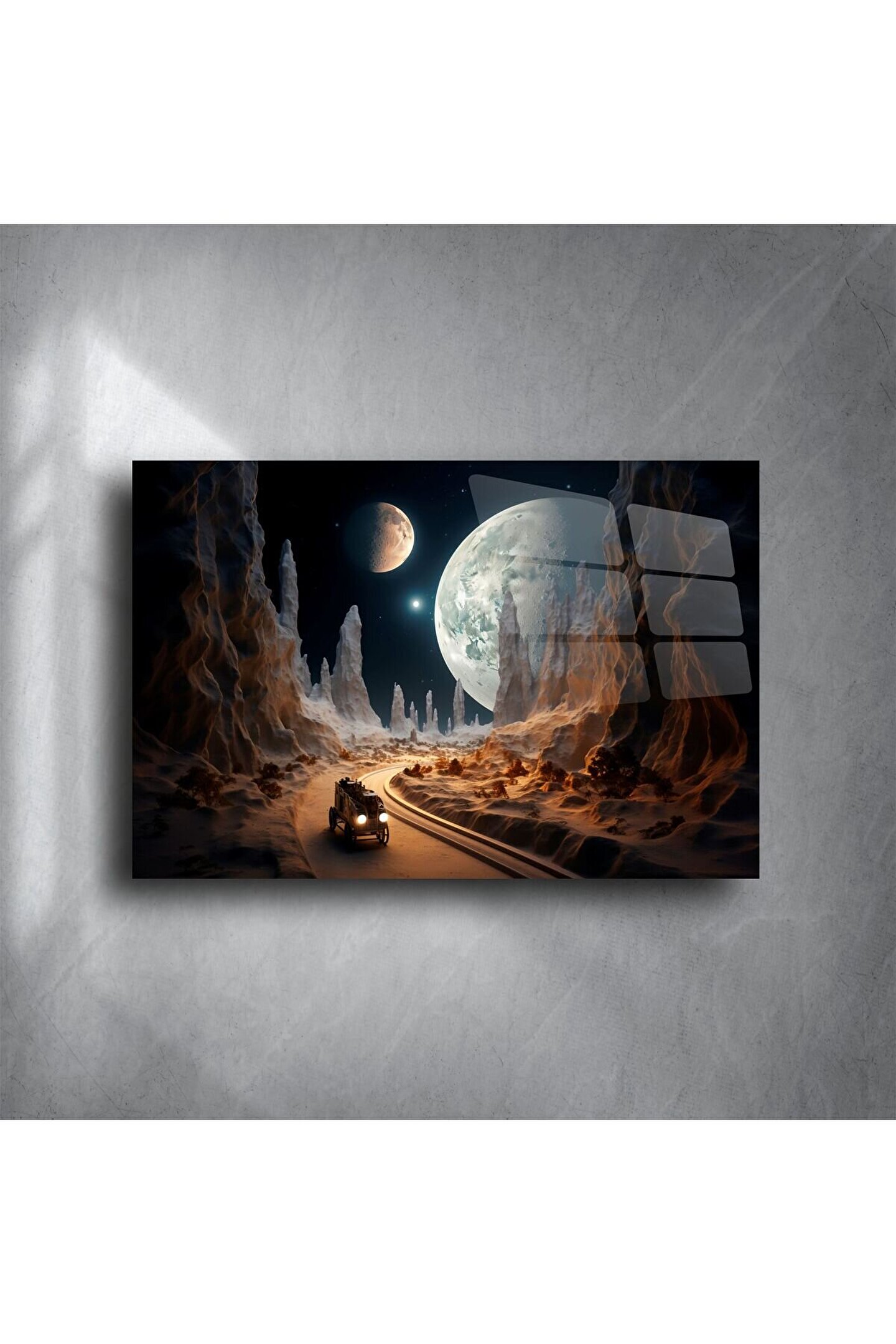 Bu etkileyici gezegen manzaralı cam tablo, hayal gücünüzü tetikleyen, zamansız bir uzay yolculuğunu yaşam alanlarınıza taşıyor. Cam yüzeyin derin parıltısı ile birleşen yüksek çözünürlüklü baskı, her detayı göz alıcı bir netlikte sunar. Uzaydaki gizemi ve sonsuzluğu evinize getirerek, sıradan bir duvarı sanat eserine dönüştürür.