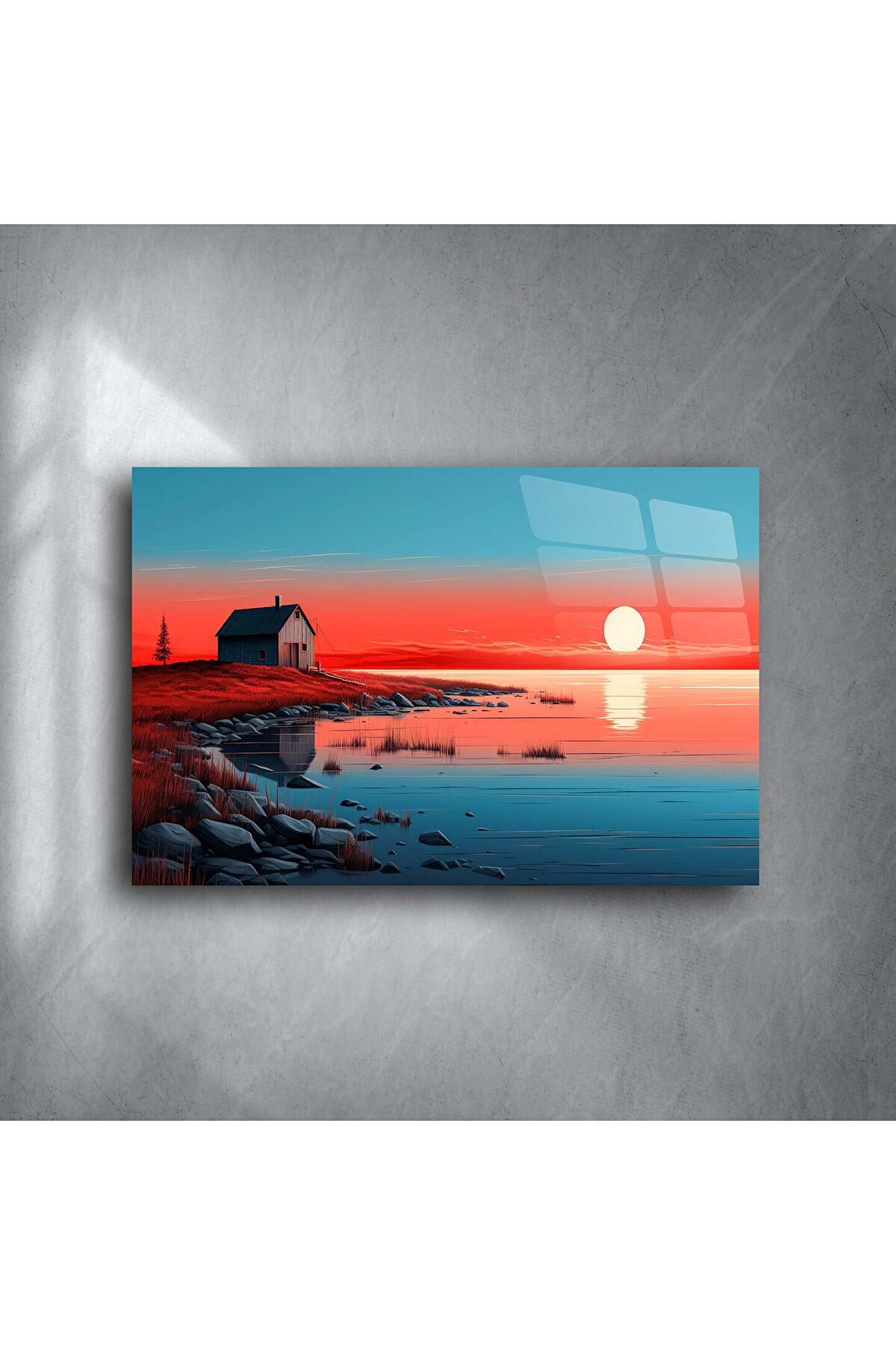 "Sunset lakehouse wall art" aramasında öne çıkan bu minimalist cam tablo, gün batımının huzurunu evinize getirir. Canlı kırmızı ve sakin mavi tonlarıyla izleyene dinginlik sunar, modern çizgileriyle her yaşam alanına zarafet katar.