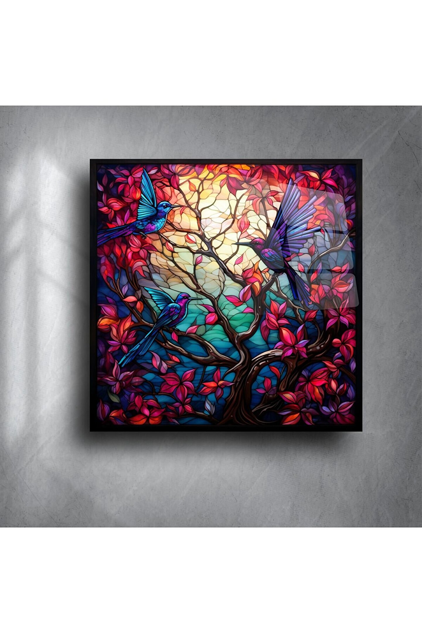 Bu sadece bir duvar süsü değil — aynı zamanda hareketin, yaşamın ve dinginliğin kutlamasıdır. Cesur kırmızı ve mor yapraklar, uçuş halindeki zarif hummingbird figürleriyle birleşerek özgürlüğü ve canlı yaşamı simgeliyor.