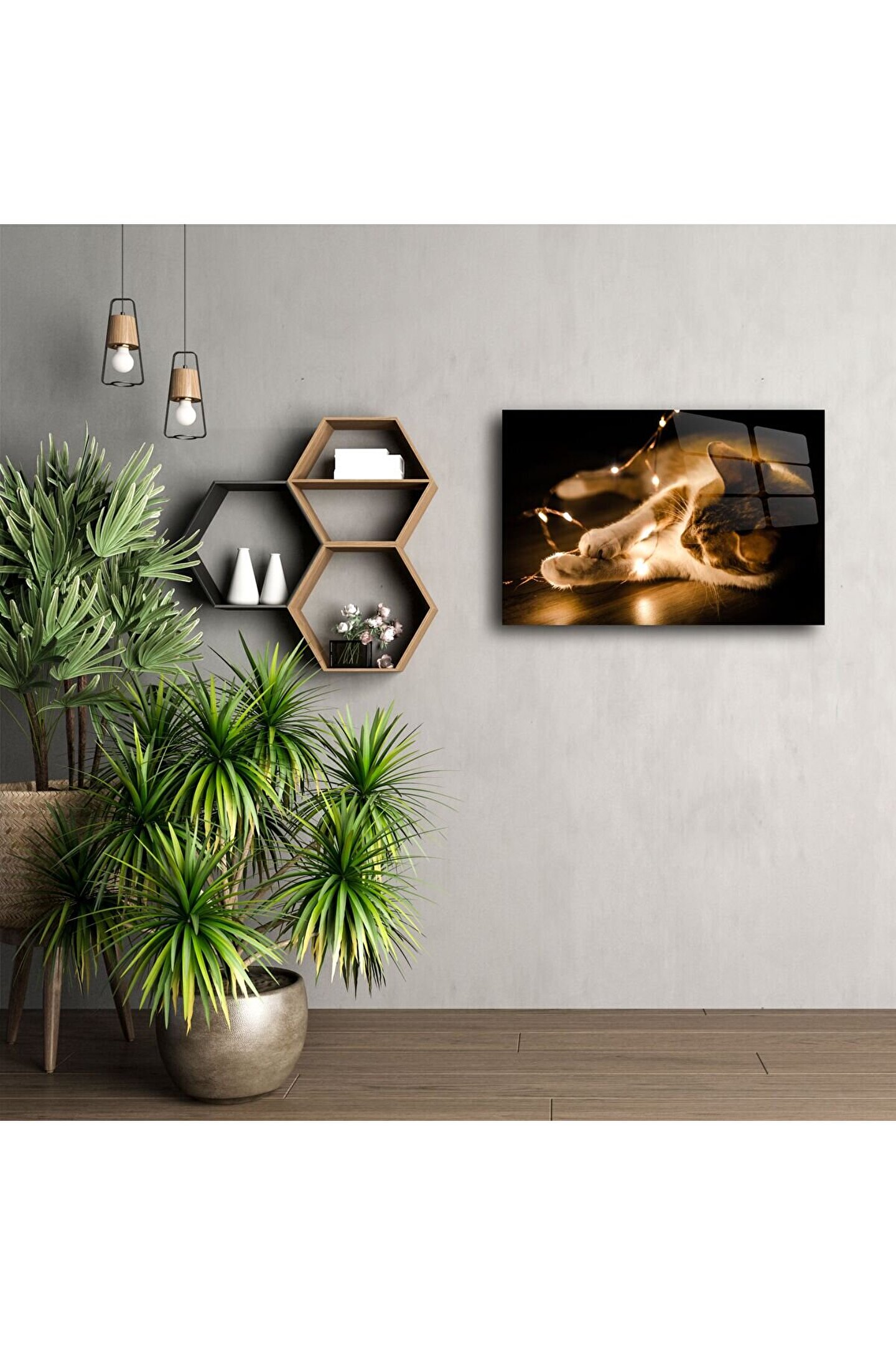 Bu ışıklarla oynayan kedi temalı cam tablo, gecenin sıcaklığı ve sevimliliğiyle buluştuğu anı yakalıyor. Parlak LED ışıkların kedinin tüylerinde yumuşak şekilde yansıdığı bu sahne, yüksek kaliteli temperli camüzerine yüksek çözünürlüklü ve canlı baskıyla sunulmuştur.