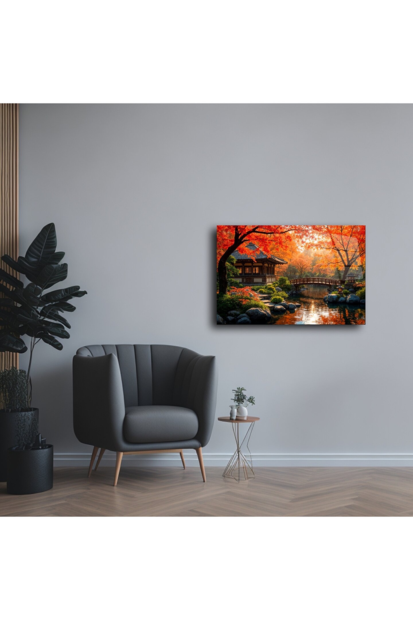 Bu büyüleyici Japon bahçesi cam tablo, doğu felsefesinin dinginliğini ve estetiğini evinize taşıyor. Parlak kırmızı akçaağaç yaprakları, taş köprü ve geleneksel tapınak detaylarıyla çevrili bu manzara, huzurun ve zarafetin kusursuz bir birleşimini sunar.
