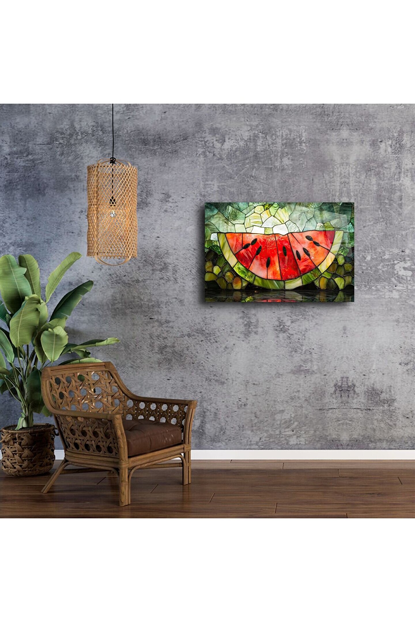 Yazın tazeliğini ve neşesini duvarlarınıza taşıyan bu Karpuz Dilimi temalı vitray cam tablo, yeşilin ve kırmızının canlı tonlarıyla ortama doğal bir ferahlık katıyor. Gerçek cam üzerine vitray etkili baskısıyla yazlık evlerin vazgeçilmez dekoratif parçası olmaya aday.