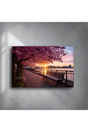 LEYLASER Kiraz Çiçeği Gün Batımı Park Bankı Kanvas Tablo