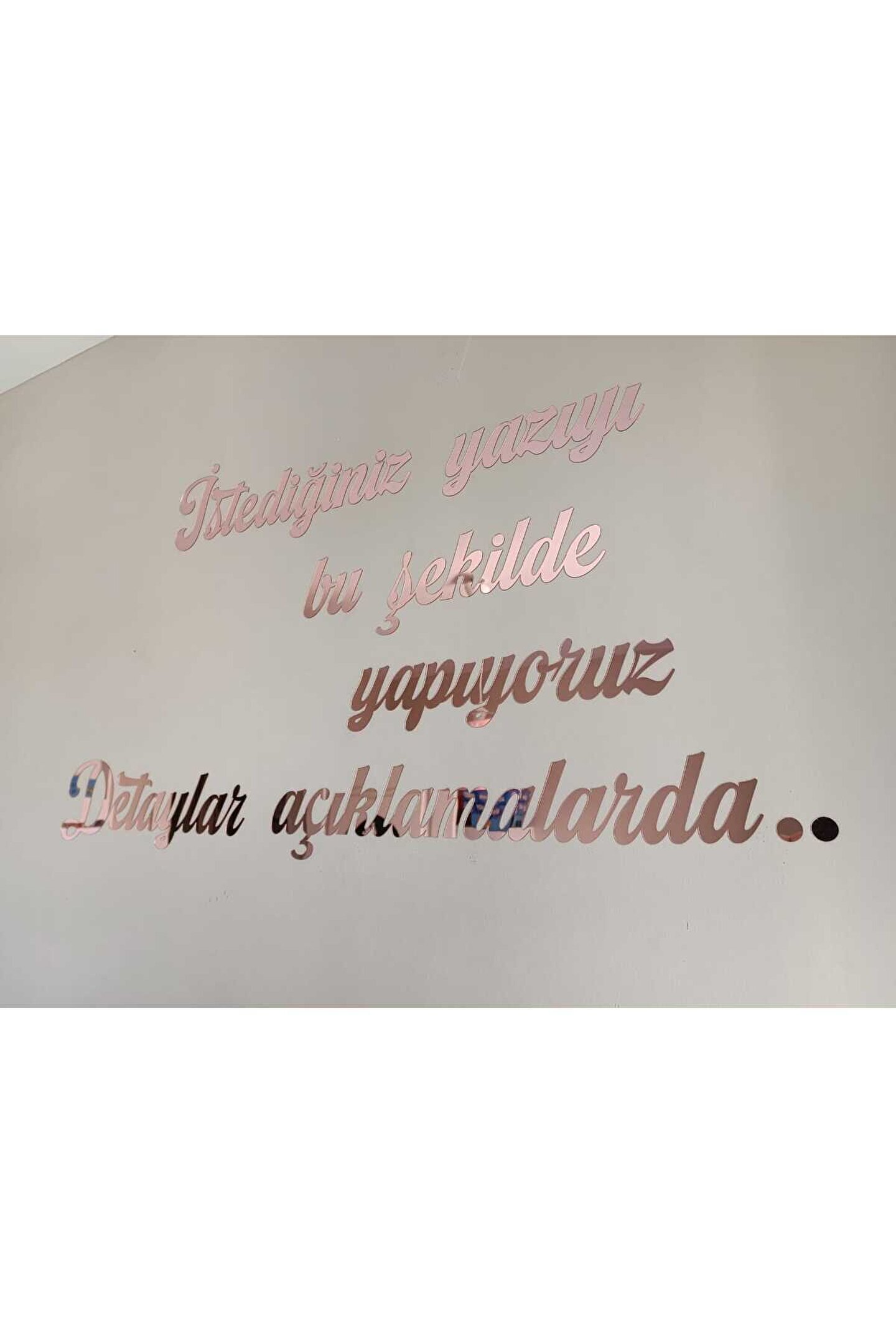Ürünümüz 50 harf için geçerlidir.; Her 50 harfte 1 ürün almalısınız.; Küçük harfleri 1, Büyük harfleri de 3 saymalısınız.; Harf ölçüleri standarttır.; ölçüler ikinci resimde verilmiştir.; Ürünü satın aldıktan sonra ürün sorularından önce sipariş numaranızı ardından da yazdırmak istediğiniz yazıyı yazdırabilirsiniz.; Hiçbirşey belirtmezseniz resimdeki yazı stili ile gönderilir.; ama yazı tipini değiştirmek istiyorsanız lütfen bize ulaşın.; istediğiniz yazı tipi ismini belirtirseniz yardımcı oluruz.; FARKLI ÖLÇÜ VE EBATLAR İÇİN LÜTFEN BİZE ULAŞINIZ.; MARKA İSMİMİZİ İNTERNETTE ARATINCA İLETİŞİM BİLGİLERİMİZE ULAŞABİLİRSİNİZ.; İster kendi kelimeleriniz ister beğendiğiniz bir söz yada size ait bir şiiir olsun duvarınızda ya da bütün düz zeminlerde kullanabileceğiniz duvar yazınızı bize bildirin biz üretelim Hiçkimsede olmayan duvar dekorunuz olsun Size özel duvar yazınız ayağınıza gelsin :) 1 mm ROSE GOLD renk kendinden yapışkanlı aynalı pleksi malzeme ile Leylaser tarafından üretilmiştir.; Direk bantın korumasını çıkartıp duvara monte edebilirsiniz.; ; Her kelime ayrı bir parça olarak gelecektir.; ; İstediğiniz şekilde kombin edebilirsiniz.; ; Yazdırmak istediğiniz metni satıcı sorularından ya da ürün sorularından sipariş numaranızla birlikte bildirebilirsiniz.; ; Yazdırmak istediğiniz metinde yer alan harf sayısına göre fiyatlandırma yapılmaktadır.