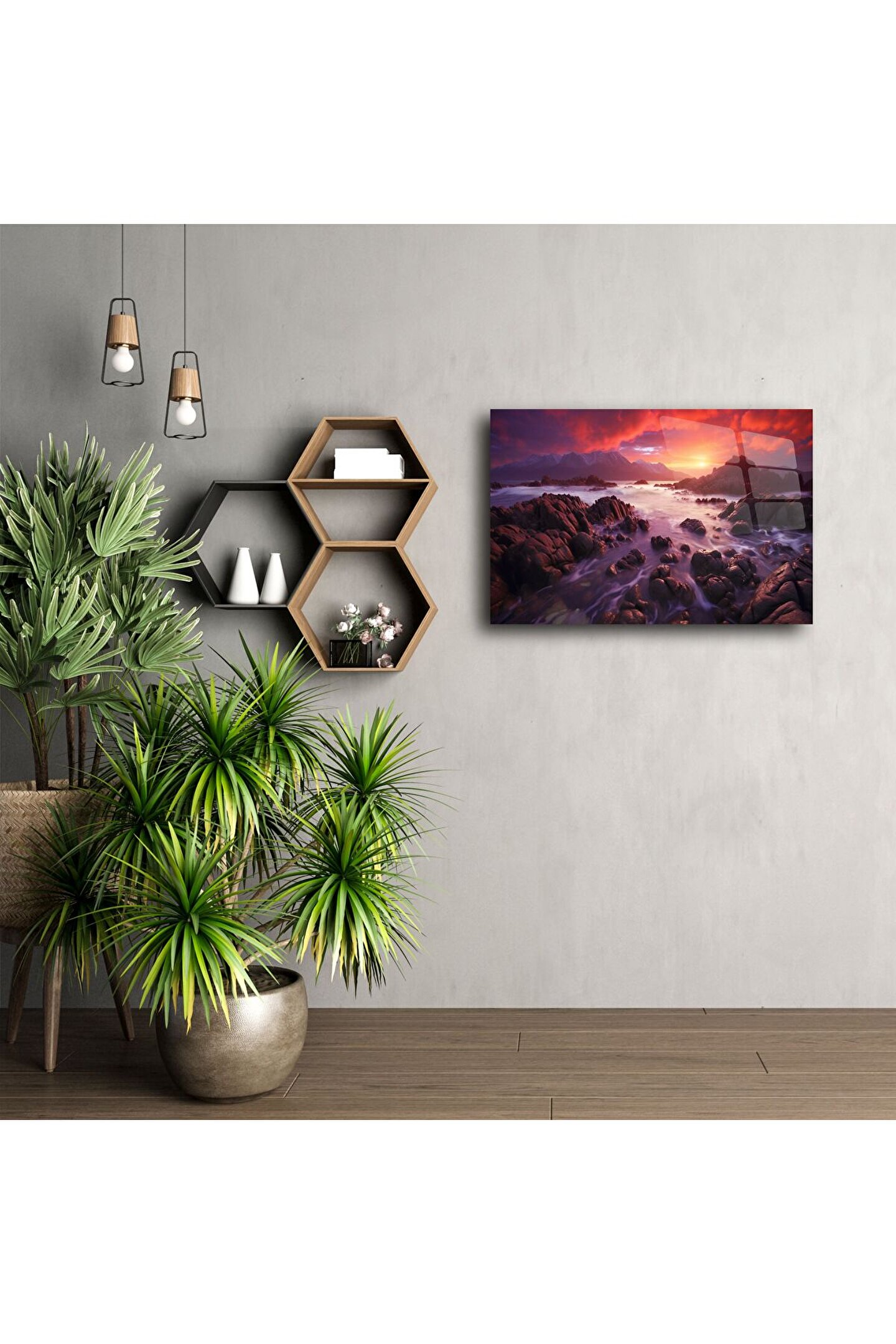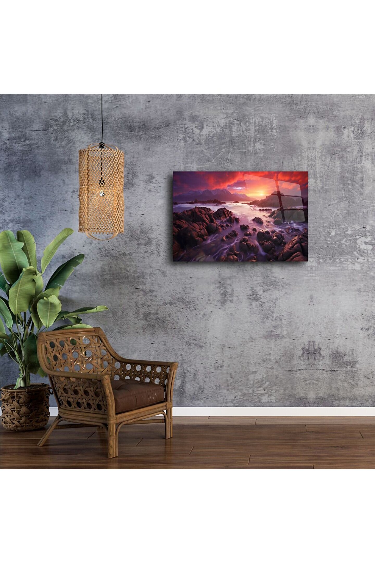 Günün en büyülü anını yansıtan bu kızıl gün batımı manzaralı cam tablo, evinizin duvarlarına güçlü bir doğa hikayesi katıyor. Sularla şekillenmiş kayalıklar ve arka planda uzanan dağ silueti, izleyenlere huzur ve hayranlık duygularını aynı anda yaşatıyor.