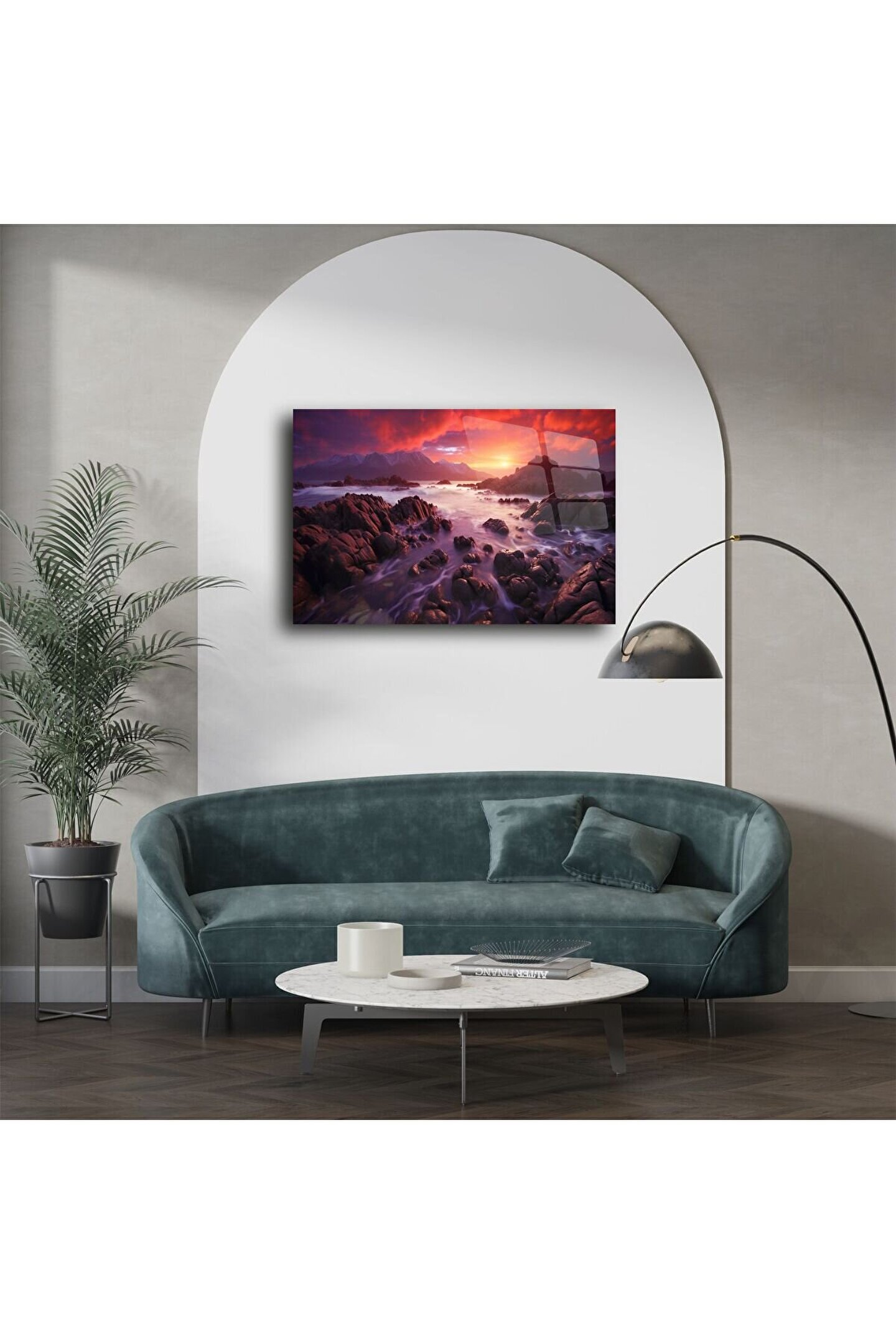 Günün en büyülü anını yansıtan bu kızıl gün batımı manzaralı cam tablo, evinizin duvarlarına güçlü bir doğa hikayesi katıyor. Sularla şekillenmiş kayalıklar ve arka planda uzanan dağ silueti, izleyenlere huzur ve hayranlık duygularını aynı anda yaşatıyor.