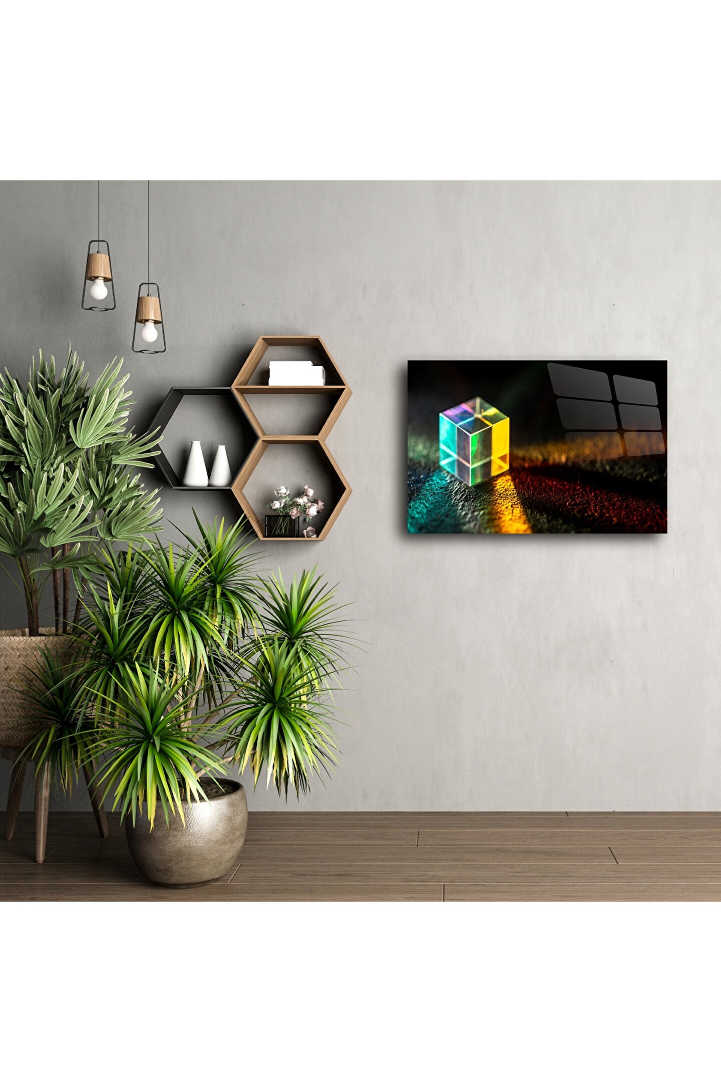 Modern zarafeti mekânınıza taşıyan bu cam prizma küp duvar sanatı, ışığın, geometrinin ve sanatsal netliğin parıldayan bir kutlamasıdır. Kristalden yayılan canlı spektrum, dokulu yüzeyde yankılanarak hayranlık ve huzur hissi yaratır – meditasyon köşeleri ve yaratıcı alanlar için idealdir.