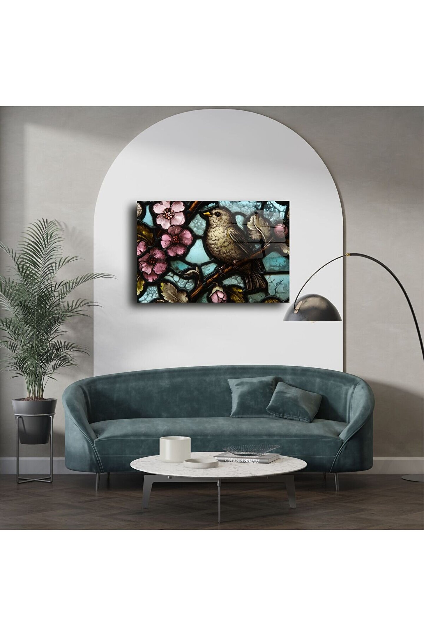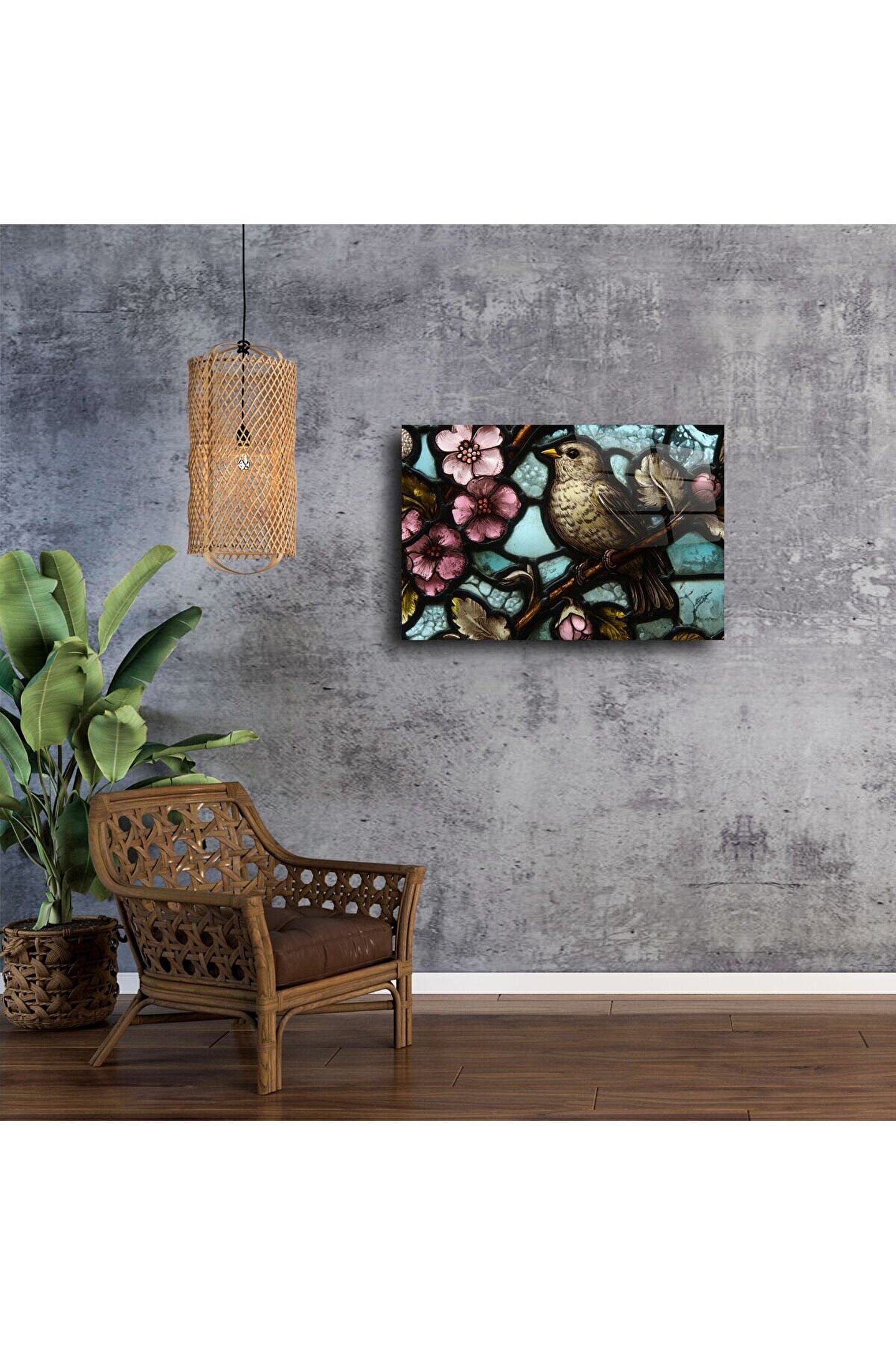 Bu kuş ve çiçek temalı cam tablo, pastel tonlardaki vitray efektiyle ilkbaharın hafifliğini duvarlarınıza taşır. Zarif kuş figürü ve narin çiçek dokuları, doğayı sevenler için huzur dolu bir atmosfer yaratır.