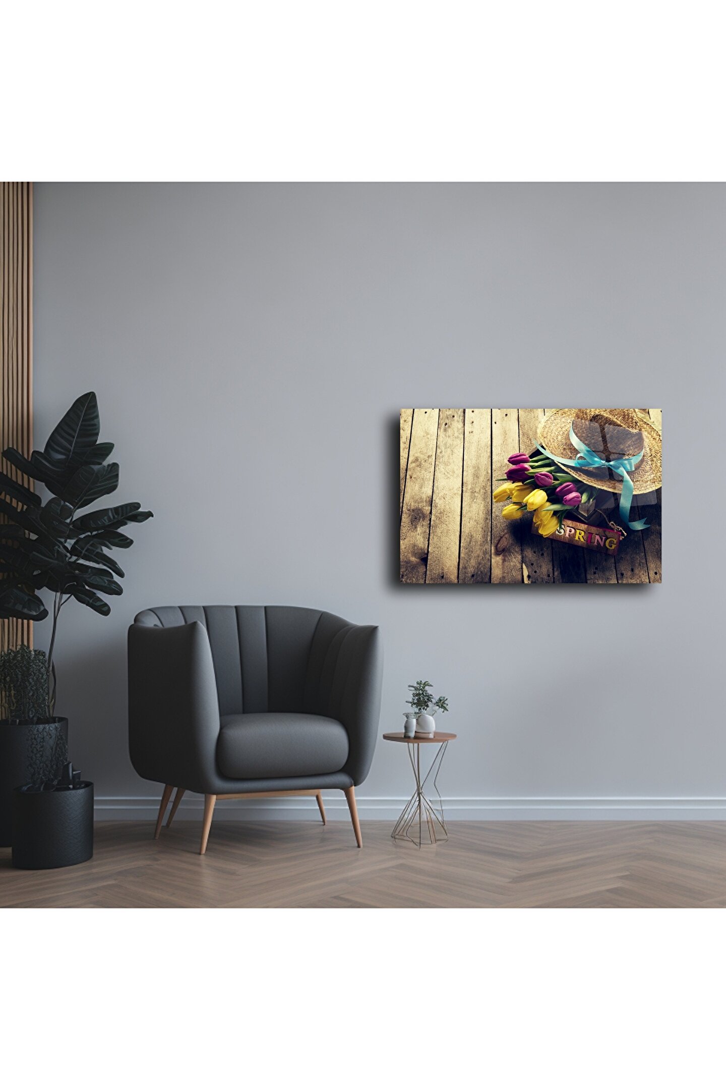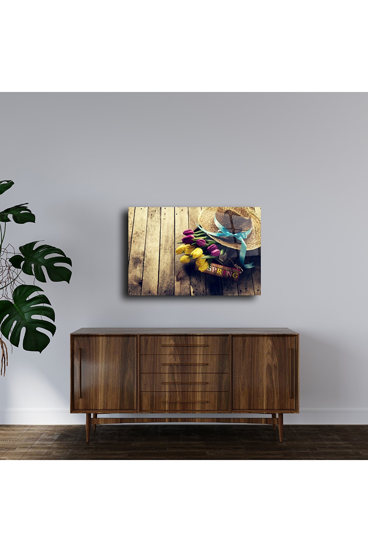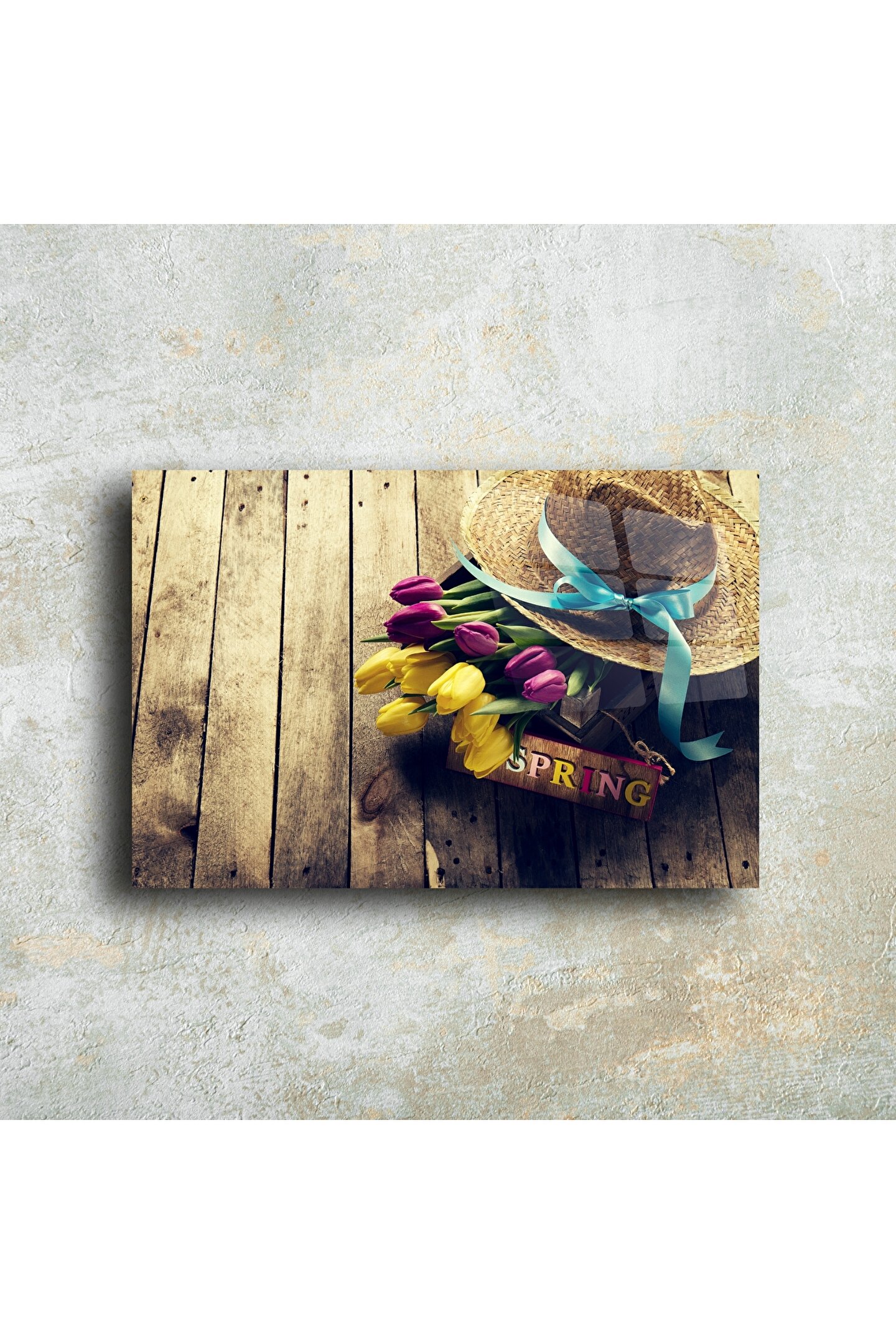 Baharın gelişini en sıcak haliyle anlatan bu cam tablo, mor ve sarı laleler, mavi kurdeleli hasır şapka ve vintage ahşap zemin dokusuyla iç açıcı bir kompozisyon sunar. Üzerindeki “Spring” yazısıyla mevsim geçişlerini evinizde hissettirirken, nostaljik havası ile yaşam alanlarınıza samimi bir dokunuş kazandırır.