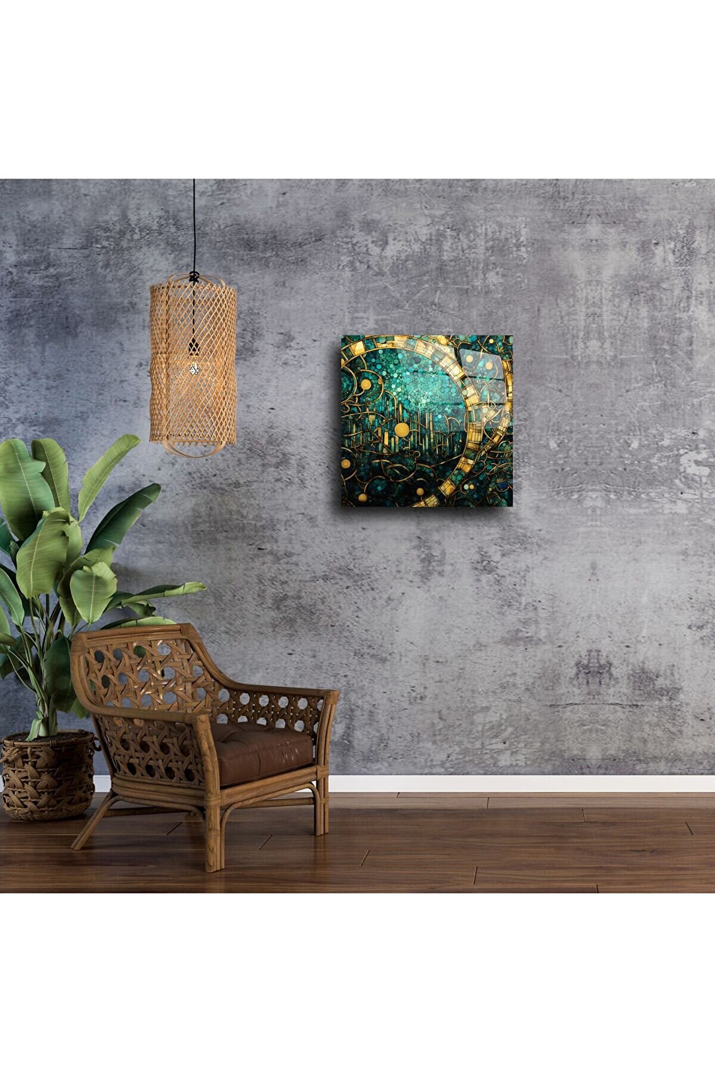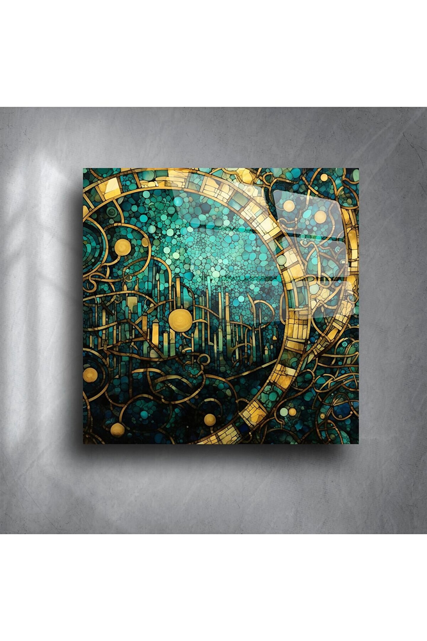 Parıltılı cam efektiyle işlenmiş bu modern cam mozaik tablo, zümrüt yeşili ve altın tonlarının zarif dansını sunar. Geometrik soyut tasarımı, her bakışta yeni detaylar keşfetmenizi sağlar. El işçiliği hissi veren mozaik görünümüyle evinize sofistike bir atmosfer kazandırır.